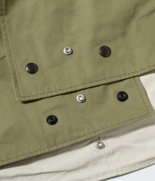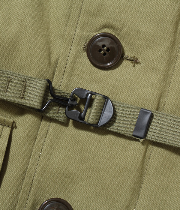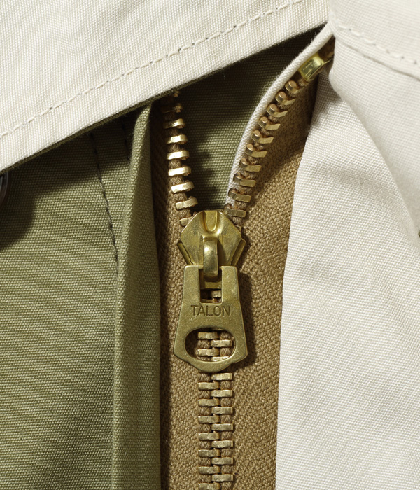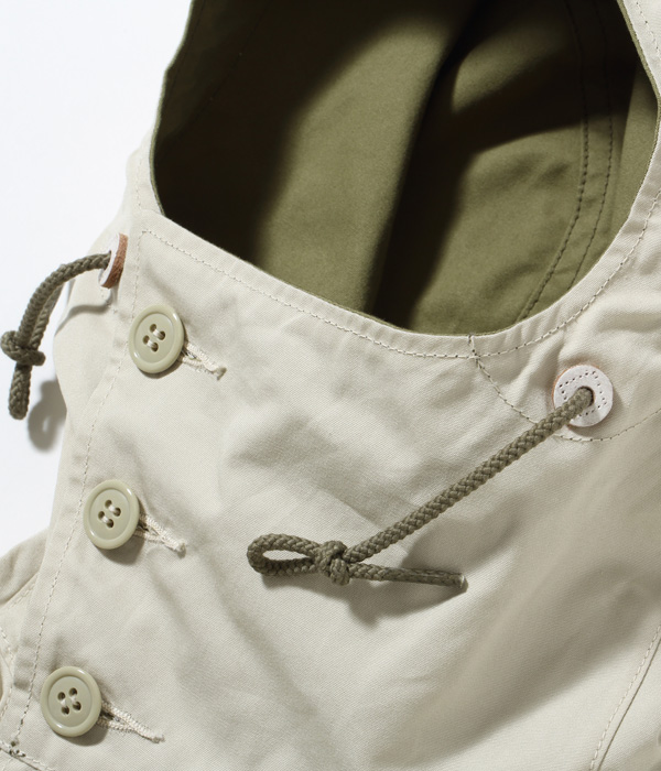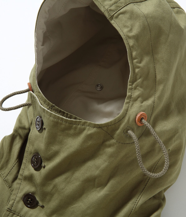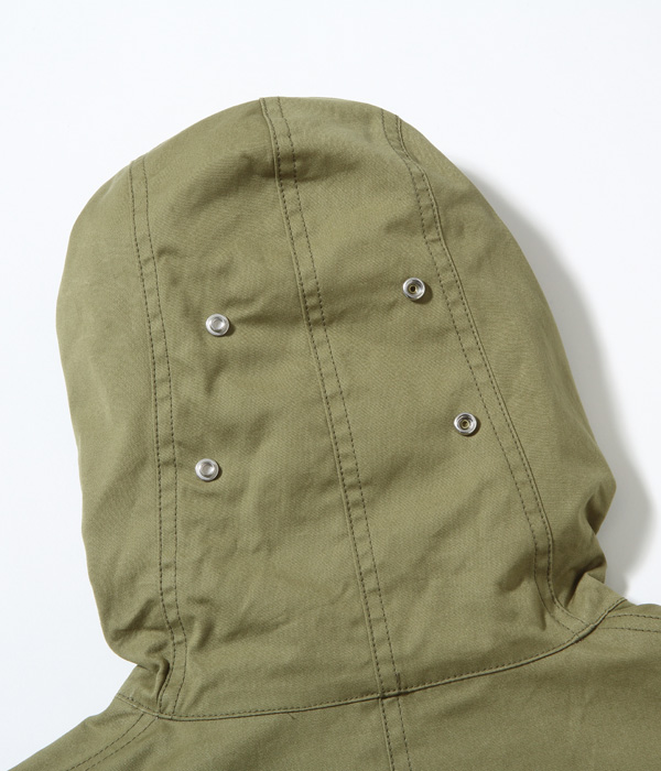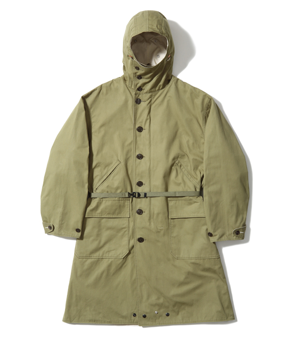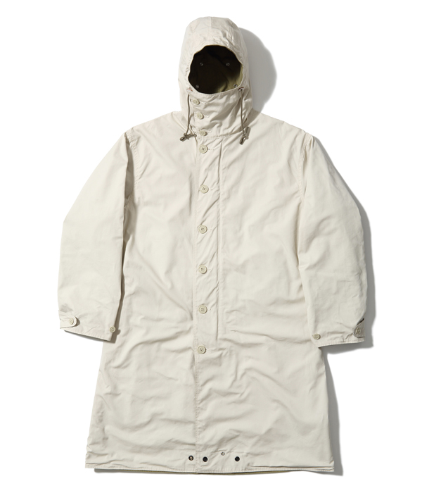 The M-42 parka, as it is commonly known, is a reversible overcoat adopted by the US Army in 1942. In normal field battles, the olive drab side was worn for its high camouflage effect, but under snowy mountain conditions, it was worn on the white side facing out. Because it is reversible, the fabric is fully lined with two layers of fabric, and because it is long and has a hood, it is a luxurious coat that uses a lot of fabric. The hooded placket can be closed to the top to cover half of the face for protection from wind and cold. The olive side has slash pockets with hand warmers on both sides and large patch pockets with flaps, while the white side, which is not often worn, is plain. A belt is attached to the waist for a better fit, and the snap buttons at the bottom of the hem close back and forth under the inseam to prevent wind from entering and increase warmth. The M-42 parka, which established the basic model for a hooded overcoat, was later succeeded by the M-47 parka.