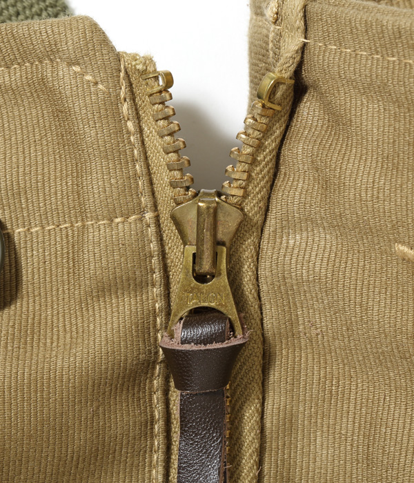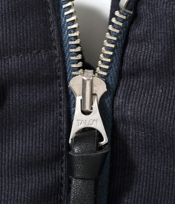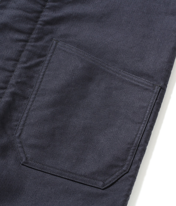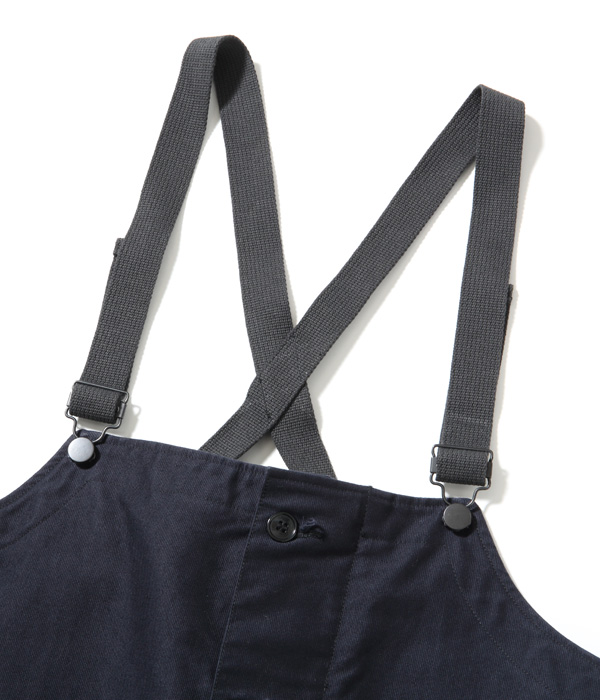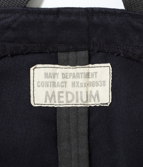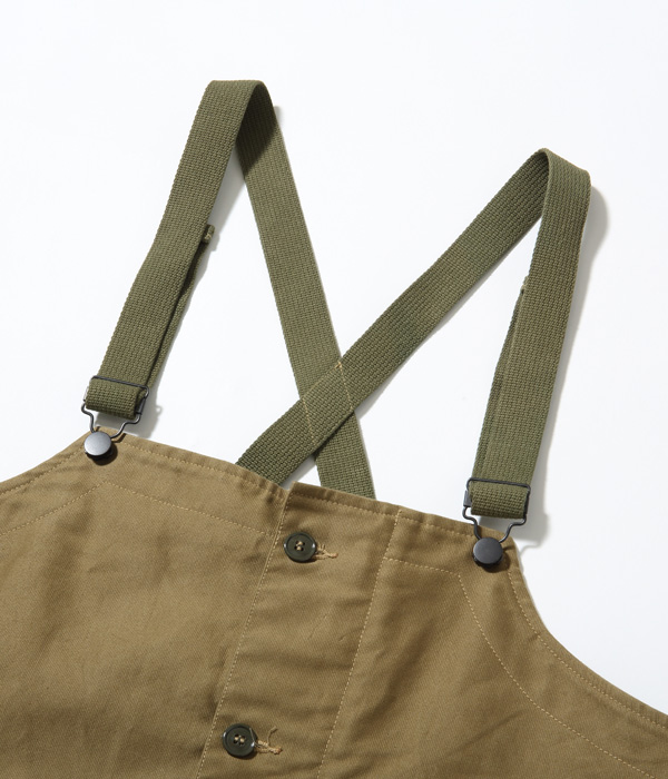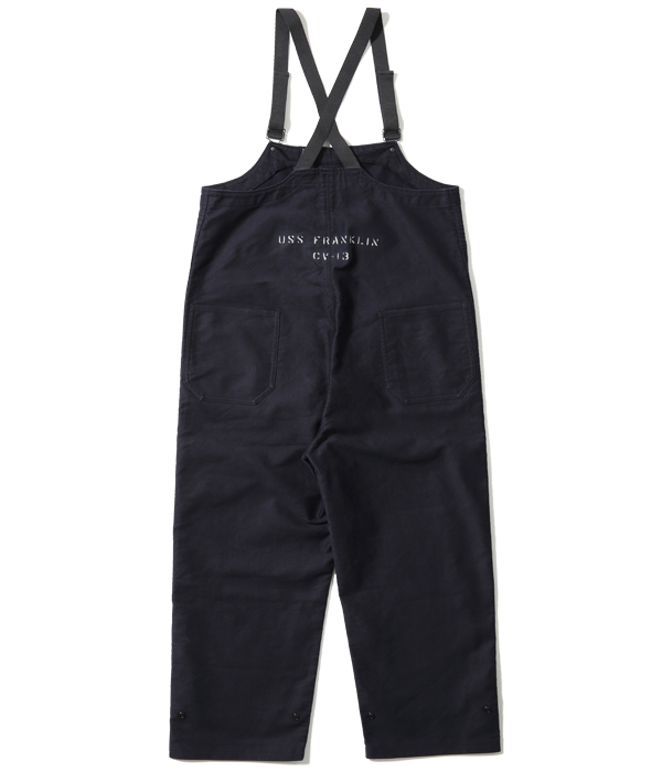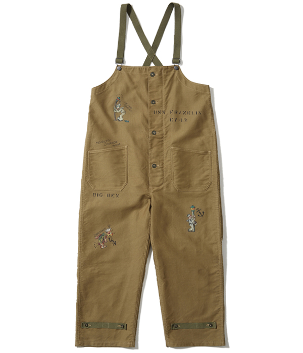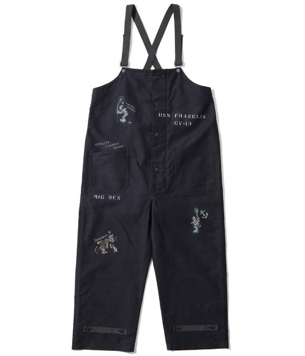第2次大戦時からデッキジャケットとセットアップで着用されたデッキパンツ。当時のデッキパンツにはウールフランネルのライニングが付く仕様であったが、このパンツはライニングを排除し、モディファイしている。生地をふんだんに使用し、オーバーオール型で面積の広いデッキパンツは、絵心のある兵士にとって格好のキャンバスとなった。手描きされたコミカルなイラストは、航空母艦フランクリンの乗員によるもの。