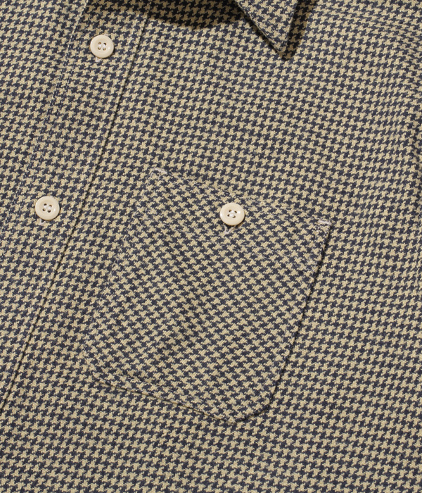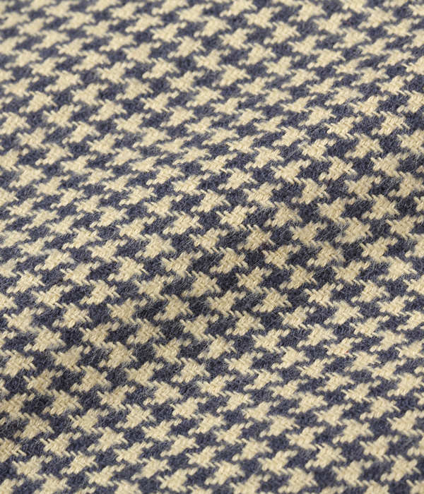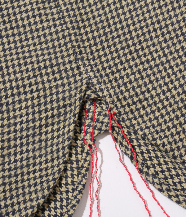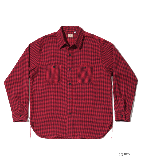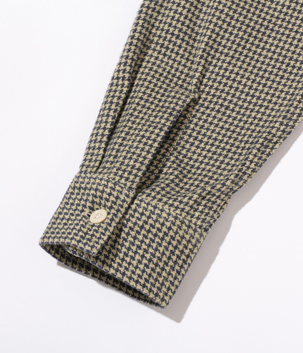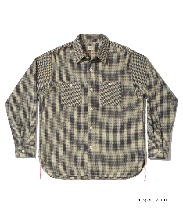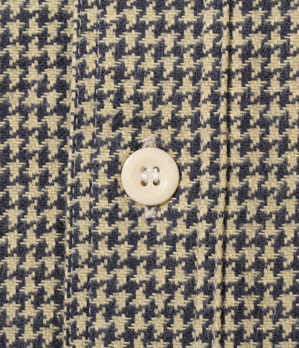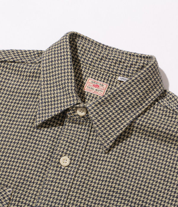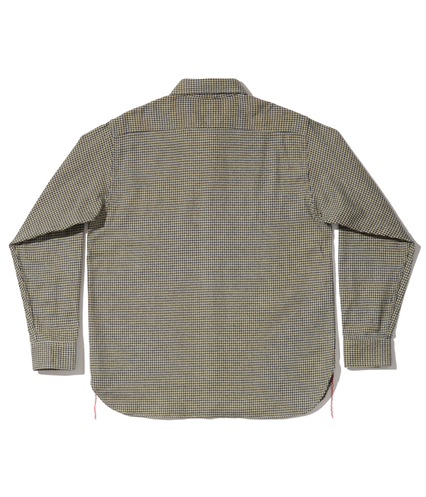 シュガーケーンが資料として保管するヴィンテージをベースに、2本針巻き縫いの縫製や各部の仕様など、1950~60年代のディテールを再現した王道的なチェックシャツ。1960年代のWASHINGTON ”DEE CEE” のシャツから起こした千鳥格子で、昨年よりもひとまわり小さい格子をピックアップした。やや退色した部分から色出しを行っている。経糸に20番手双糸、緯糸に10番手単糸を使い、糸の打ち込みをしっかりと入れたハリのあるツイル生地を使用。