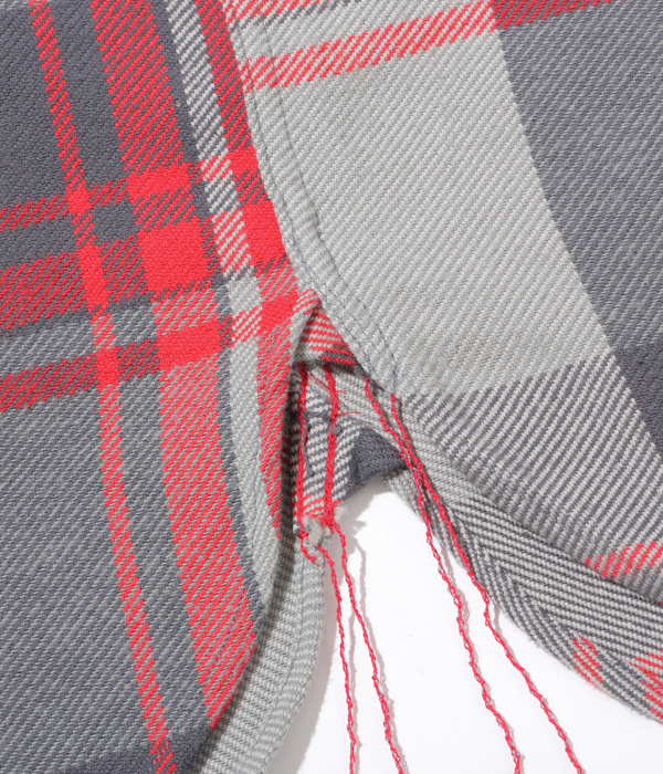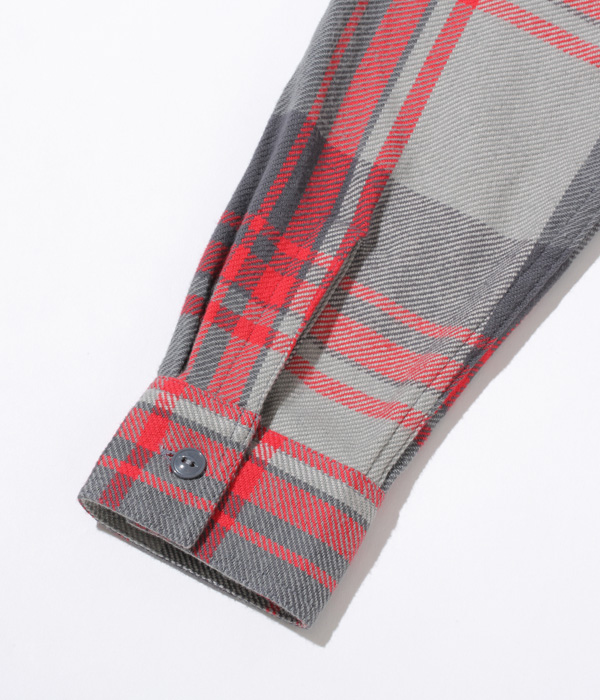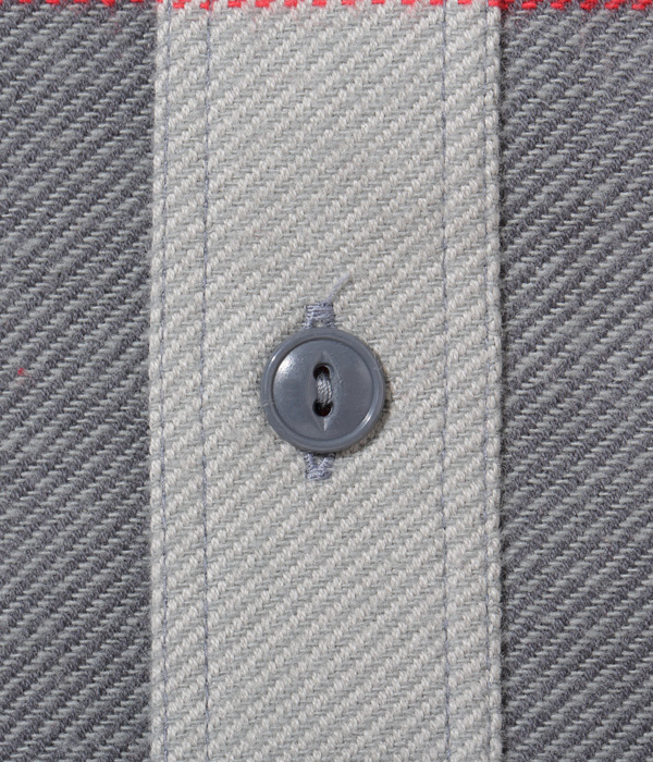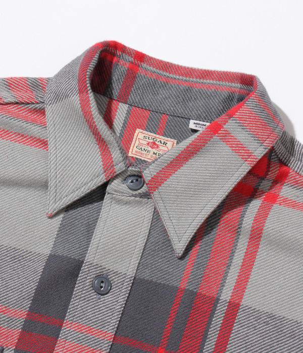 シュガーケーンが資料として保管するヴィンテージをベースに、2本針巻き縫いの縫製や各部の仕様など、1950~60年代のディテールを再現した王道的なチェックシャツ。1980年代のJ.C.Penney / BIG MAC のシャツから起こした大柄のチェックは経3色×緯3色構成で、カラーによって異なる雰囲気に仕上がっている。経糸に20番手双糸、緯糸に10番手単糸を使い、糸の打ち込みをしっかりと入れたハリのあるツイル生地を使用。