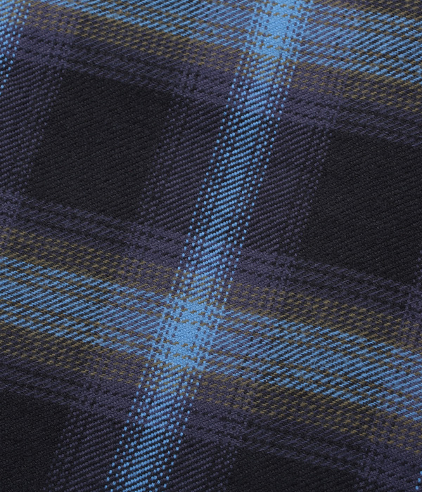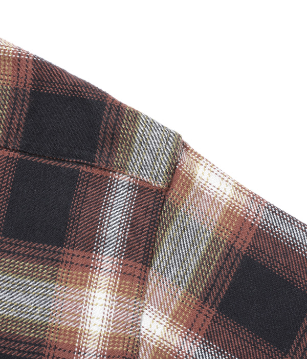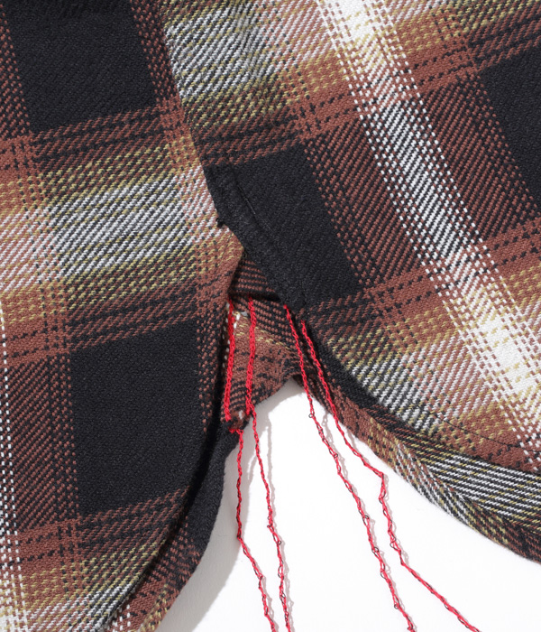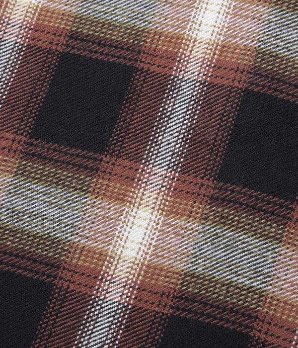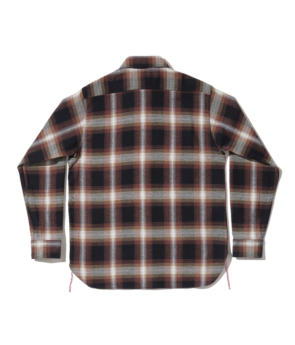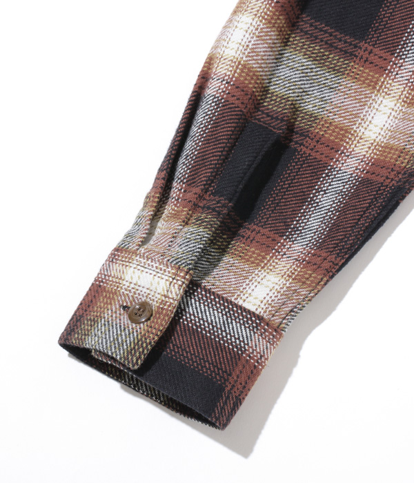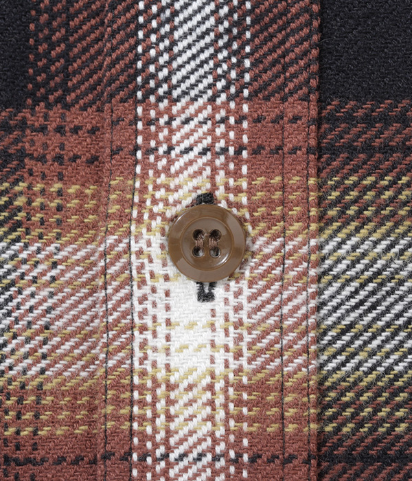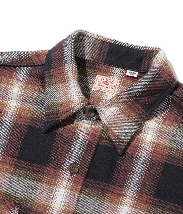 シュガーケーンが資料として保管するヴィンテージをベースに、2本針巻き縫いの縫製や各部の仕様など、1950~60年代のディテールを再現した王道的なチェックシャツ。1960年代のPENDLETONやJ.C.Penney / TOWN CRAFTのシャツから起こした経3色×緯4色のオンブレーチェックで、ヴィンテージのウールやレーヨンの深い色目をコットンで再現している。経糸に20番手双糸、緯糸に10番手単糸を使い、糸の打ち込みをしっかりと入れたハリのあるツイル生地を使用。