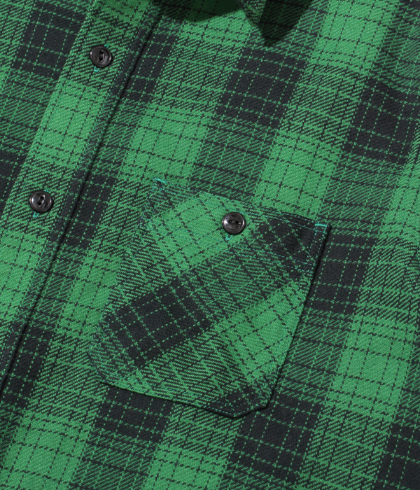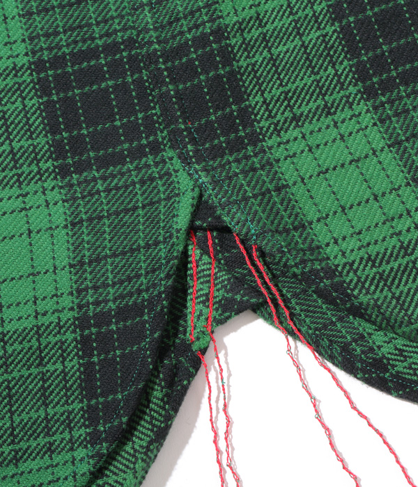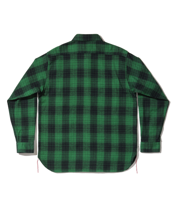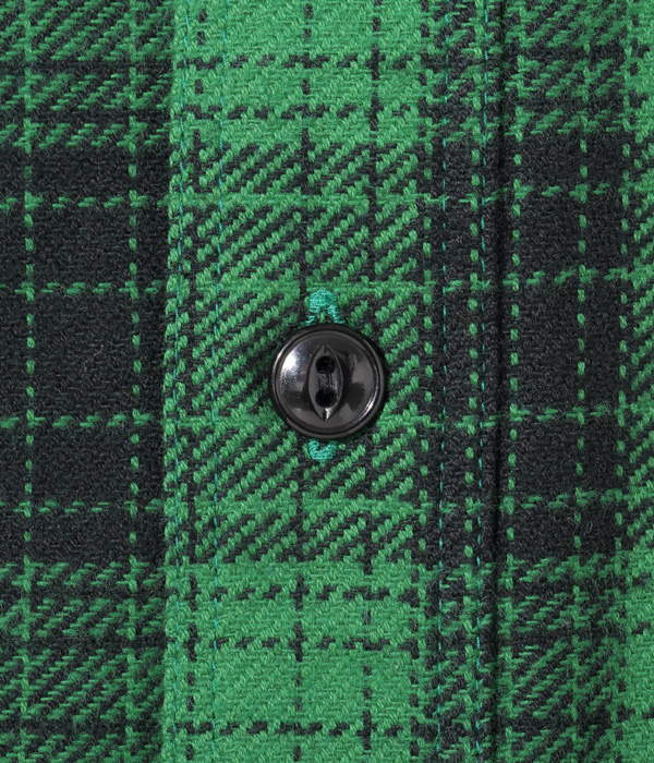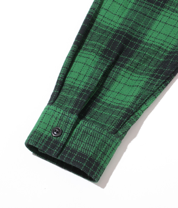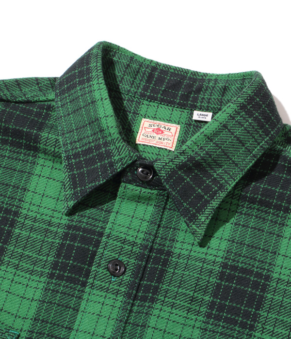 シュガーケーンが資料として保管するヴィンテージをベースに、2本針巻き縫いの縫製や各部の仕様など、1950~60年代のディテールを再現した王道的なチェックシャツ。1960年代のSEARS / PILGRIMのシャツから起こした経2色×緯2色構成で、使い込まれたシャツから色出しを行うことで、着始めから馴染んだ仕上がりに。経糸に20番手双糸、緯糸に10番手単糸を使い、糸の打ち込みをしっかりと入れたハリのあるツイル生地を使用。