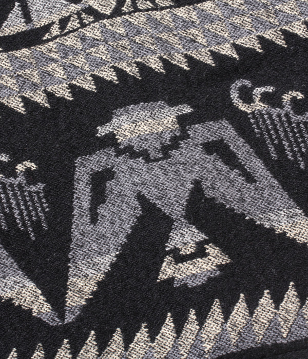 日本が世界に誇る毛織物産地「尾州」で生産したサンダーバード柄のコットンウールブランケット。経糸に2/30ウール糸、緯糸に太番手の3/-コットン糸を使用したブランケット生地は、ヴィンテージのブランケットをもとに糸番手から分析して再現したもの。ヴィンテージ同様の質感を追求し、ジャガード織機で時間をかけて織り上げている。ウールジャガード織機は国内でも数台しかないうえ、織機を低速で動かしているため1日に織り上げられる生地はたった20mほど。長年毛織物に携わってきた尾州の職人たちにより、手間暇を惜しまず作られた良質なブランケットに仕上がっている。型は1940年代のワークコートで、丁寧に柄合わせされたポケットや鈍い光を放つコンチョボタンも特徴。