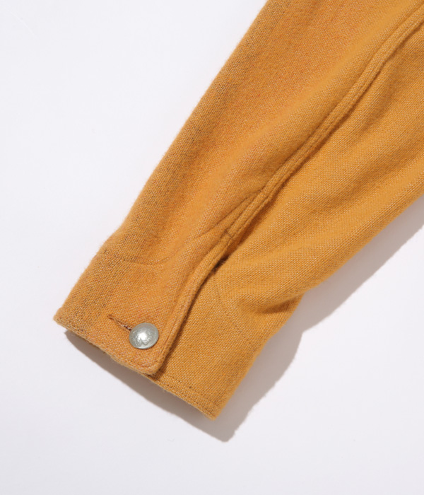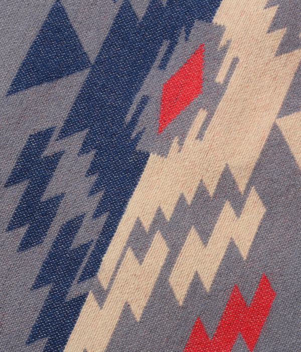 日本が世界に誇る毛織物産地「尾州」で生産したネイティブアメリカン柄のウールブランケット。経糸に30/2コットン糸、緯糸に太番手の1/5ウール糸を使用した三重織りブランケット生地で、ウールは起毛しやすく保温性に優れた紡毛糸(ぼうもうし)を採用。国内に数台しかないウールジャガード織機を使い、ヴィンテージブランケットのような風合いを再現するため、ゆっくりと時間をかけて織り上げている。