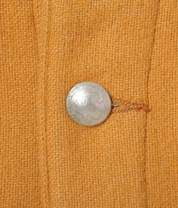 型は1940年代のワークコート。ヴィンテージ同様に縫製部分はサテン生地のパイピング仕様。ストライプ柄・大柄・小柄が決まった箇所に出るようマーキング(図入れ)をしているため、裁断に手間がかかり生地にも無駄が多く出てしまう。また縫製時も柄合わせなどの高度な技術が要求され、こだわり抜いた作りが特徴の逸品となっている。