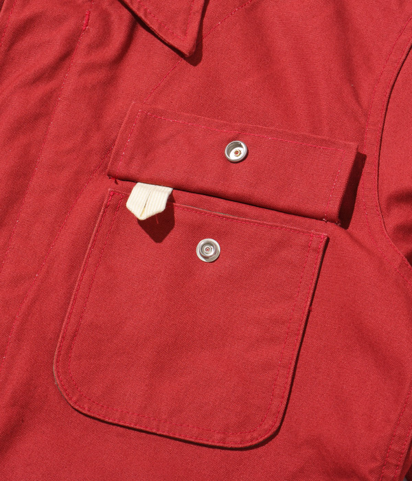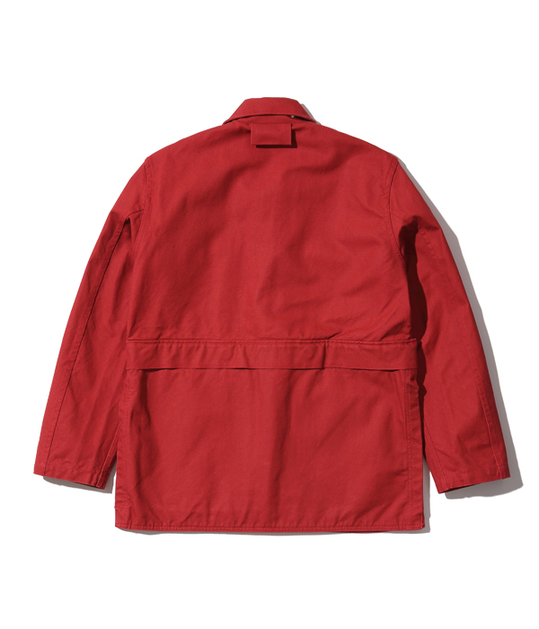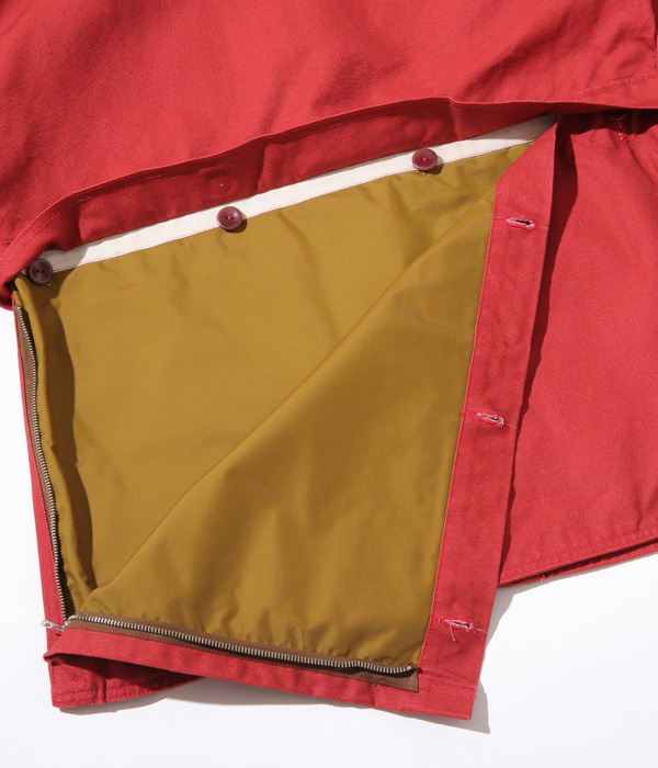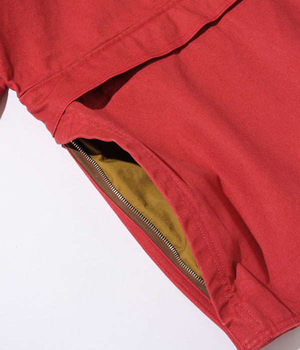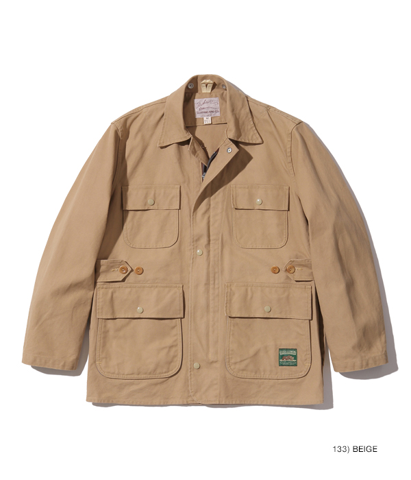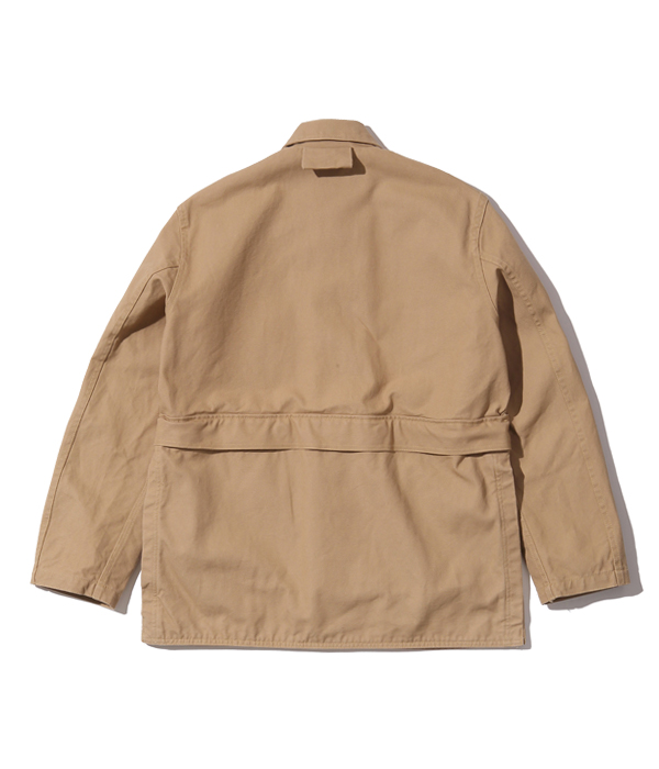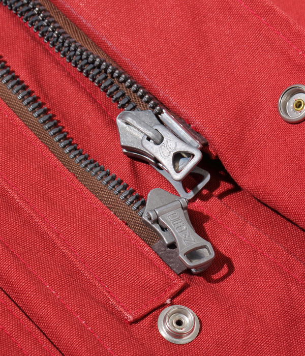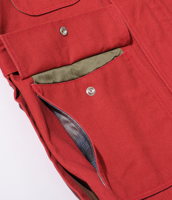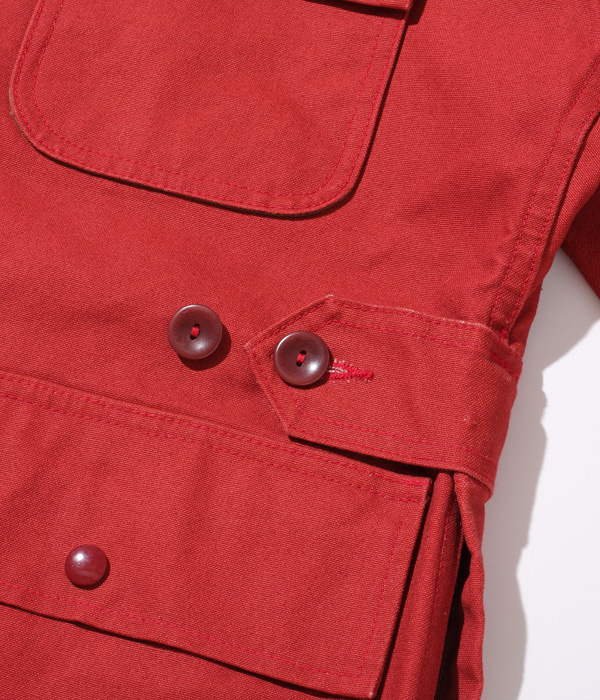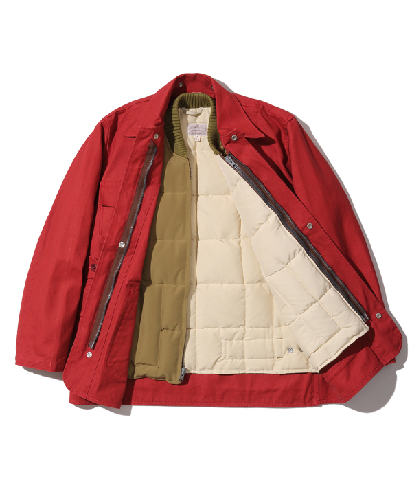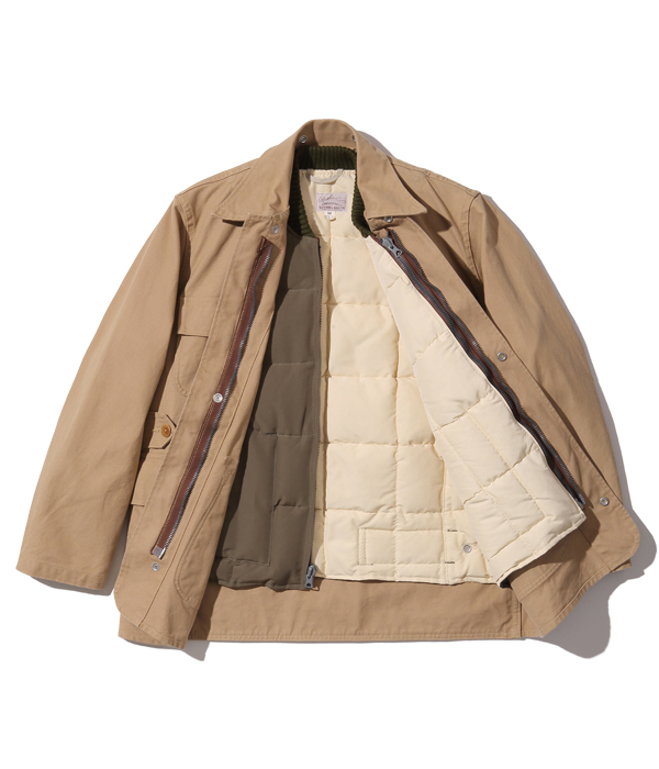 別売りのダウンベストと組み合わせることが可能なアメリカ製の“VIKING”キャンバスシェル。ハンティングジャケットとしてのディテールが特徴で、スナップボタンの付いた4つのポケットに加え背面にはジップとボタンで開閉可能なゲームポケットを装備。ウエストはボタンで調整可能。フロントはスナップボタンとクラウンジッパーの二重構造で、ライナー用ジッパーもクラウン製を使用している。