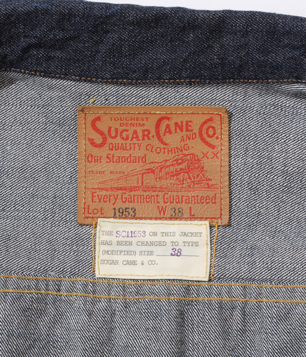 シュガーケーンのロングセラーである2ndタイプのデニムジャケット(Lot No. SC11953)をオーバーサイズにアレンジ。14.25オンスのオリジナルデニム生地やタックボタン、リベット等のパーツ、縫製仕様など1950年代のディテールはそのままに、サイズ感を大きくしている(着丈約+5cm、身幅約+8cm、肩幅約+5cm)。肩幅を広くしている分、袖丈を短くしているのでバランス良く着用できるシルエット。襟元のメインラベルの下にはアレンジを施したことを示すモディファイドラベルが縫い付けられる。