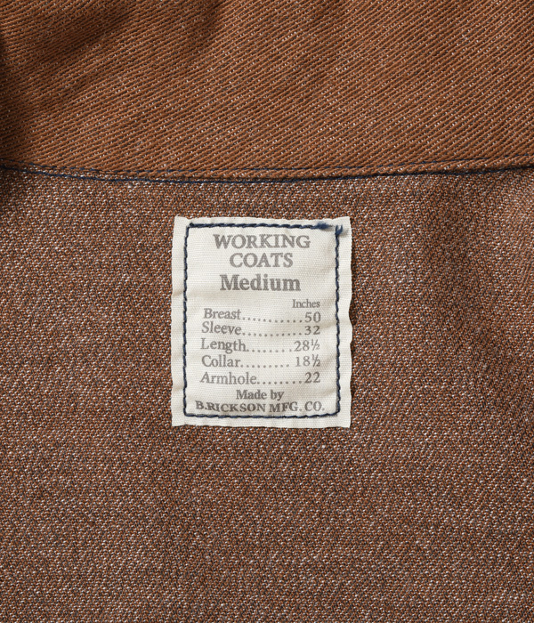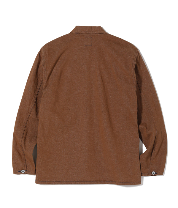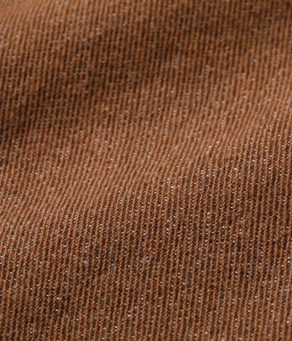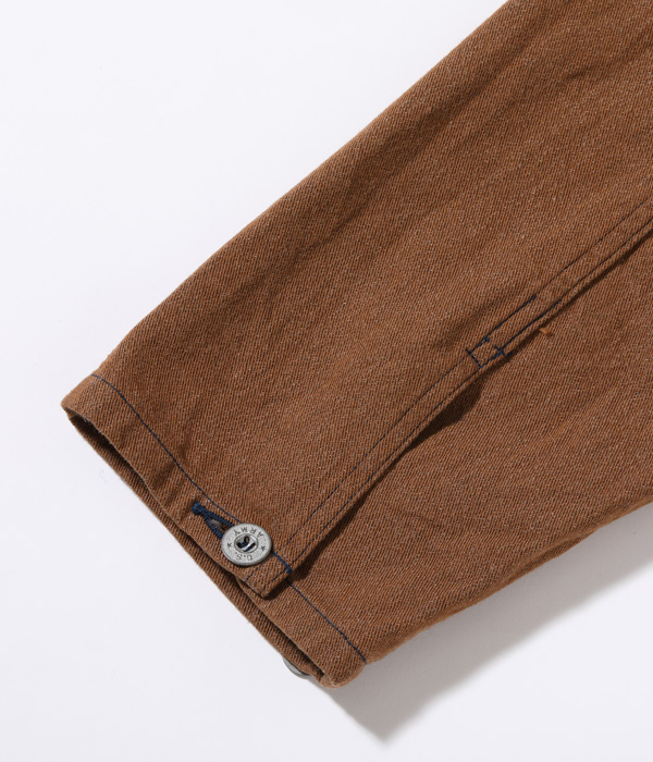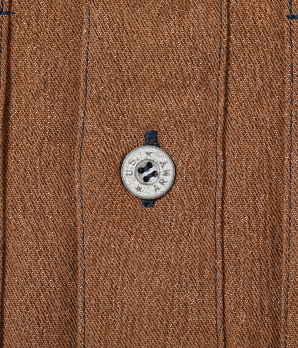 米陸軍は第一次大戦から第二次大戦にかけてデニムの作業用ジャンパーとトラウザーズを採用した。1919年に採用されたブルーデニム製のものは稀にビンテージ市場で見かける事もありその存在は知られているが、ブラウンデニム製はブルーデニム以前に製作されたことから現存する数が極めて少く、その存在はあまり知られていない。経糸にブラウンのナチュラルインディゴ、緯糸に生成りとブラックの杢糸を使用した特別な生地で、これは土埃などの汚れを目立たなくする効果を狙ったものであった。縫製はブラウンデニムに対してネイビーのステッチワークが効いており、バータックを使用していないディテールが古き時代の手作り感が伝わってくる。
