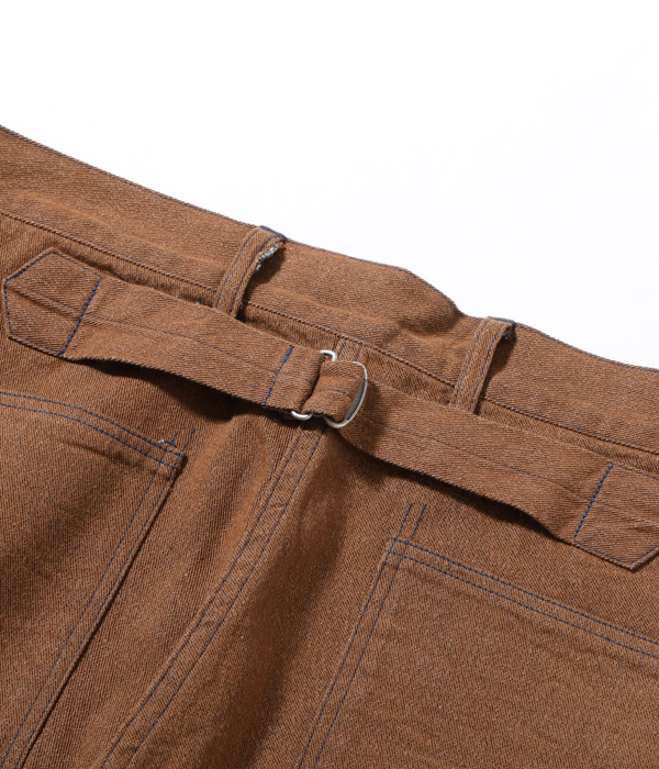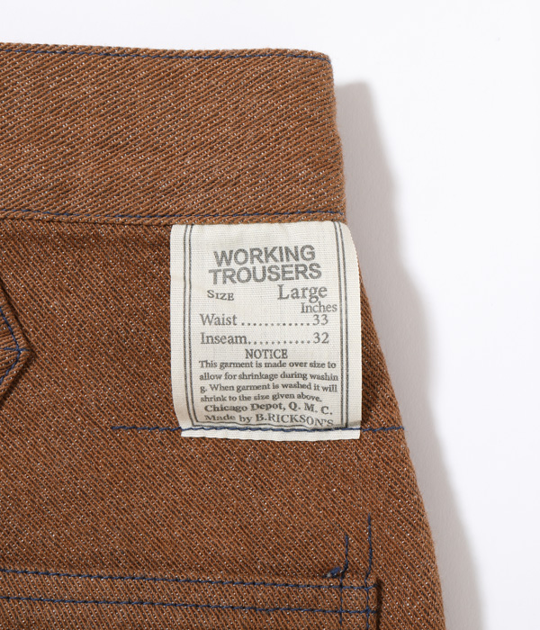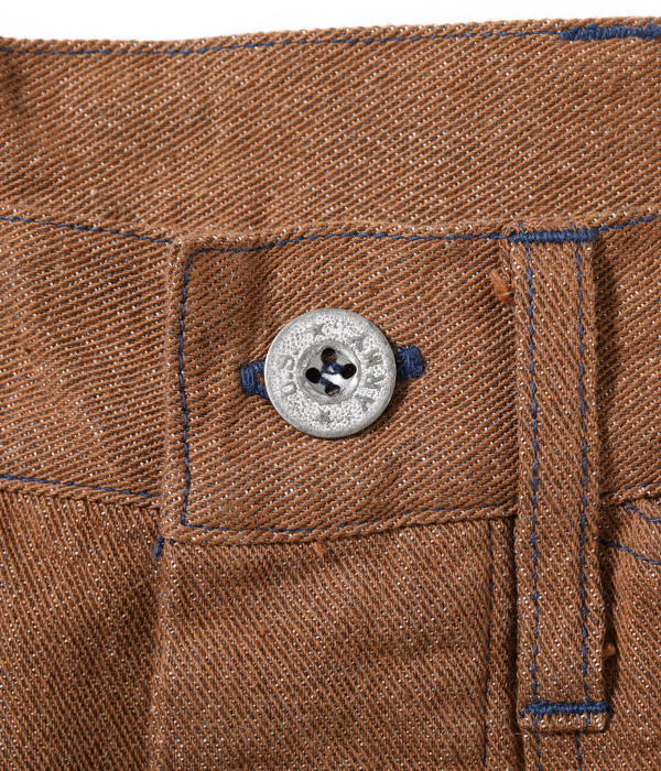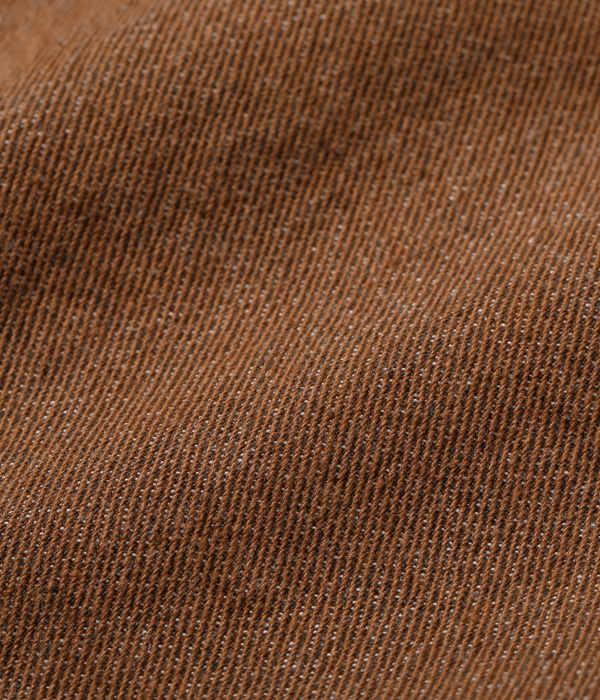 米陸軍は第一次大戦から第二次大戦にかけてデニムの作業用ジャンパーとトラウザーズを採用した。1919年に採用されたブルーデニム製のものは稀にビンテージ市場で見かける事もありその存在は知られているが、ブラウンデニム製はブルーデニム以前に製作されたことから現存する数が極めて少く、その存在はあまり知られていない。経糸にブラウンのナチュラルインディゴ、緯糸に生成りとブラックの杢糸を使用した特別な生地で、これは土埃などの汚れを目立たなくする効果を狙ったものであった。縫製はブラウンデニムに対してネイビーのステッチワークが効いており、バータックを使用していないディテールが古き時代の手作り感が伝わってくる。