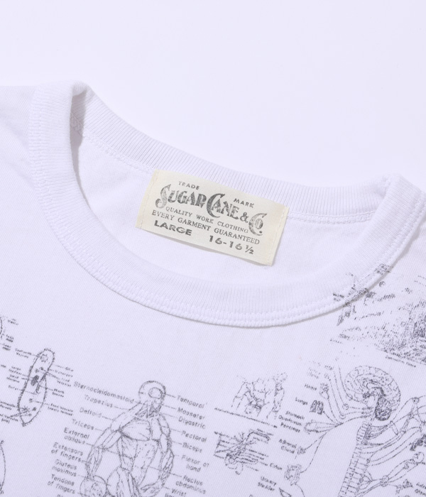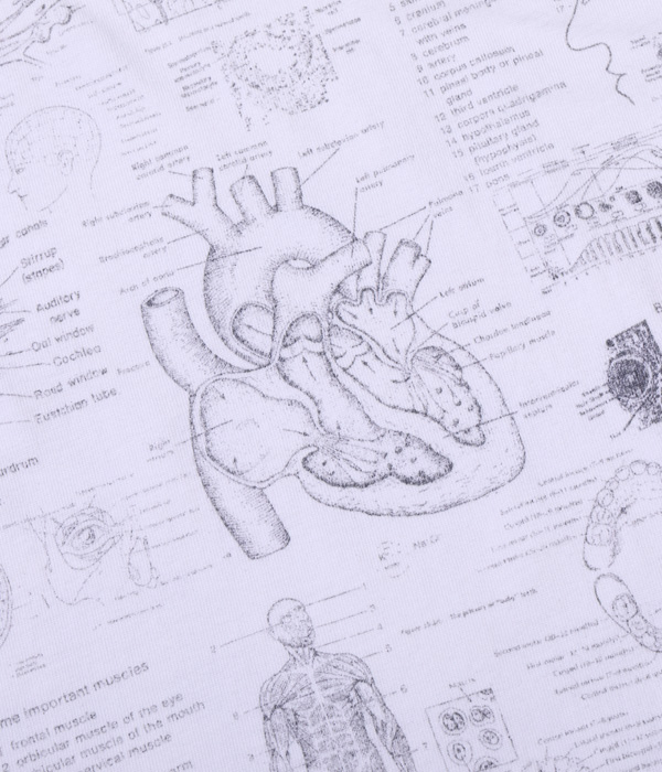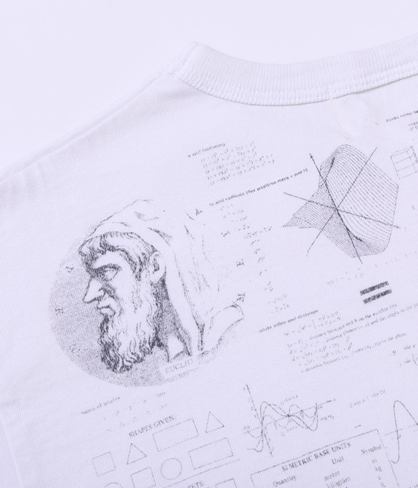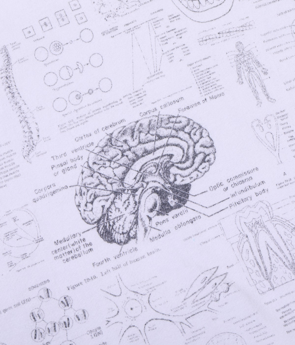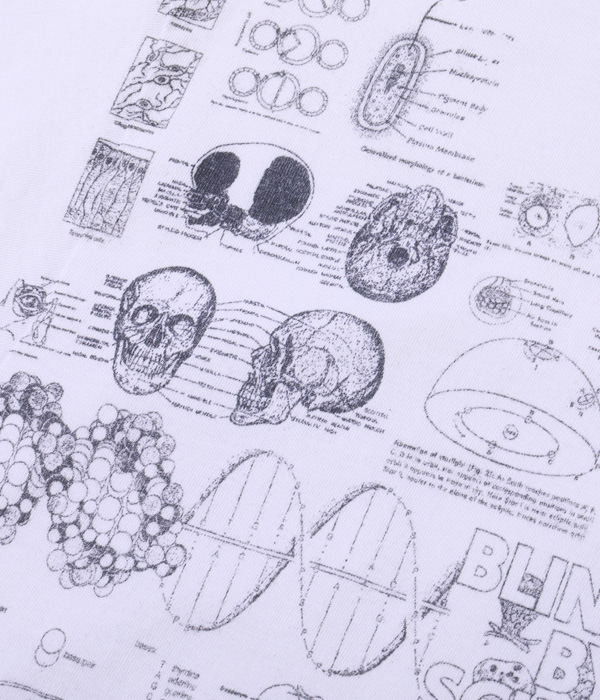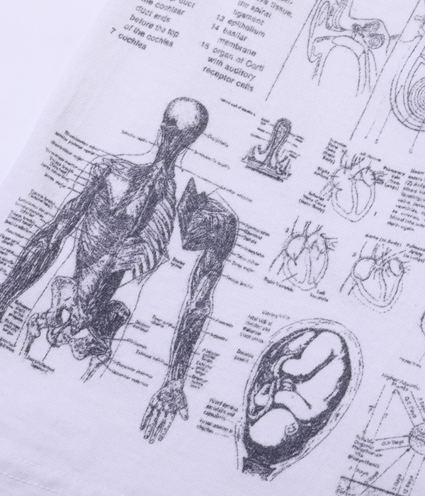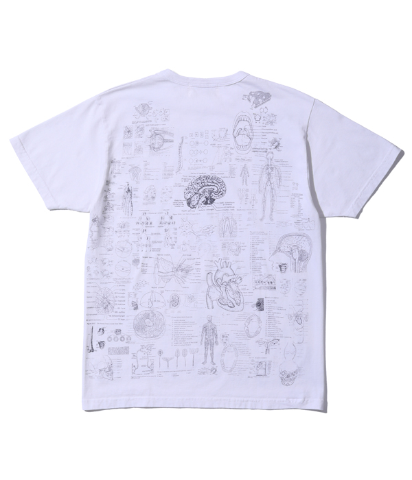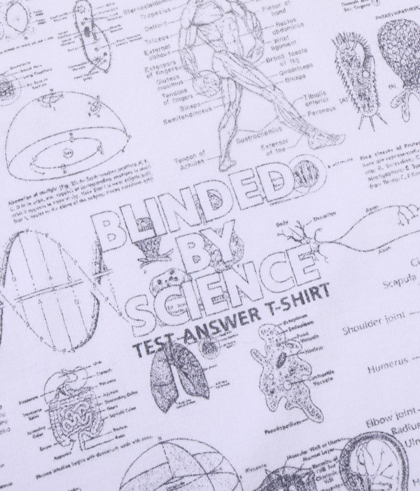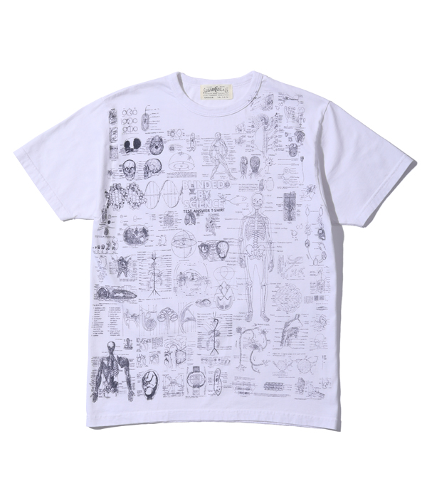 1990年代に展覧会などのイベントに合わせて販売されていた「化学」Tシャツがベース。骨、内臓、筋肉や解剖図などのモチーフはレスリー・アーウィンシリーズが著名だが、あくまで単体プリントであり、ここまで化学図鑑のように沢山の柄をコラージュしたものは非常に珍しい。フロントとバック一面に入ったプリントが魅力なので今回はボディのサイズ毎に版下をグレーディングしてどのサイズでもバランスよく収まるように再現している。丸胴ボディで米国製。”TEST ANSWER T-SHIRT”の名の通りカンニングと疑われたり、他人に解答を教えてしまう可能性があるため試験会場への着用は控えて欲しい。