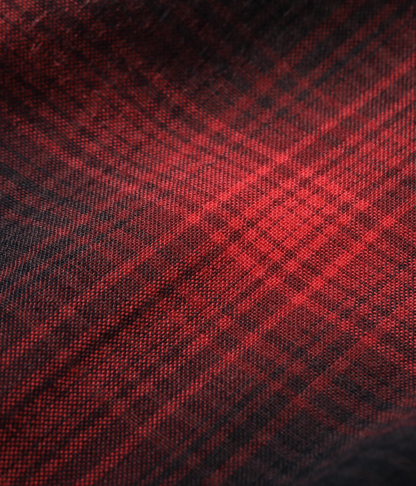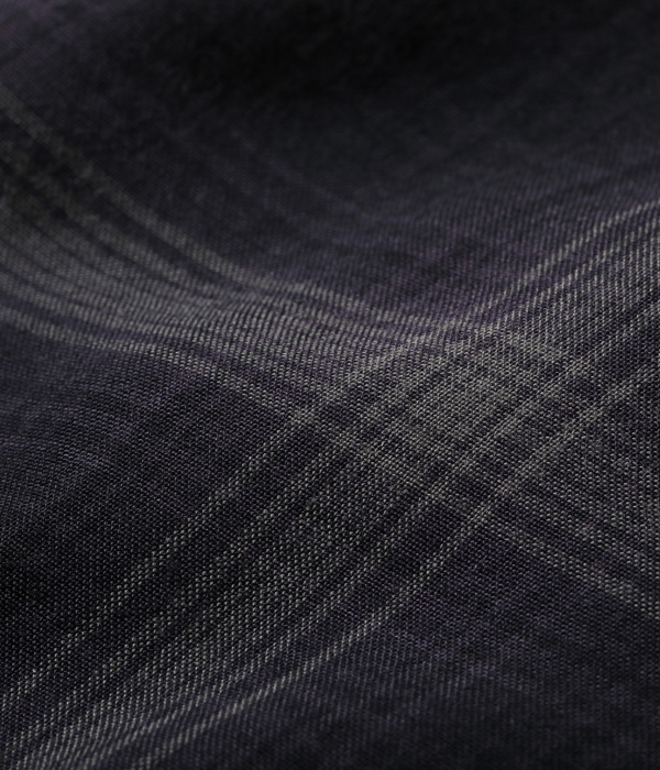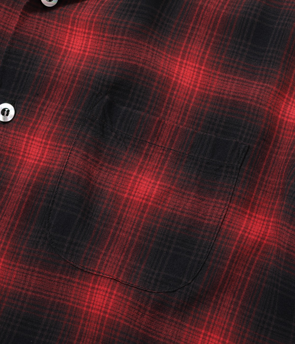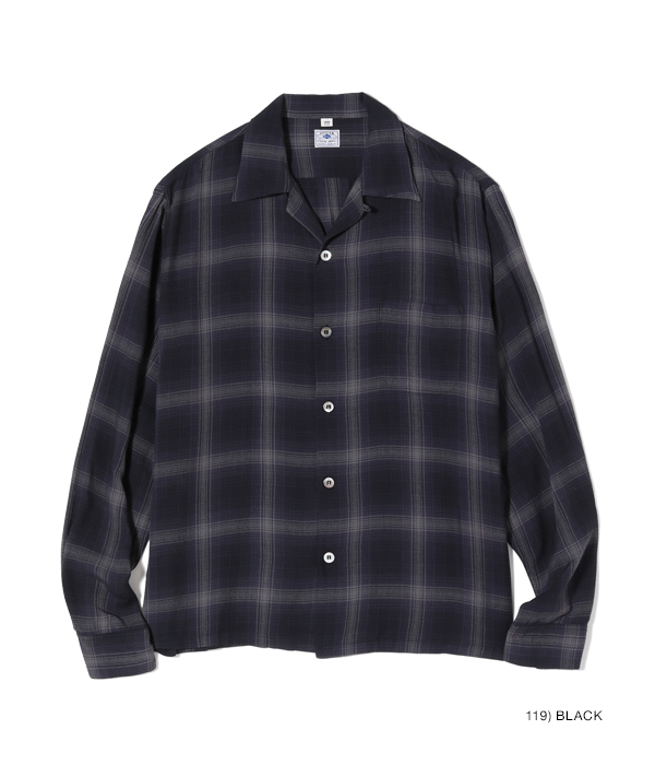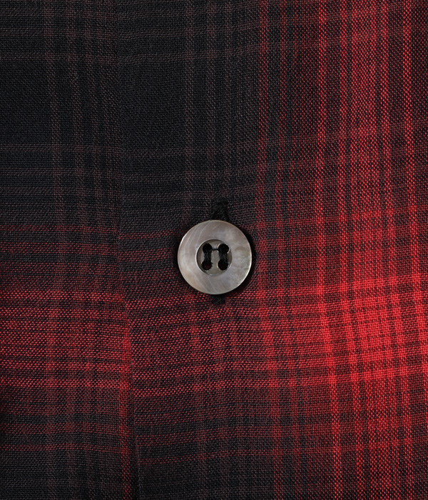 1950年~60年代のヴィンテージシャツから起こした、小ぶりな襟のオンブレーチェックオープンシャツ。経糸、緯糸ともに4色の糸を使用している。この年代は化学繊維のシャツも出始めた頃であるが、こちらはレーヨン100%の生地となっている。ボタンには黒蝶貝を採用。
