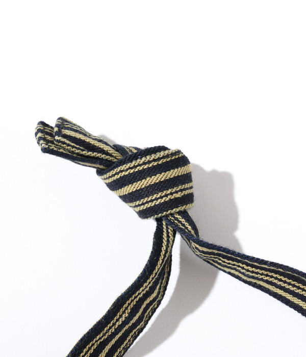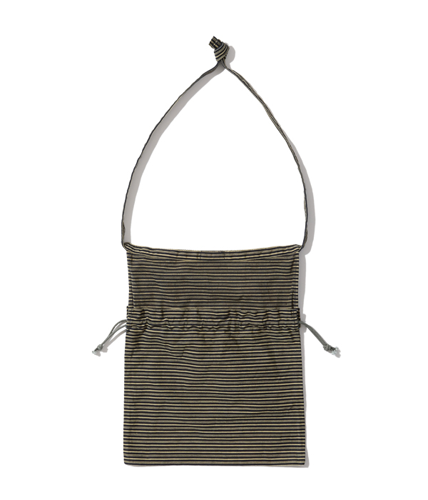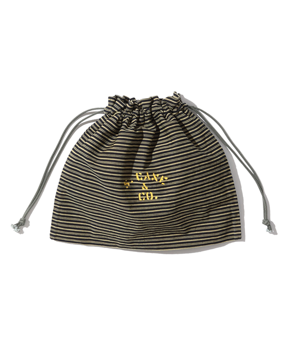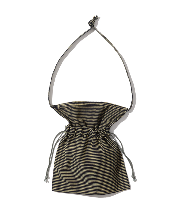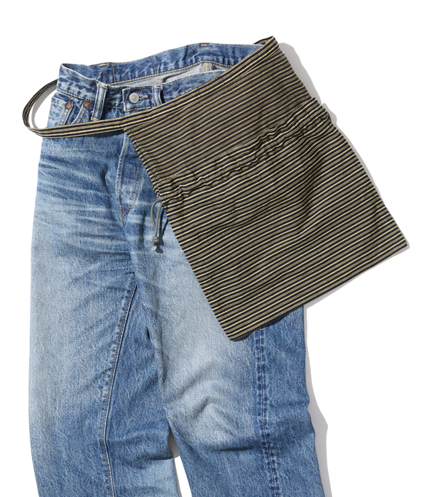 1940年代のARC(American Red Cross)のへリンボンツイル製エプロンバッグをワークウェアの素材に置き換えて製作。配給品を配るときはエプロンとして、救急キットなどを収納するときには巾着型バッグとして使用されていた。ヴィンテージでは寸法や地の目の向きなどさまざまなバリエーションが存在するが、口端にセルビッチを使えるヨコ使いタイプを採用し、ストラップはたすき掛け出来るように延長している。