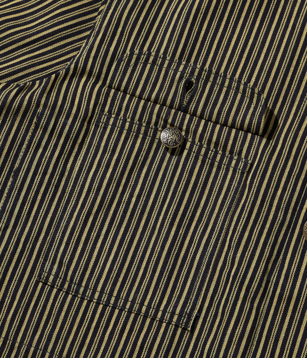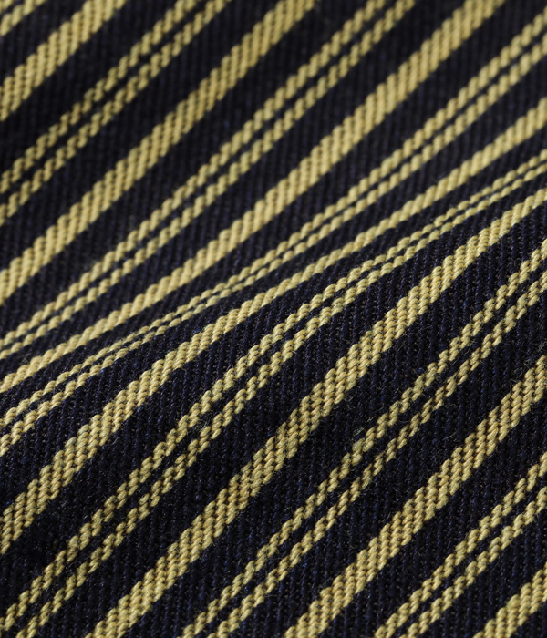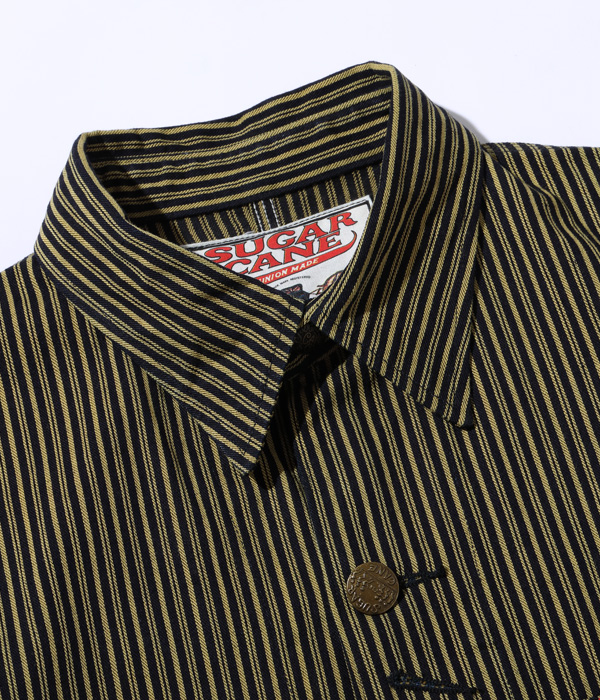 生地は1940年代に存在した「BROWN EXPRESS STRIPE」と1930年代には存在していた「LIBERTY STRIPE」を組み合わせたシュガーケーンオリジナルの「BROWN LIBERTY STRIPE」。経糸にロープ染色のインディゴと硫化染料のブラウン、緯糸にチャコールグレーの糸を使いシャトル織機で織り上げた11オンスのセルビッジ生地で、経年変化を楽しめる仕上がりとなっている。