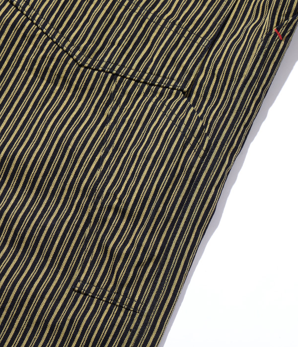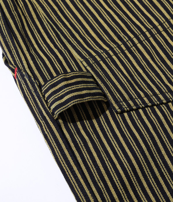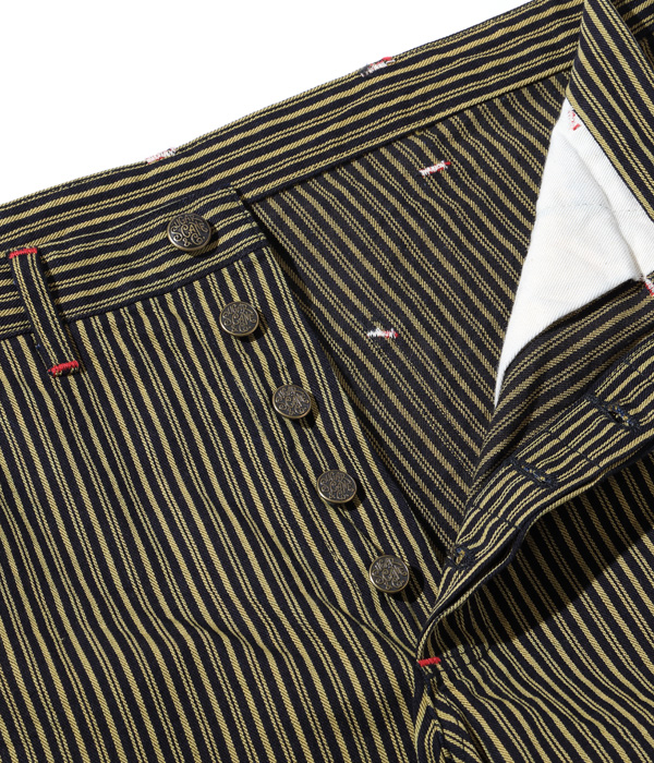 生地は1940年代に存在した「BROWN EXPRESS STRIPE」と1930年代には存在していた「LIBERTY STRIPE」を組み合わせたシュガーケーンオリジナルの「BROWN LIBERTY STRIPE」。経糸にロープ染色のインディゴと硫化染料のブラウン、緯糸にチャコールグレーの糸を使いシャトル織機で織り上げた11オンスのセルビッジ生地で、経年変化を楽しめる仕上がりとなっている。同じ生地を使用したワークコートとセットアップで着用可能。。