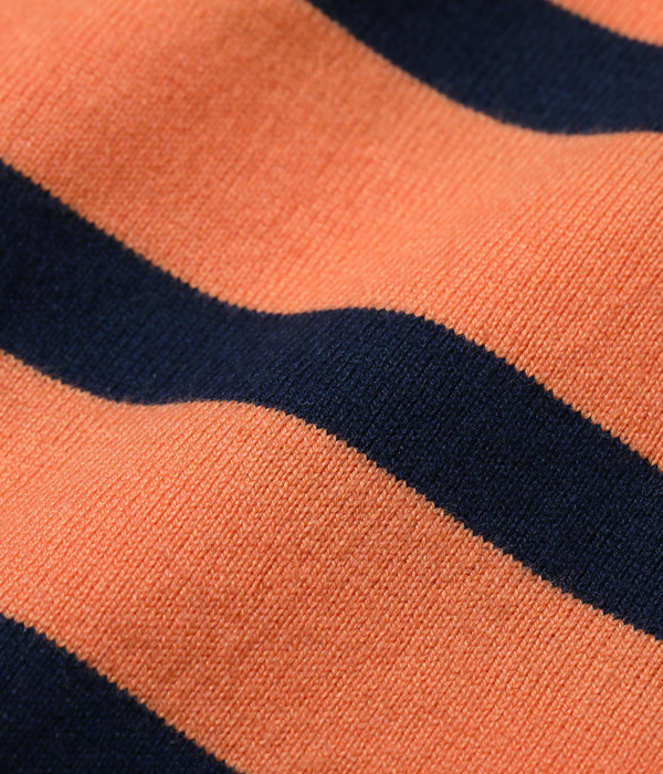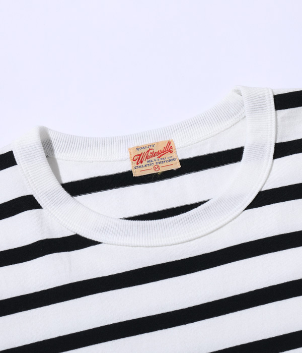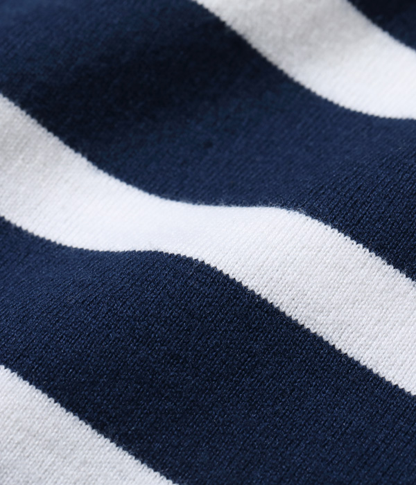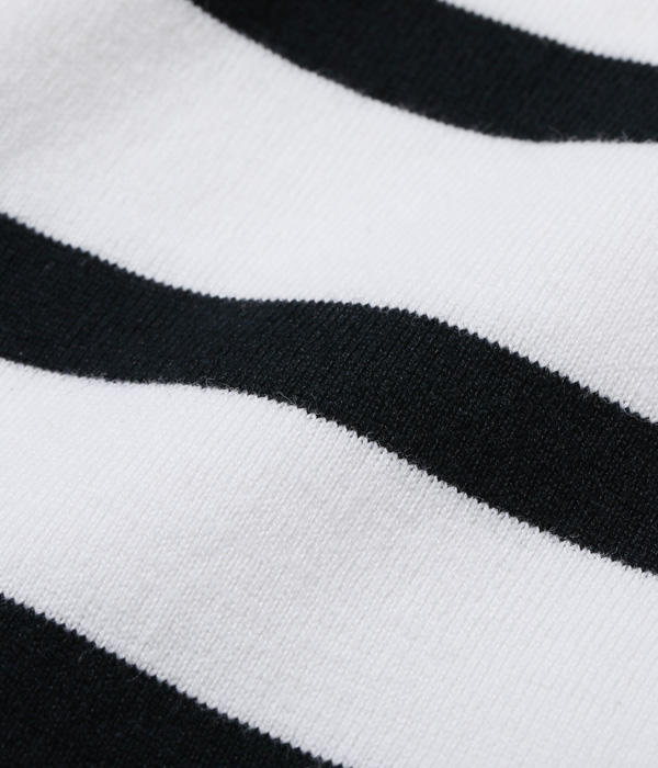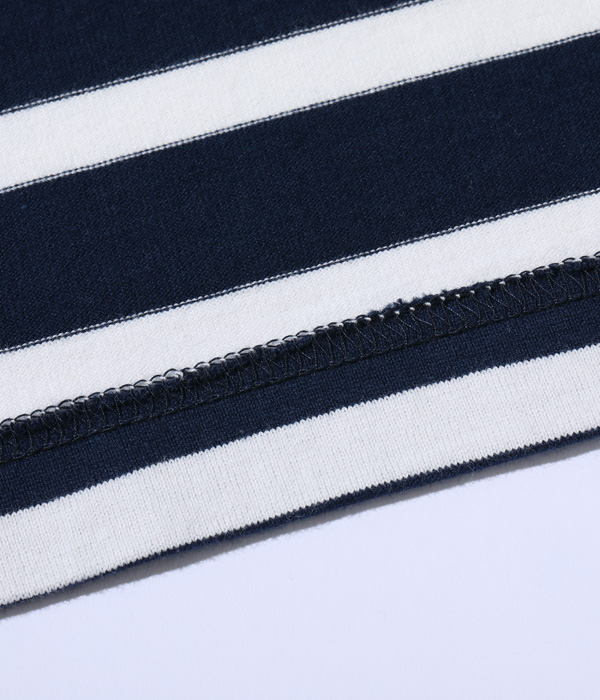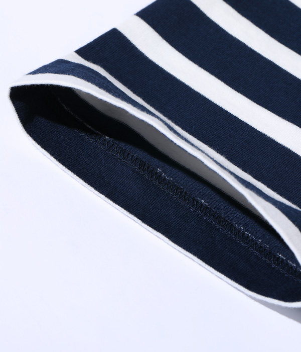 生地は30番手の双糸で編み立てられたボーダー天竺を使用。目を詰めて編むことでしっかりとした質感の生地に仕上がっている。首元は14番手の糸で編み立てられたリブを挟み込むバインダーネック仕様で、肩や裾、袖口は2本針縫製を用いている。ボディーカラーは3色でピッチ幅はシンプルな2:1を採用した、デイリーユースに最適なボーダーTシャツに仕上がっている。