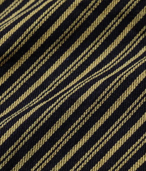 生地は1940年代に存在した「BROWN EXPRESS STRIPE」と1930年代には存在していた「LIBERTY STRIPE」を組み合わせたシュガーケーンオリジナルの「BROWN LIBERTY STRIPE」。経糸にロープ染色のインディゴと硫化染料のブラウン、緯糸にチャコールグレーの糸を使いシャトル織機で織り上げた11オンスのセルビッジ生地で、経年変化を楽しめる仕上がりとなっている。同じ生地を使用したワークコートとセットアップで着用可能。