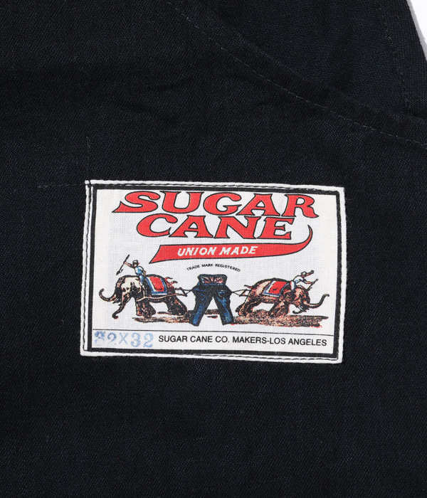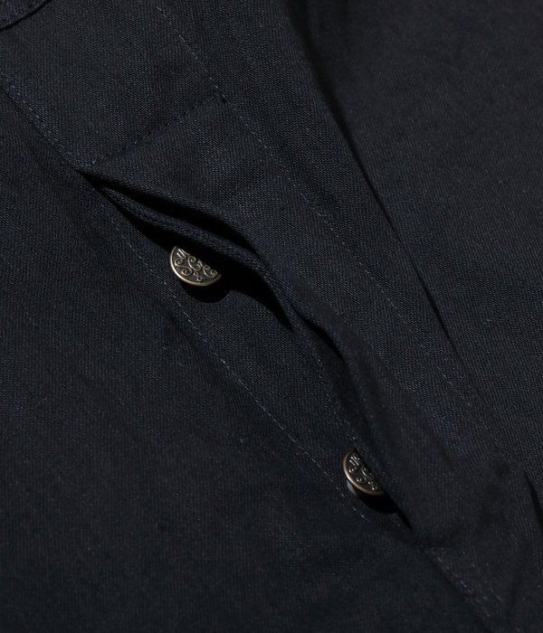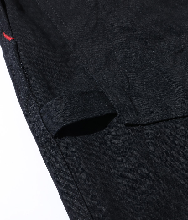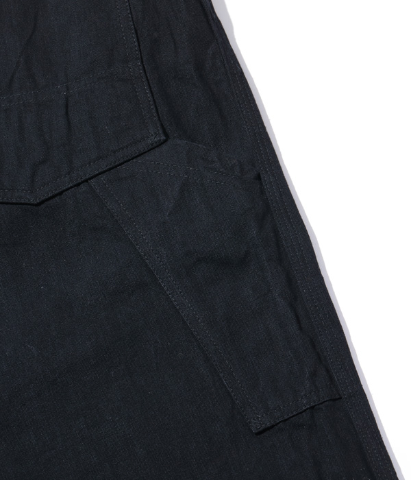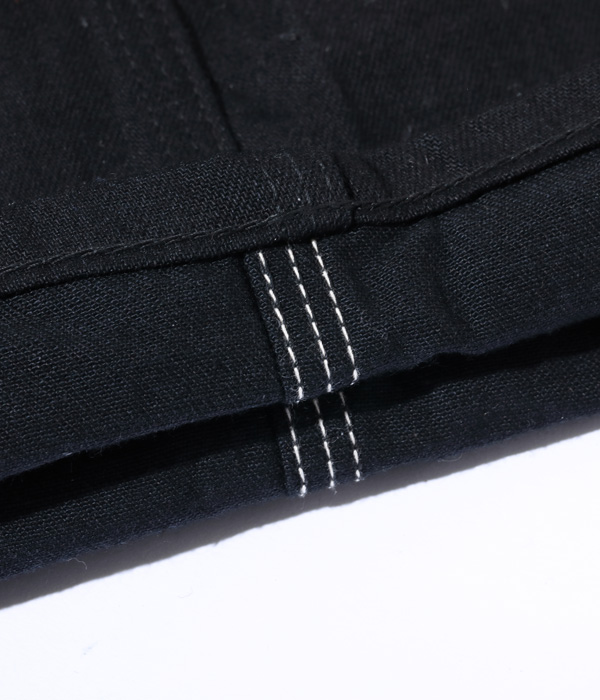 生地は経糸・緯糸ともに硫化染料でロープ染色したブラックの糸を使用し、シャトル織機で織り上げた11オンスのセルビッジブラックデニム。通常、ブラックデニムというと1980年代以降のイメージが強いが、少量ながら大戦前からワークウェアの素材として使用されており、ヴィンテージワークブランドとして知られるHEADLIGHTでも1940年代には「BLACK JEANS」をリリースしていた。同じ生地を使用したワークコートとセットアップで着用可能。