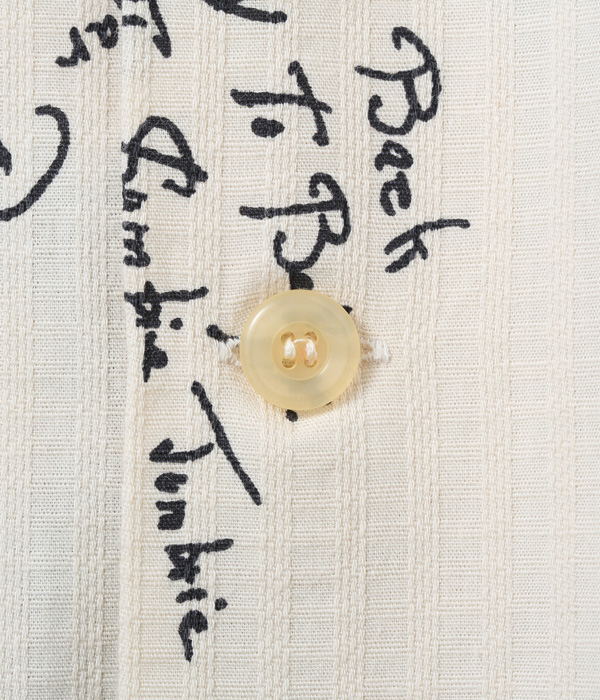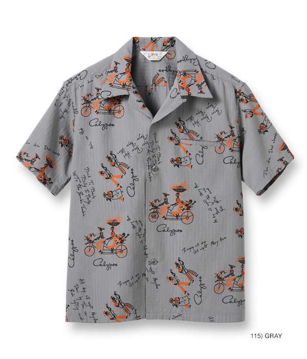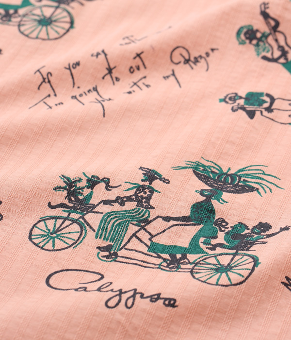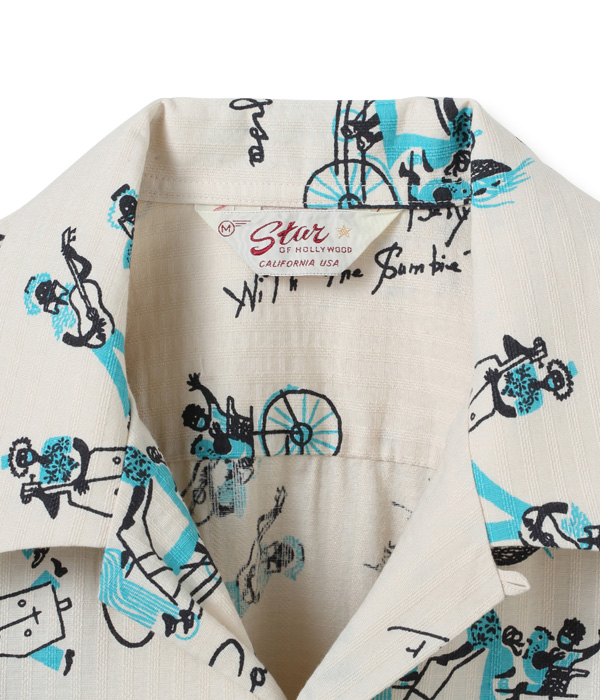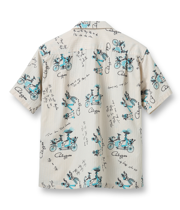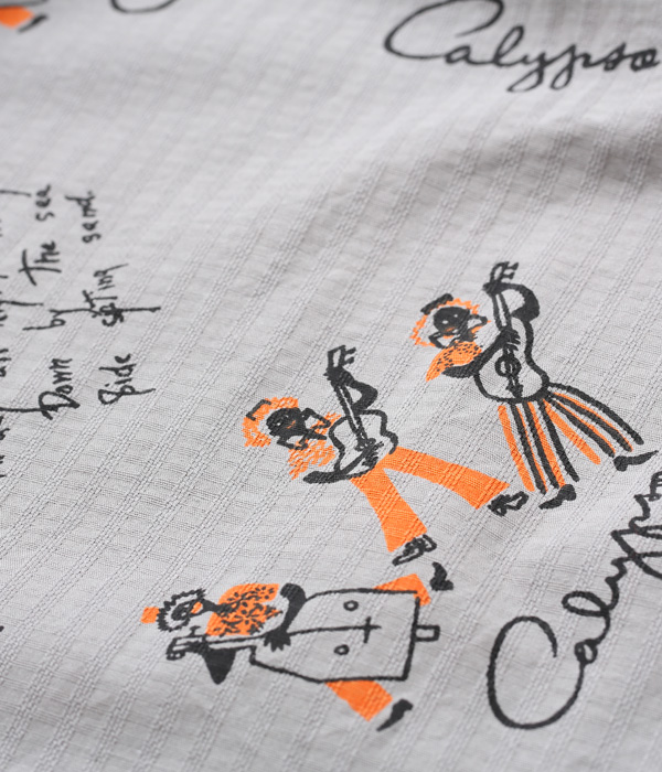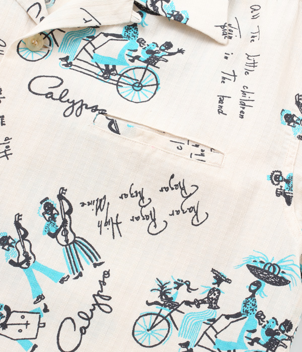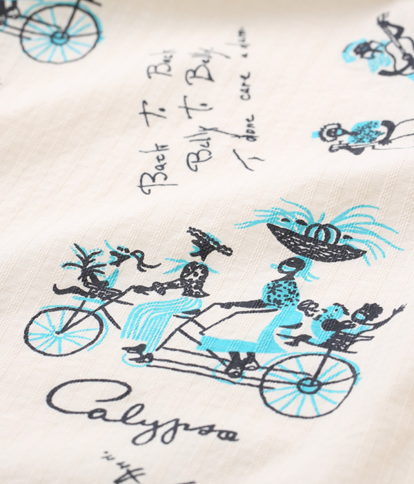 「カリプソ」とはアフロ・キューバン・ミュージックの一種。1950年代中頃に人気を博し、歌詞の内容はコミカルなものから社会を風刺したものまで様々であった。本作にはカリブ海に浮かぶ島の人々の生活風景や路上で演奏するミュージシャン、そして曲の歌詞がプリントされている。このようなプリントシャツはヴィンテージでも非常にレアで、スターオブハリウッドで復刻すべきスペシャルな逸品。