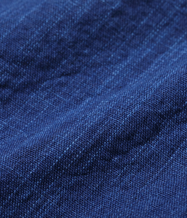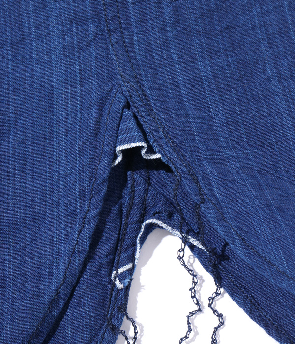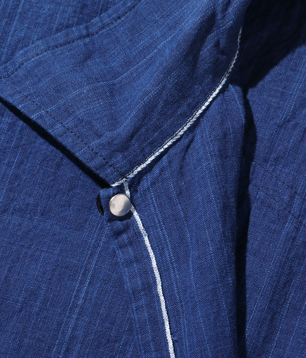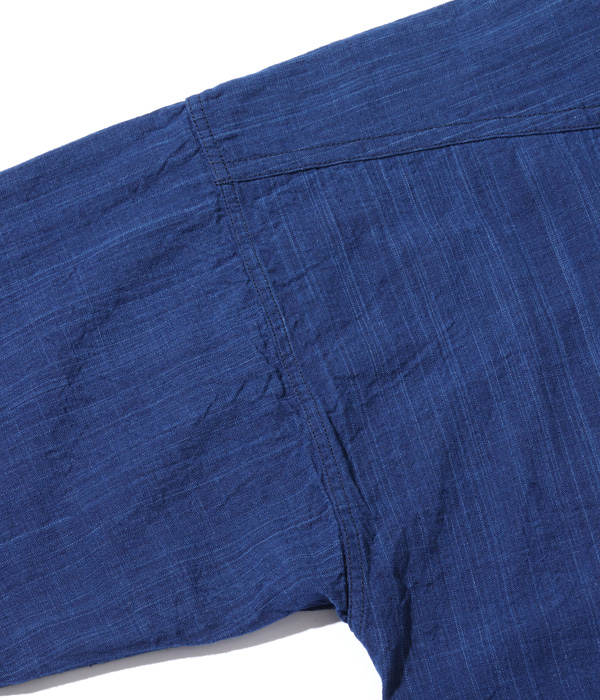 江戸時代の藍染古布をもとに、茜糸とインディゴ糸をシャトル織機で織り上げた5オンスの砂糖黍製ストライプ生地を使用。生地の混率はコットン90%に対してサトウキビ10%で、襟やカフスの端、脇裾の力布にセルビッジを使用している。