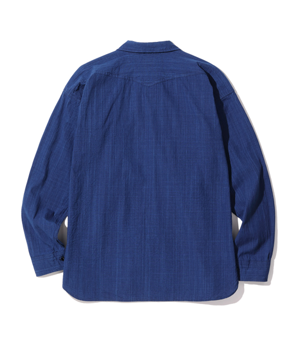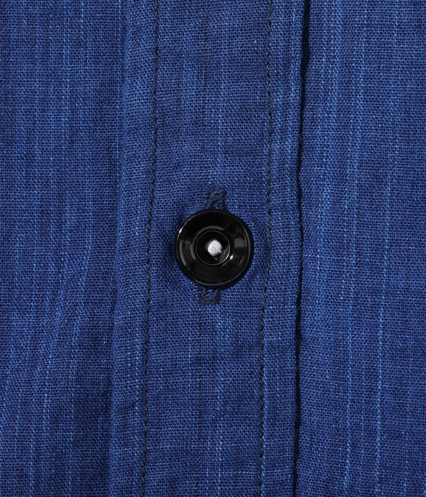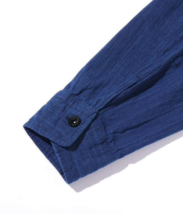 型は着物とシャツの中間のような、身頃がすべて繋がった長方形のシンプルな作り(肩ヨークの継ぎに見える箇所は生地を二重にして補強している)。襟やカフスの端にはセルビッジを配している。ワークウェアらしく、ボタンは頑丈な黒塗りの打ち込み式ドーナツボタンを採用。
