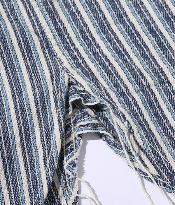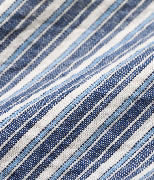 江戸時代の藍染古布をもとに、茜糸とインディゴ糸をシャトル織機で織り上げた5オンスの砂糖黍製ストライプ生地を使用。生地の混率はコットン90%に対してサトウキビ10%で、襟やカフスの端、脇裾の力布にセルビッジを使用している。