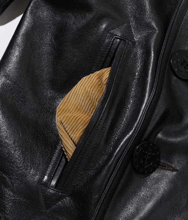 This coat is designed to be slightly shorter in length than the original government- supplied pea coats so that it will have mobility. Also, to have entrances of the pocket reinforced with the leather welts.