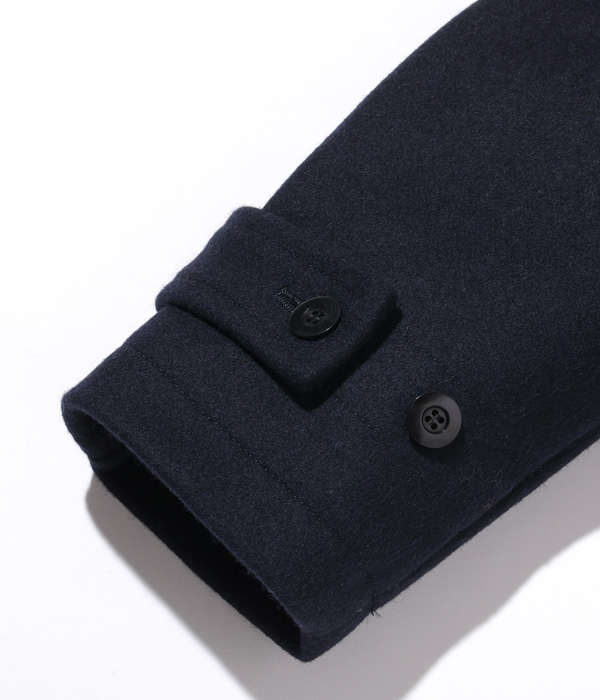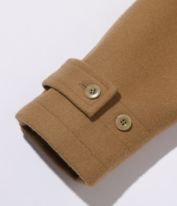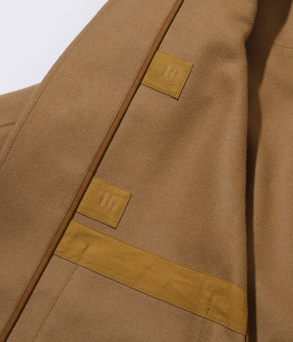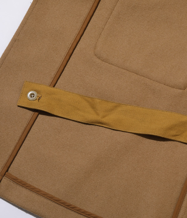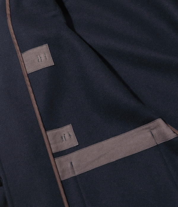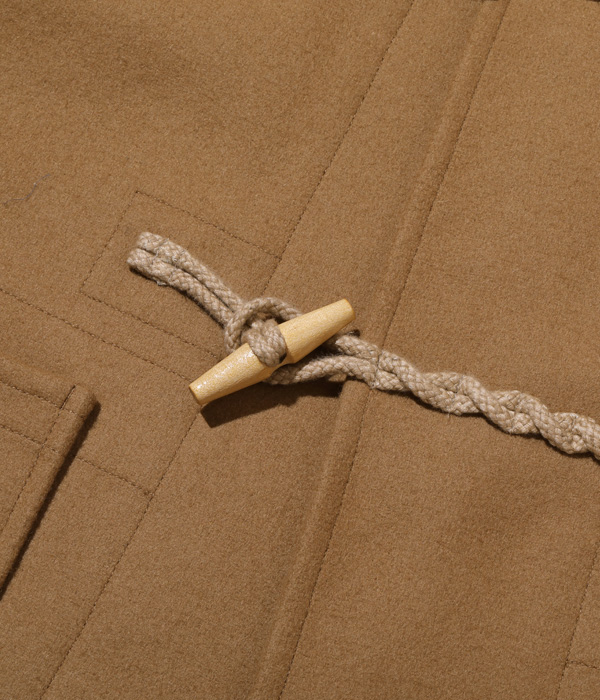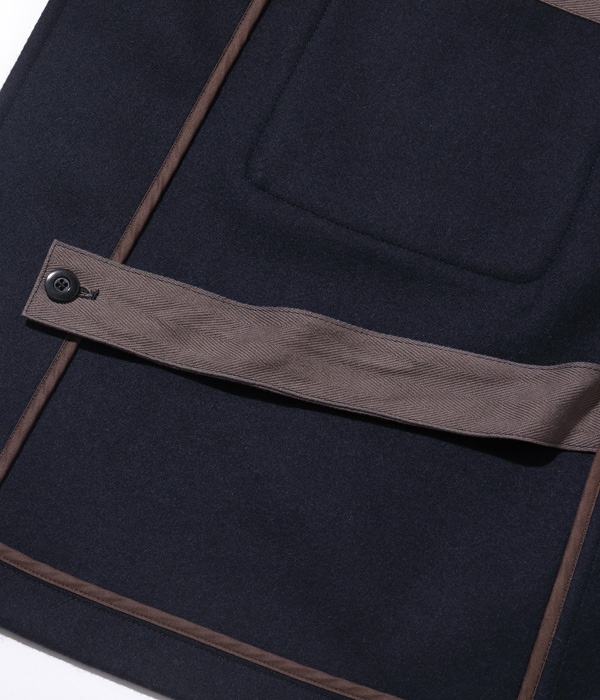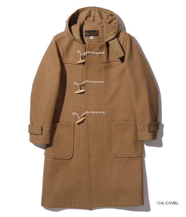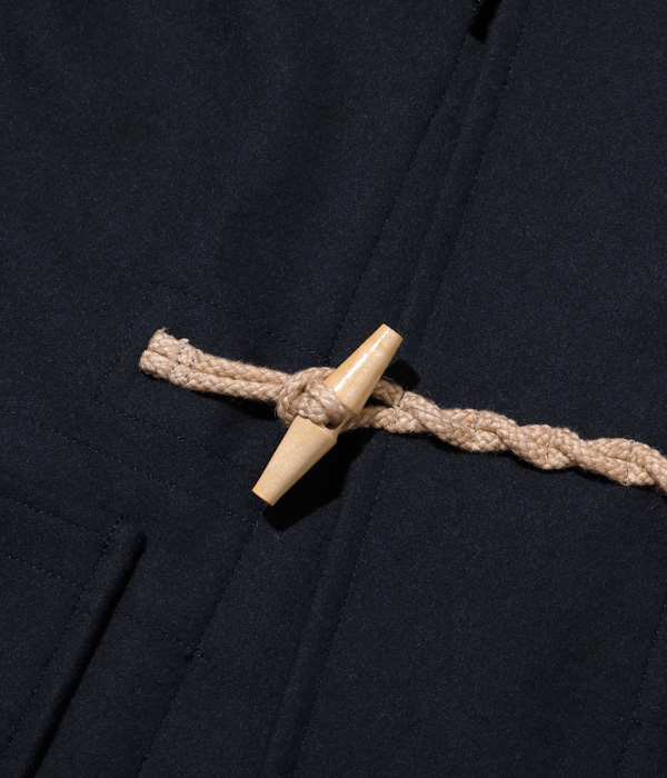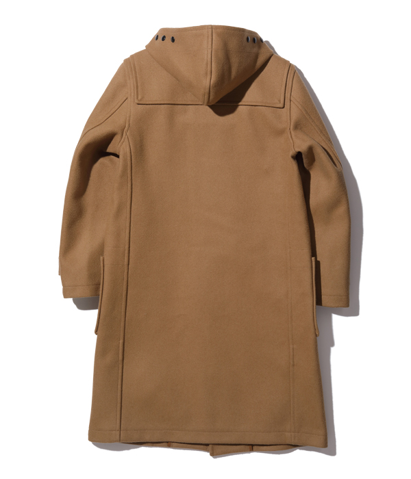 The name “duffel” comes from Duffel, a town in Antwerp Province in Belgium. This town s specialty, a sturdy twill weave wool cloth known as fustian weave, was exported throughout Europe. It is a strong fulled cloth that does not easily stain in water, and as it offers excellent cushioning it was even used for inner lining of explosive boxes. Originally worn by Scandinavian fishermen as work clothes, a duffel coat s basic design had a toggle and rope closure so that it can be opened and closed wearing gloves. It is said that toggles originated from the buoys used in fishing and for this reason were made of wood. The coat s other characteristic, the hood, is intended to protect the wearer from the cold. By wearing the coat from the head, the hood prevents the body temperature from decreasing. The duffel coat has been adopted by the U.K. Navy since World War II; however, the background that led to its adoption is not clear. The first model is characterized by three toggles at the front and a hood with an adjustable snap button. In addition, the strap attached to the inside hem is designed for the wearer s legs to be passed through to prevent the hem from flapping on the vessel in the sea wind. Simple yet offering cold protection, the U.K. military s duffel coat subsequently had fans in countries all over the world.