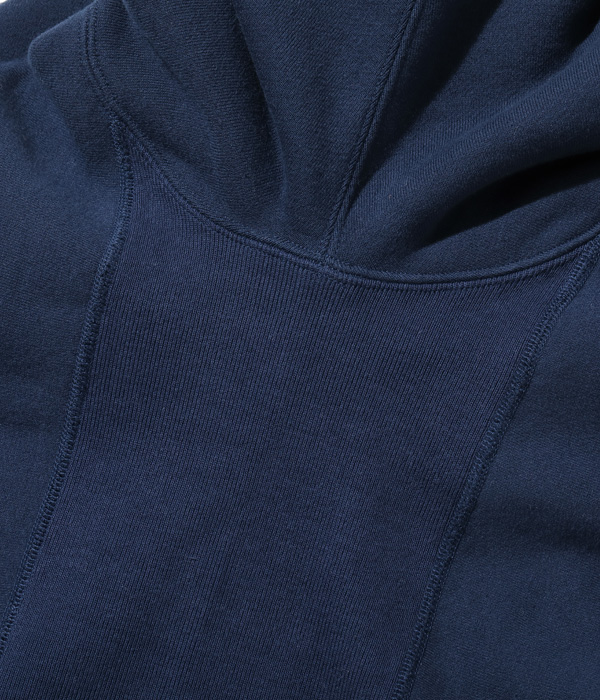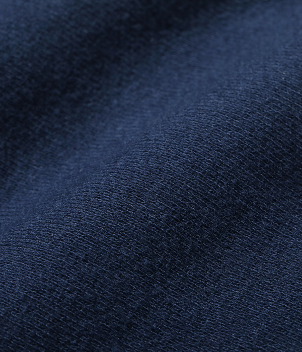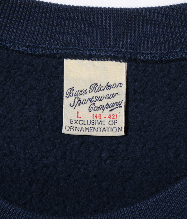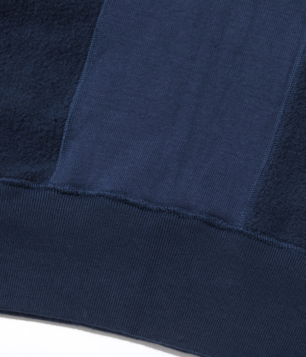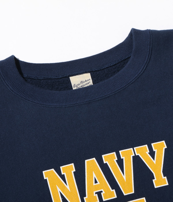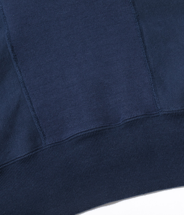 身頃の生地を横使いし、サイドにリブ素材と切り替えたホリゾンタル・ニッティング。ホリゾンタルとは「横方向」という意味を持つ。丈の縮みを防止すると共に、脇に縦方向のパネルを使い、縦横の伸縮性を意識した仕様。継ぎ目がない肩は着用している時にストレスが掛かることなくスムースな着心地を誇るが、裁断時において広い作業スペースが必要で、ネック部分をくり抜くなど大掛かりな作業となる。こちらは海軍士官候補生のフットボールチームが着用したスウェットシャツで、チームカラーのネイビーとゴールドが使用されている。
