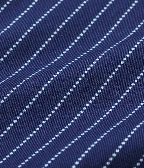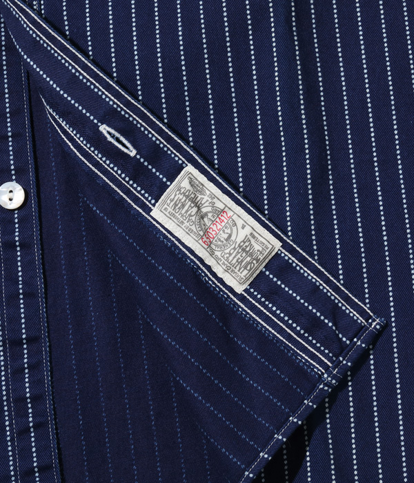 フィクションロマンスレーベルのスタート時から10年以上に渡ってリリースされているウォバッシュストライプシャツは、現在も定番アイテムとしてラインナップされている。ドレスシャツからワークシャツへ移行する黎明期のディテールで、多数のリピーターも存在する人気のアイテムだが、よりカジュアルに着用したいというリクエストに応え、今回はチンストラップ仕様ではないヴィンテージをベースに製作。定番のガチャポケに対し、左右共通の仕様となり、ボタンは黒塗りのタックボタンからシェルボタンに変更している。