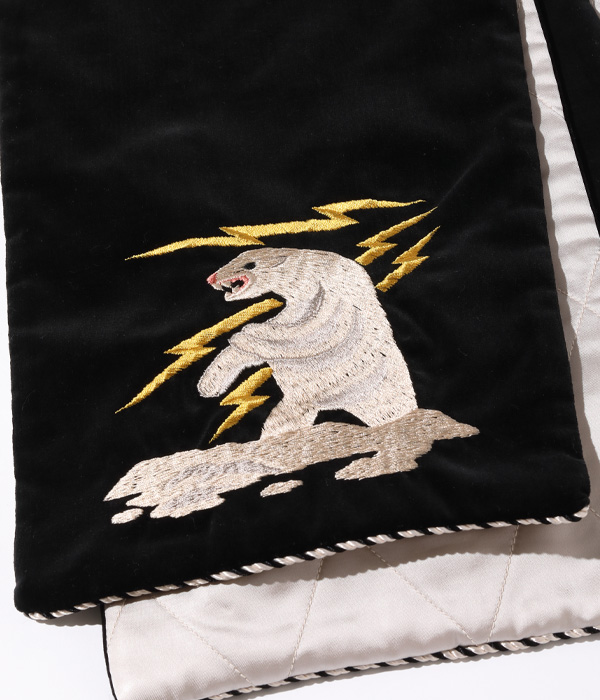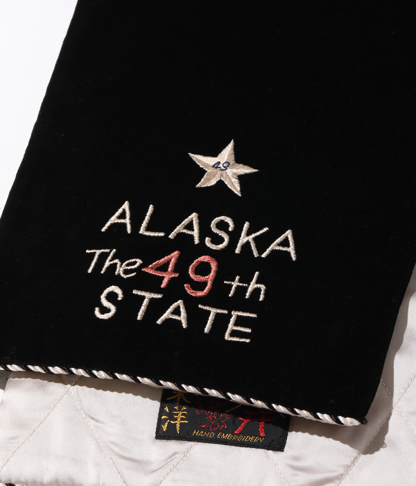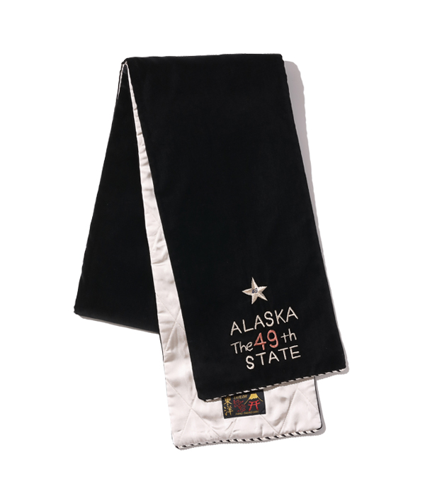 1950年代後期に作られた通称「アラスカジャン」はヴィンテージ市場において希少。その中でも特に人気の高い「稲妻と白熊」の刺繍を落とし込んだウインタースカーフ。アラスカにある米軍基地のPX(売店)で販売されていた土産物をイメージし、製作している。