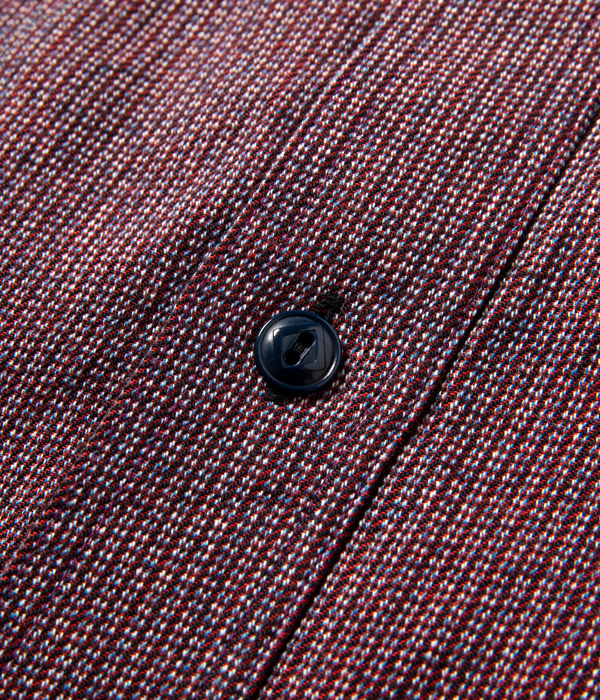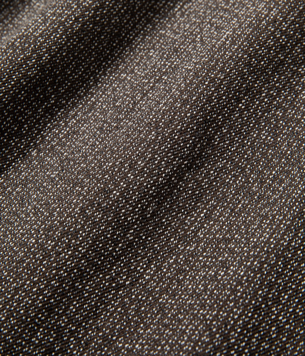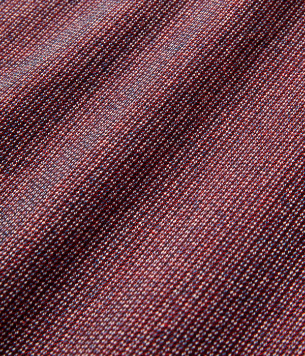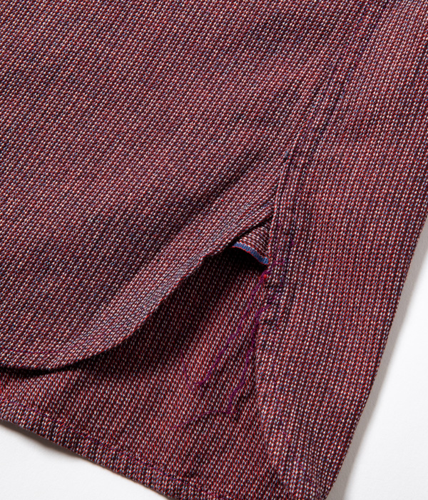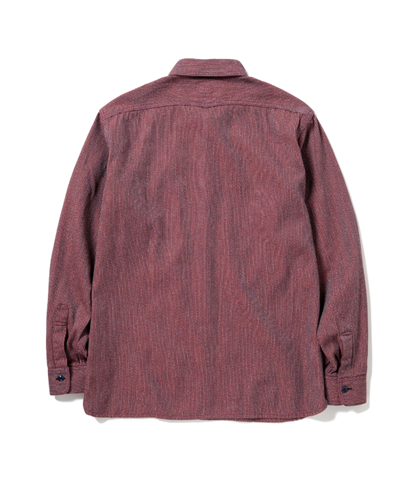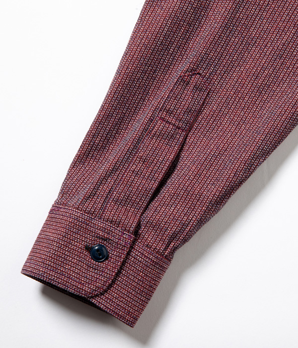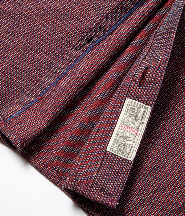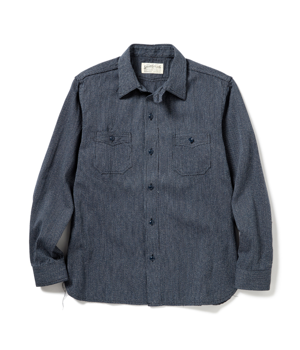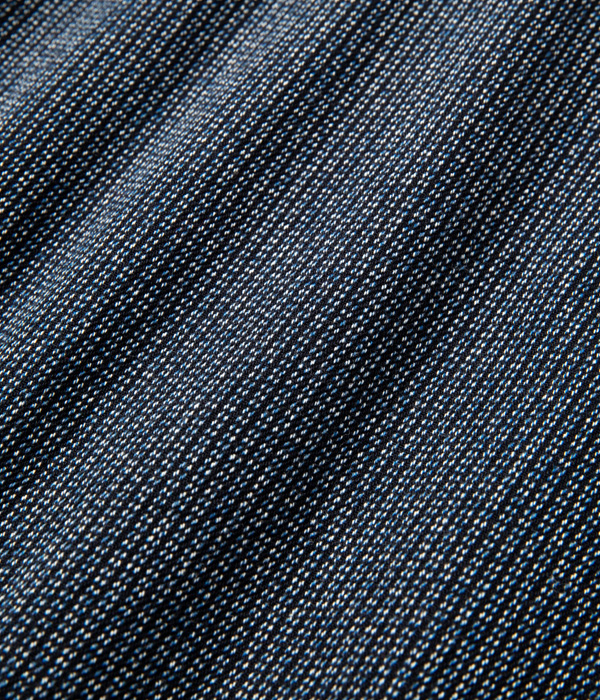 本来のヴィンテージではウール×コットンのラッセル編みであるビーチクロス生地を、インディゴ糸を使いコットンの織りでアレンジして再現。襟のバタつきを抑えるために台襟から飛び出した小ぶりのチンストラップや、戦前のワークシャツにみられるウエスタンシャツのようなヨークが特徴。前立て裏と脇の力布にセルビッジを使用している。