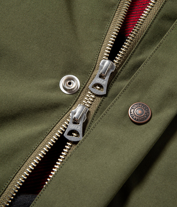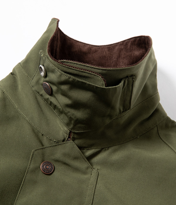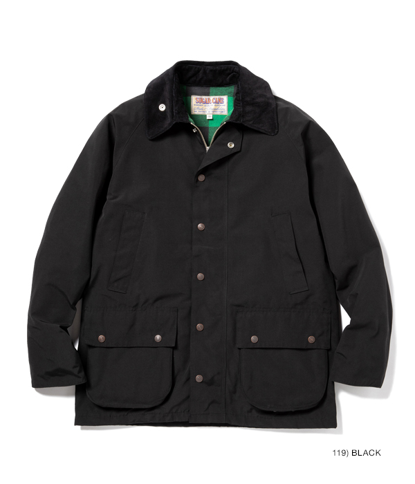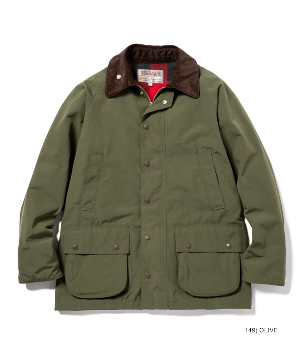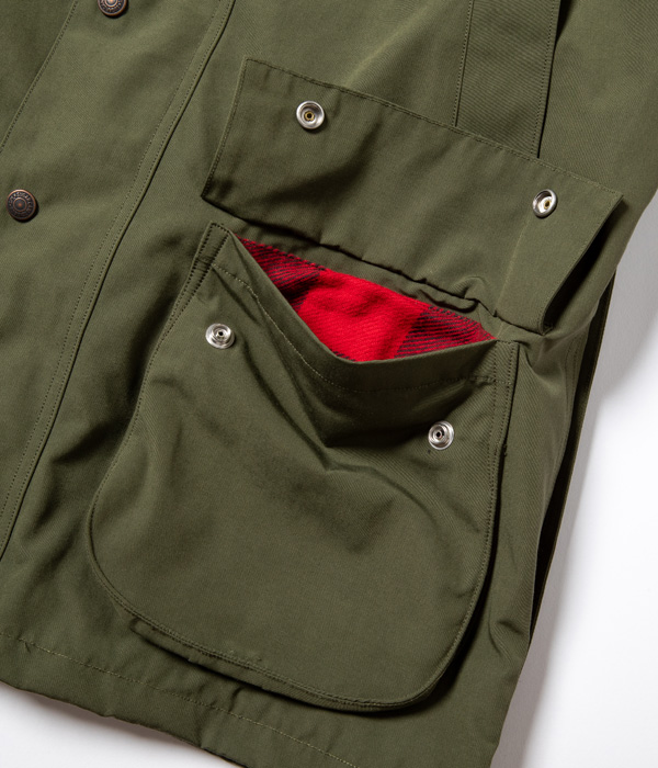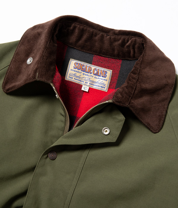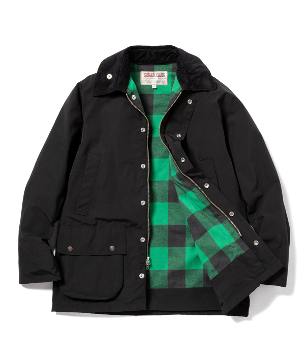 ヨーロッパでは定番的な型のクルーザージャケット。表地のテトロン(ポリエステル)コットン生地には軽い防水性があり、保温性を考慮して裏地をバッファローチェック生地、襟はコーデュロイで切り替えている。フロントは裾のもたつきを抑えるダブルジップ仕様で、背中にはファスナー開閉式のゲームポケットも搭載。