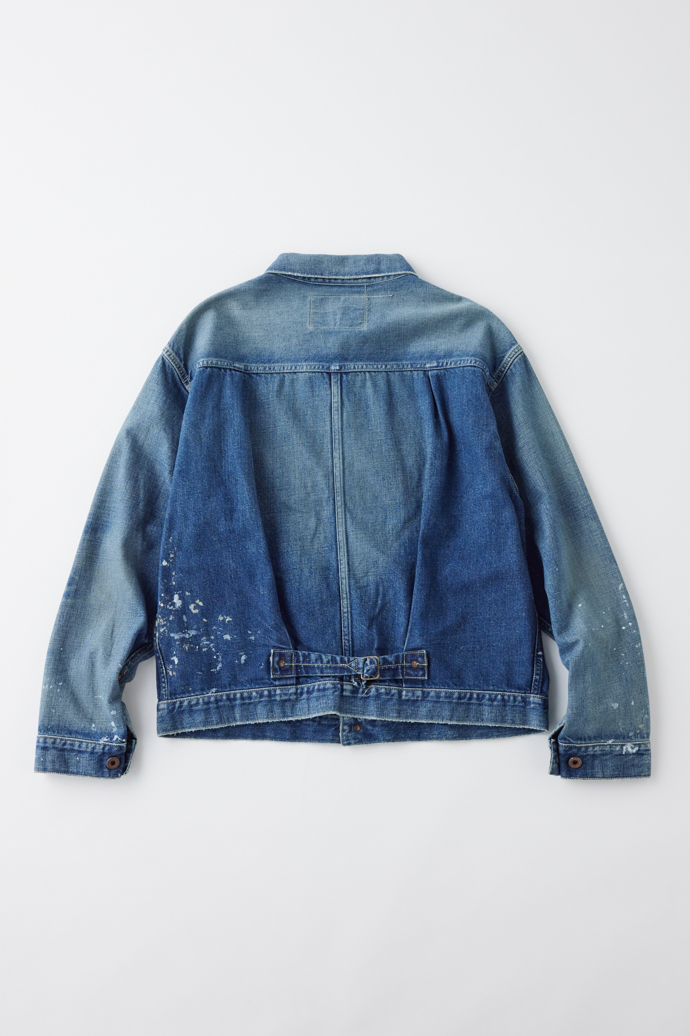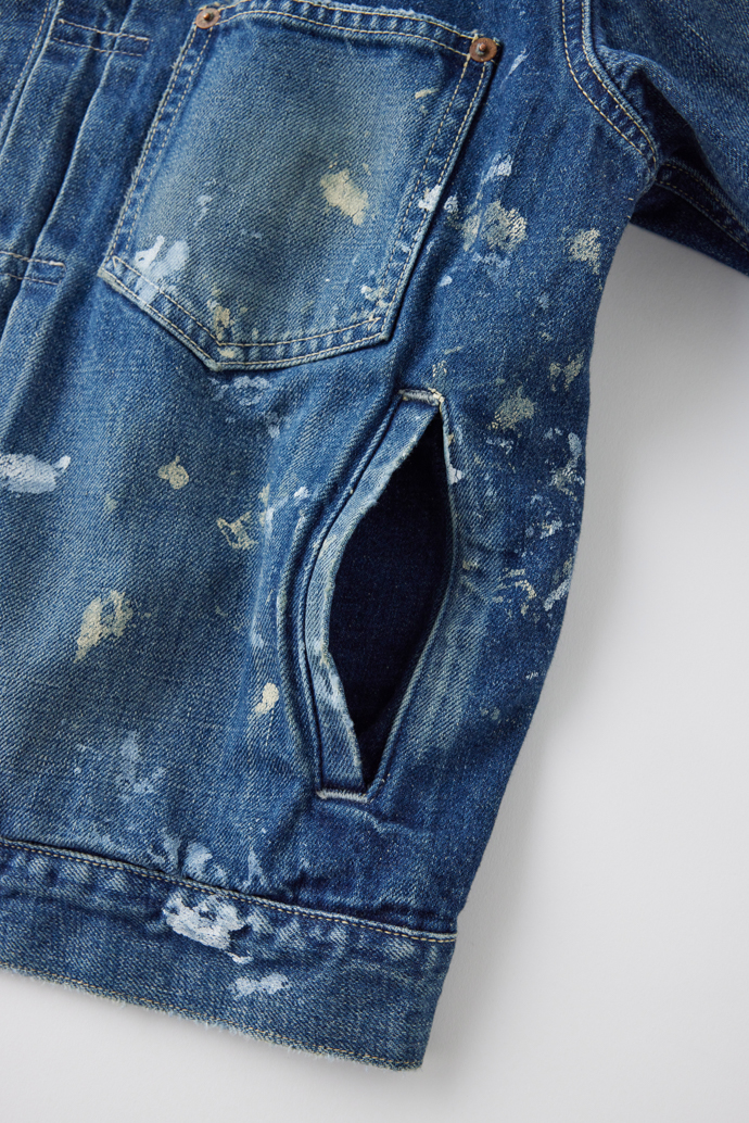 今回のデニムジャケットは大戦モデルと呼ばれる、第二次世界大戦中の物資統制に基づいたディテールを採用。ヴィンテージでは大きいサイズにだけみられる、希少価値の高い背中心の接ぎ(スプリットバック)のディテールを全てのサイズに取り入れている。goldでは、オリジナルにはないハンドウォームポケットを配備し、より現代的なスタイルで着られるようアップデートした。
