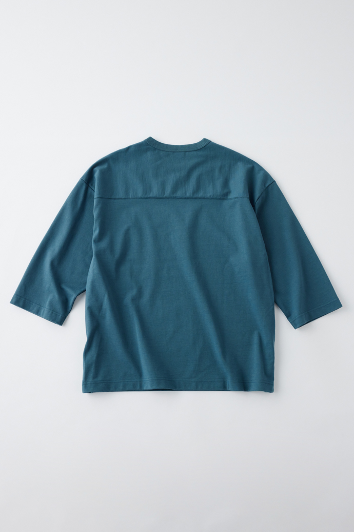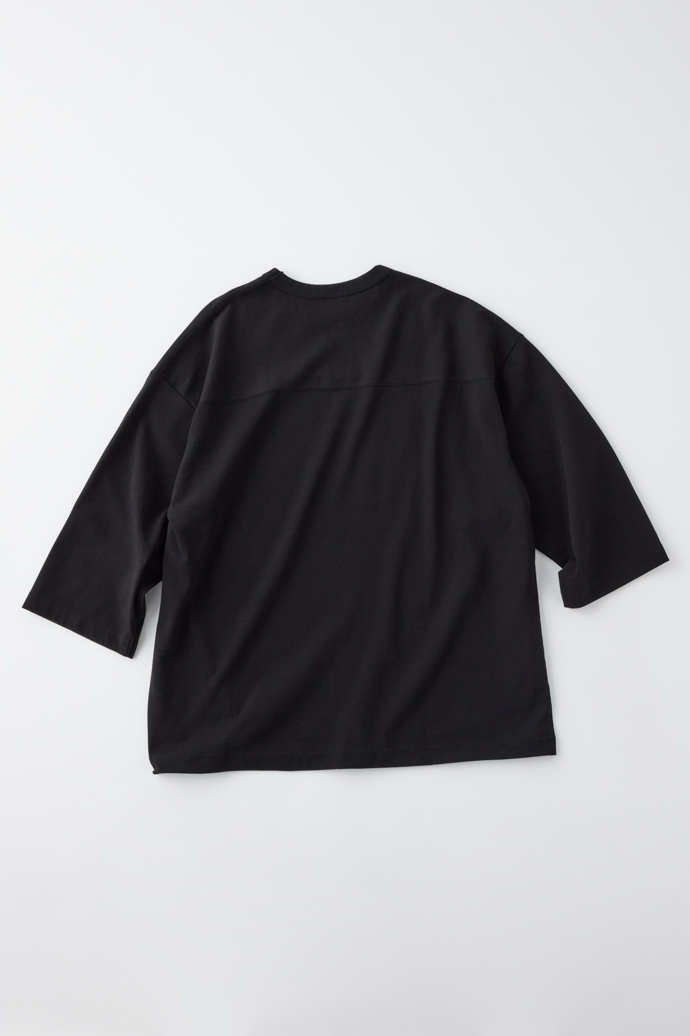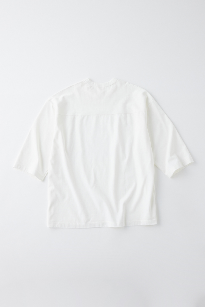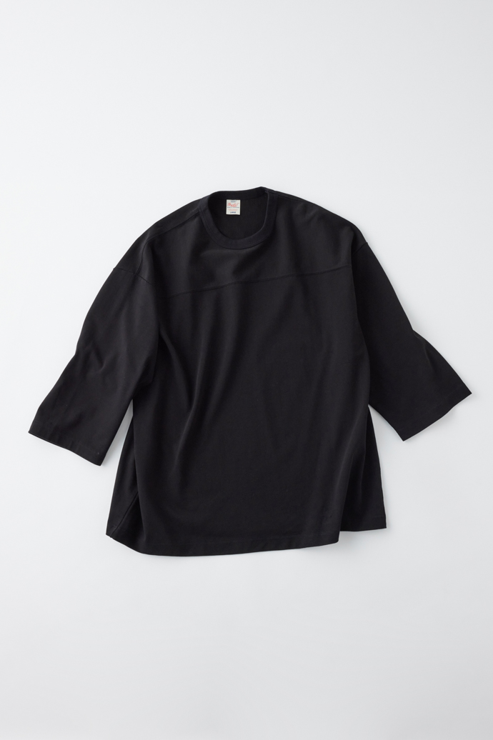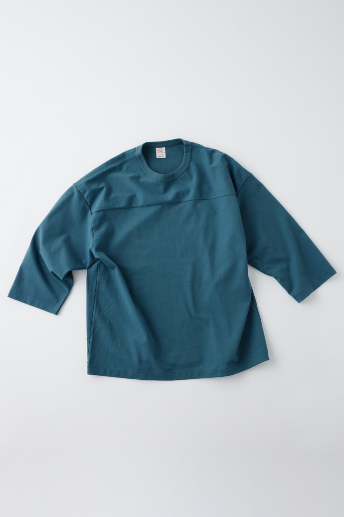 アメフトで運動量の多い肩部分の素材を切り替えていたことに倣い、ショルダー部分のみヨコ地の目を使用。