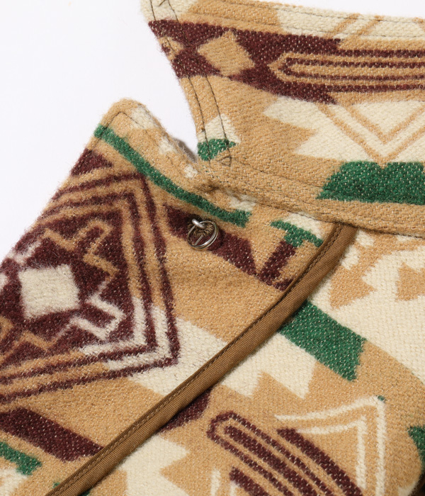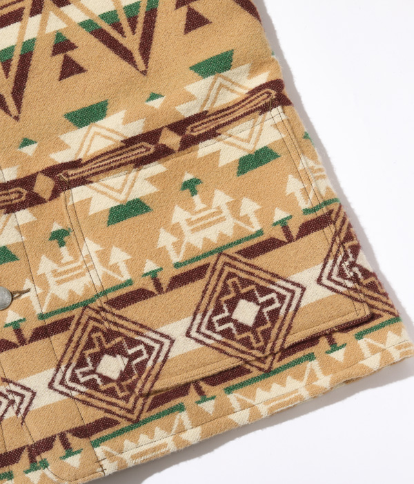 日本が世界に誇る毛織物産地「尾州」で生産したネイティブ柄のコットンウールブランケット。コットン30番手双糸、緯糸にウールの8番手双糸を使用した二重織りのブランケット生地はヴィンテージのブランケットをもとに糸番手から分析して再現したもの。ウール糸は起毛しやすく保温性に優れた紡毛糸を採用。ヴィンテージのような質感を再現するため、ジャガード機でゆっくりと時間をかけて織り上げている。ウールのジャガード織機は国内でも数台しかないうえ、織機を低速で動かして入るため1日に織り上げられる生地はごくわずか。長年毛織物に携わってきた尾州の職人たちにより、手間暇を惜しまず作られた良質なブランケットに仕上がっている。型は1940年代のワークコートで、丁寧に柄合わせされたポケットや鈍い光を放つコンチョボタンも特徴。今回はデニムパンツのインディゴブルーと相性が良いベージュカラーを採用した。
