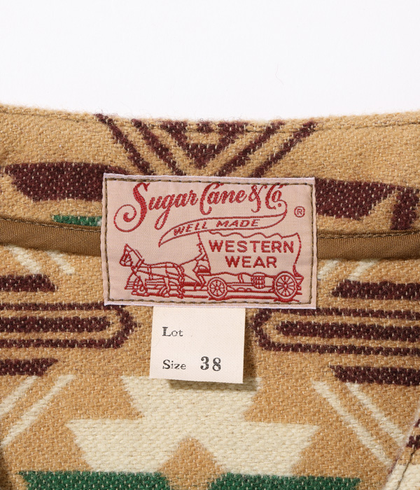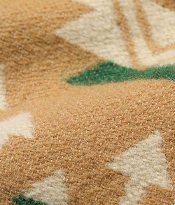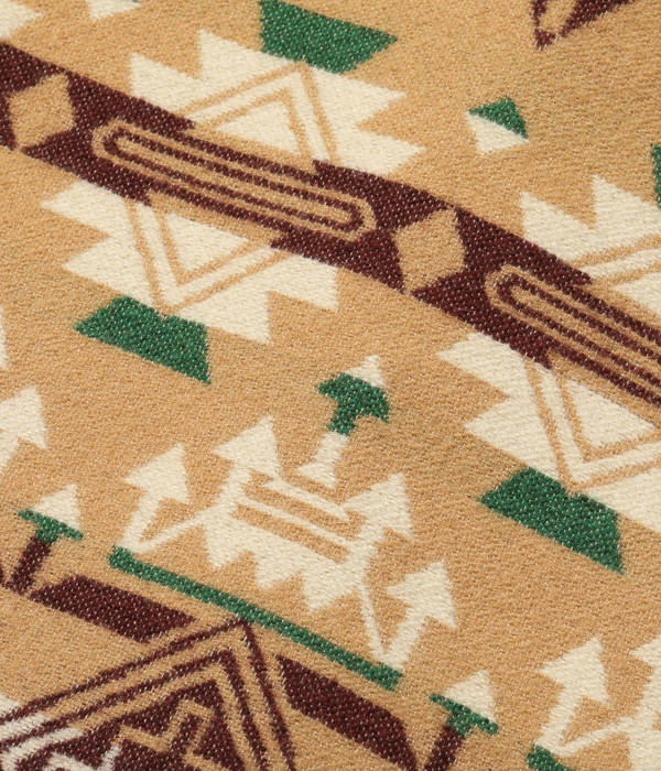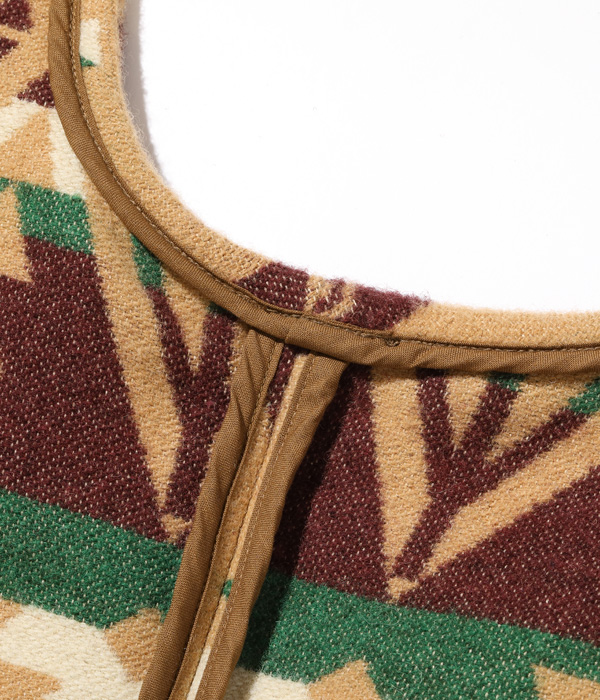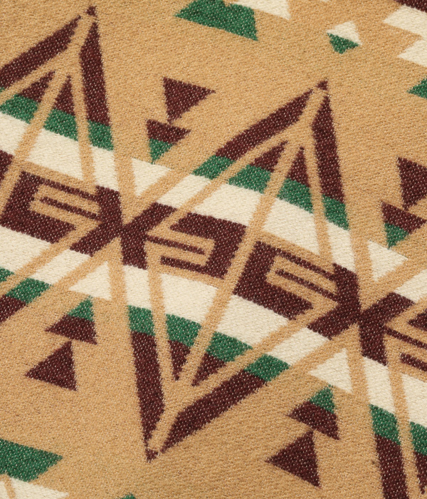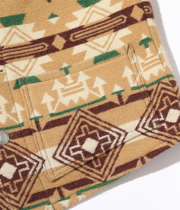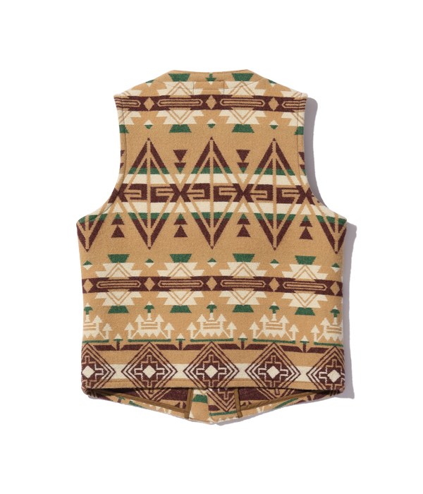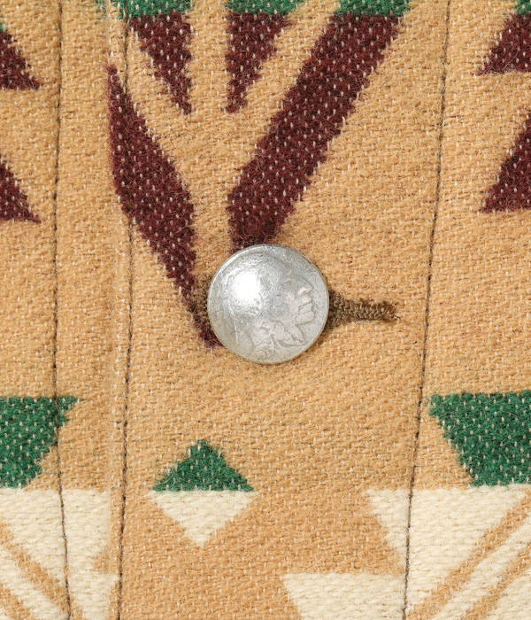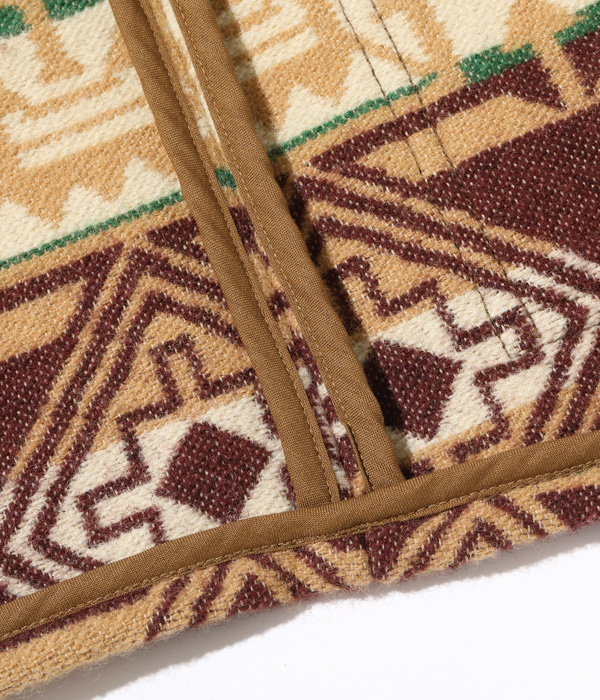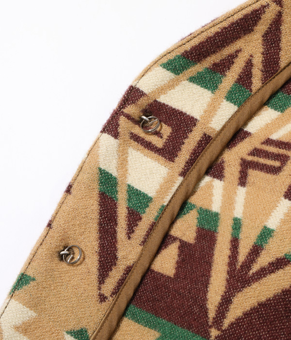 日本が世界に誇る毛織物産地「尾州」で生産したネイティブ柄のコットンウールブランケット。コットン30番手双糸、緯糸にウールの8番手双糸を使用した二重織りのブランケット生地はヴィンテージのブランケットをもとに糸番手から分析して再現したもの。ウール糸は起毛しやすく保温性に優れた紡毛糸を採用。ヴィンテージのような質感を再現するため、ジャガード機でゆっくりと時間をかけて織り上げている。ウールのジャガード織機は国内でも数台しかないうえ、織機を低速で動かして入るため1日に織り上げられる生地はごくわずか。長年毛織物に携わってきた尾州の職人たちにより、手間暇を惜しまず作られた良質なブランケットに仕上がっている。型はヴィンテージのチマヨベストをベースとしており、縫製部分はサテン生地のパイピング仕様。決まった箇所に出るようマーキング(図入れ)をした手間のかかる裁断・縫製を行っている。フロントにはコンチョボタンを採用。今回はデニムパンツのインディゴブルーと相性が良いベージュカラーを採用した。
