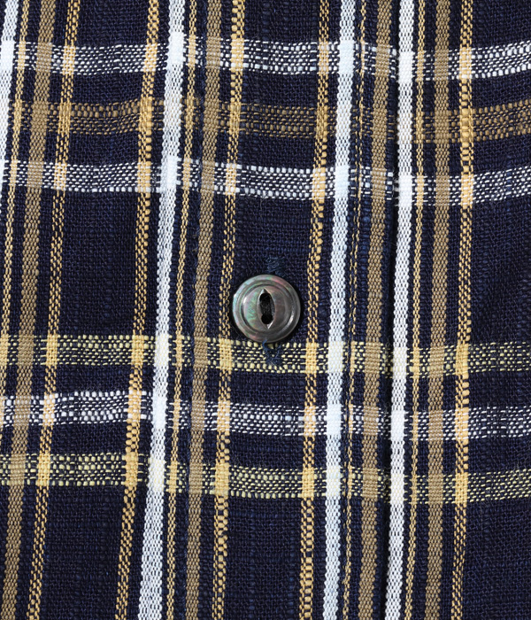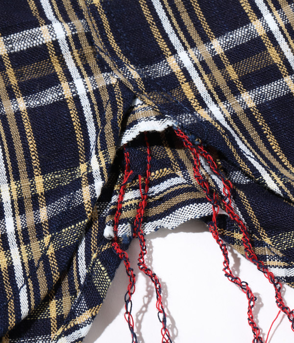 生地幅が33cmしかない和装用の藍染古布をサンプリングして糸の質や柄はそのままに、生地幅を約3倍に調整してシャトル織機で作製。袖口の剣ボロはバインダー仕様で、剣ボロが一枚続きのワンピース仕立てのため耐久性にも優れた仕上がり。背ヨークや裾裏のユニオンチケット、脇裾の空環仕上げが特徴的で、猫目型の黒蝶貝ボタンを採用している。