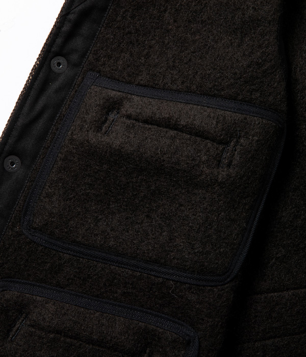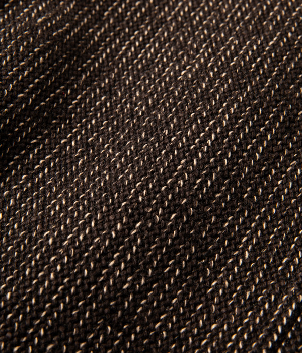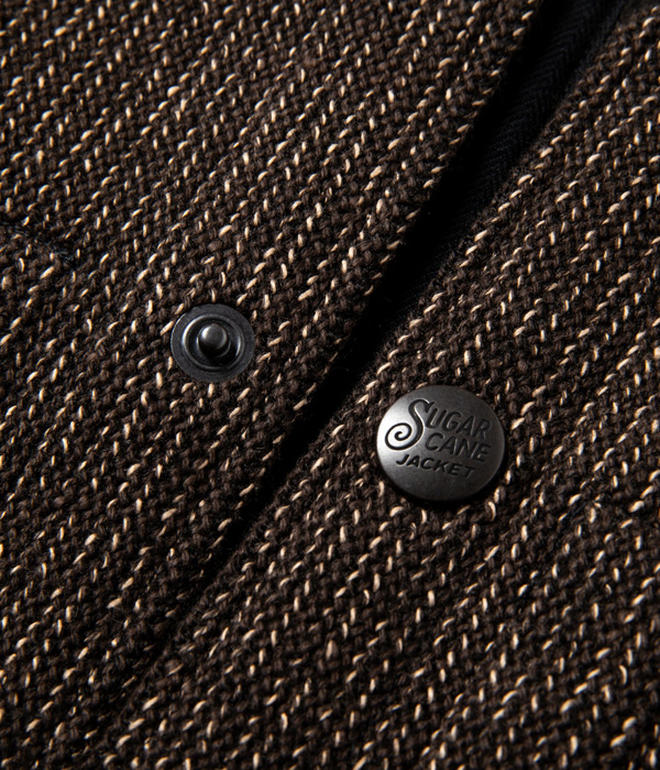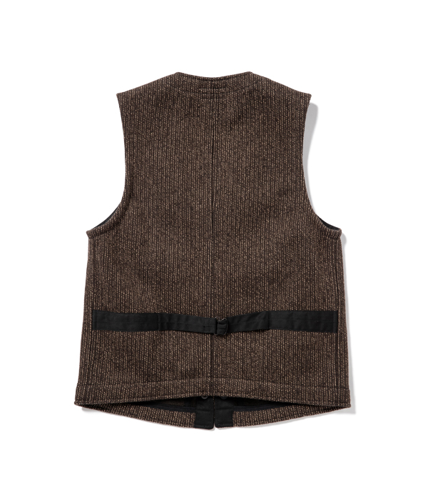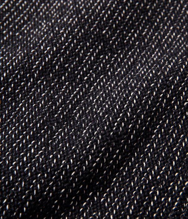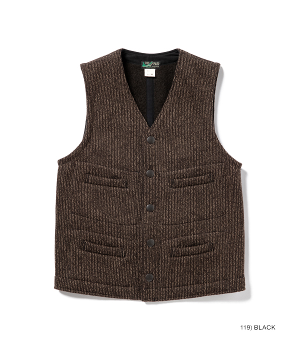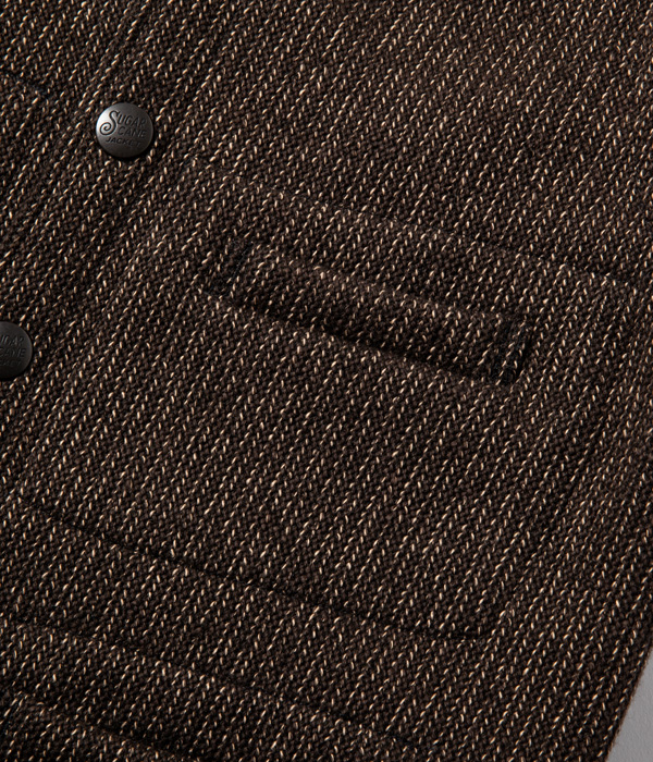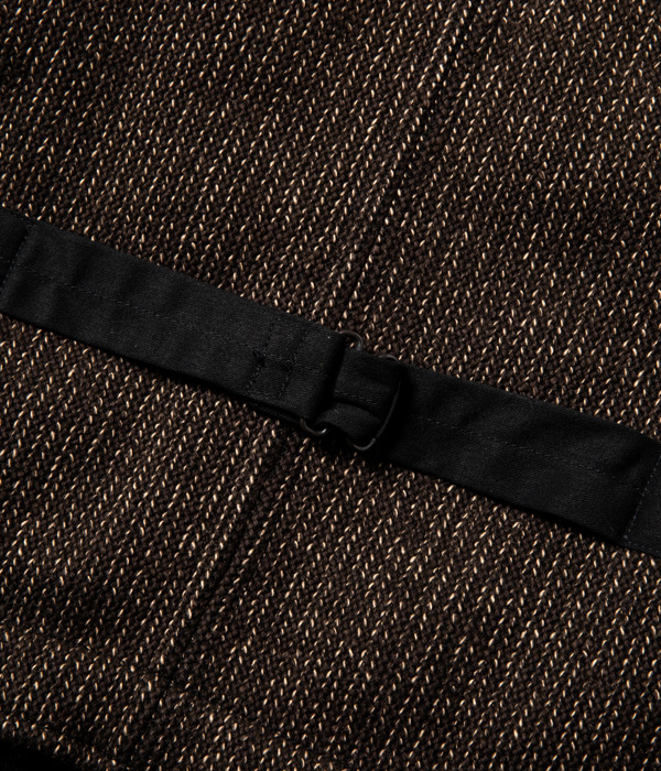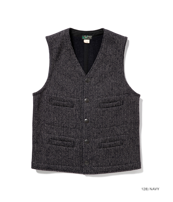 今季のビーチクロスベストは、パッチポケットのモデルではなくスラッシュポケットの1950年代モデルをベースにしている。裏側から袋地を当てているので表側にパイピングが現れず、シンプルな仕上がり。ヴィンテージに使われている独特な形状のスナップボタンも型から再現。