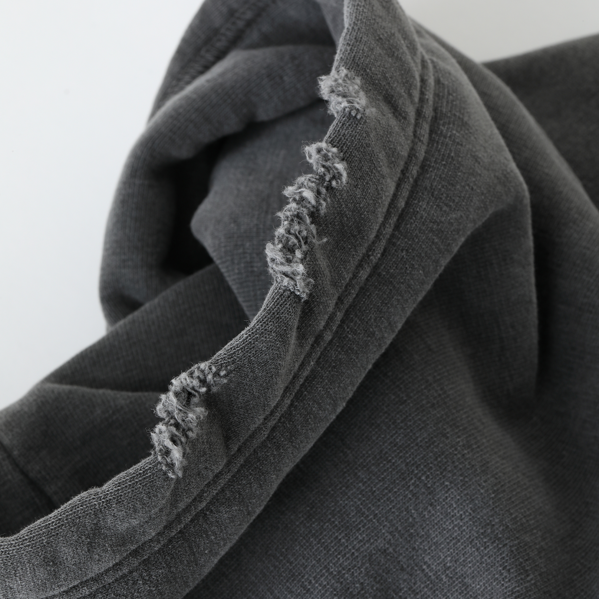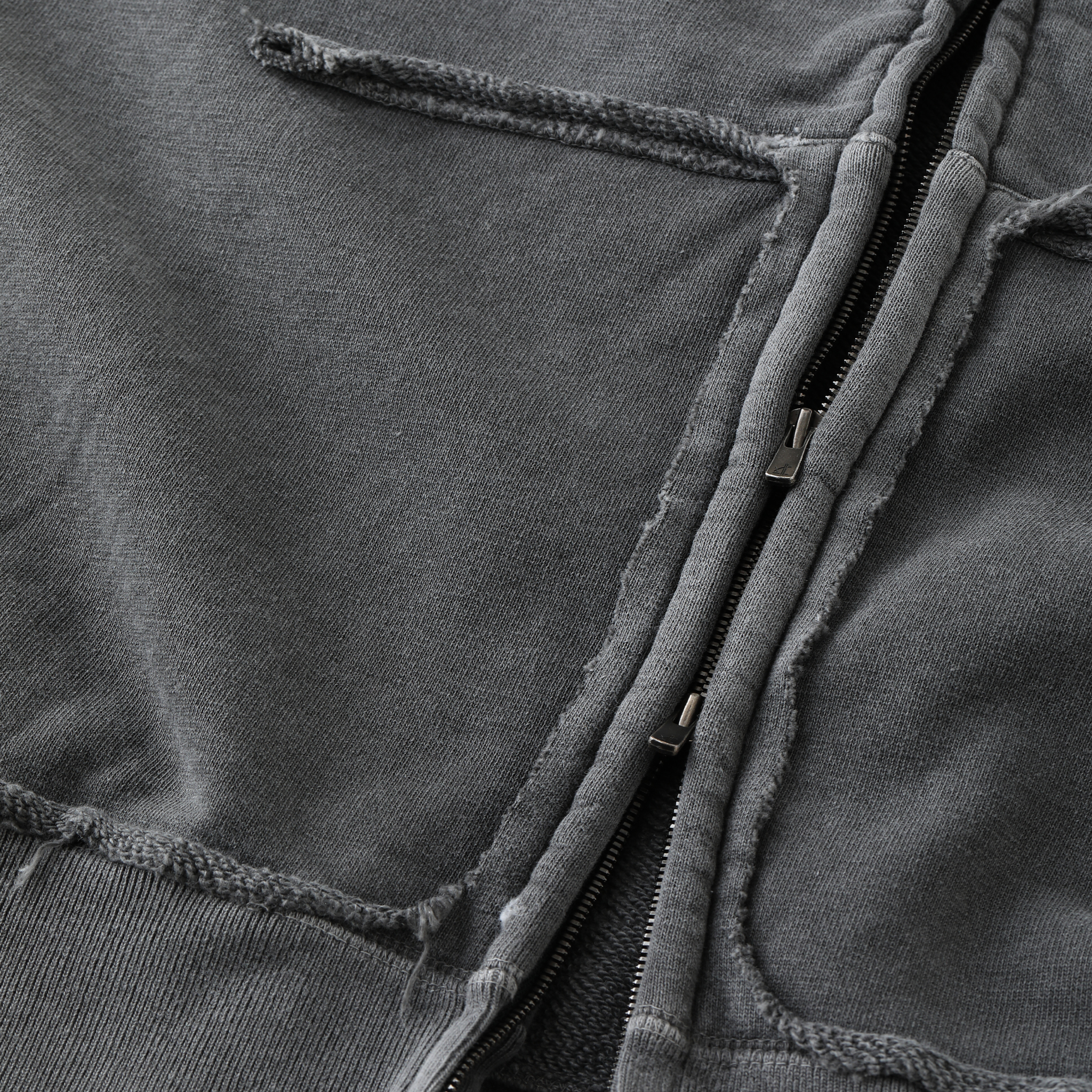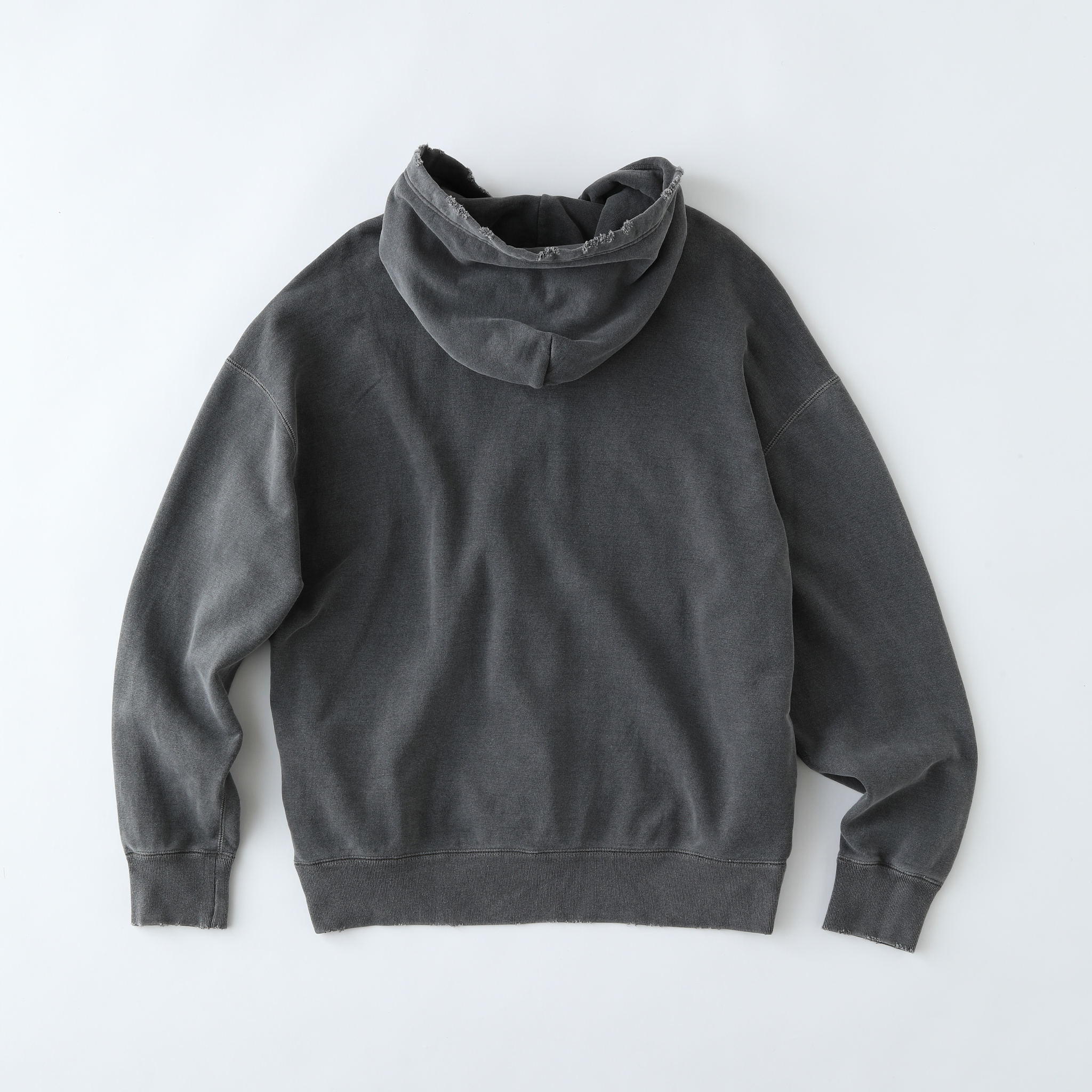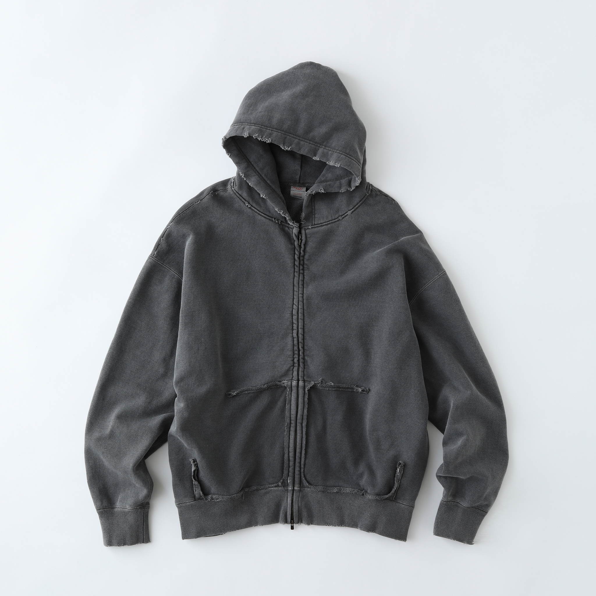 旧式の吊編み機でゆっくりと時間をかけ、目を詰めて編み立てた裏起毛スウェットは柔らかな風合いに優れ、かつタフな素材。ピグメント染めした生地に、ブリーチや手作業によるダメージ加工を施している。型はブランド定番のドロップショルダーで、身幅とアームホールに大きくゆとりをもたせたビッグシルエット。フロントはダブルタイプのEXCELLA®ファスナーを使用