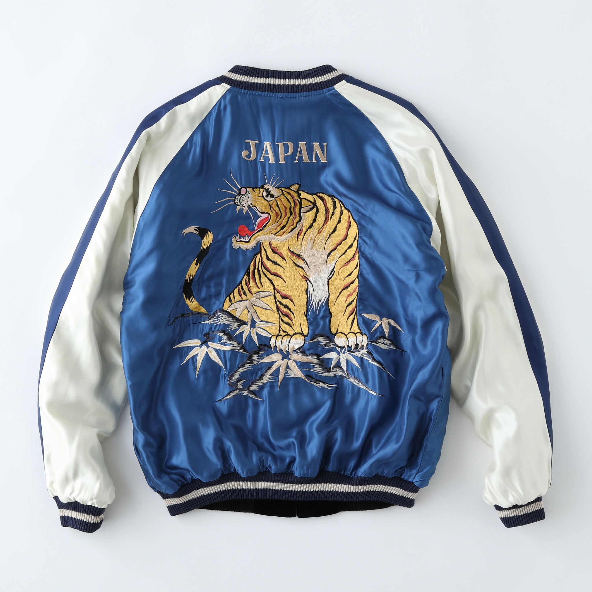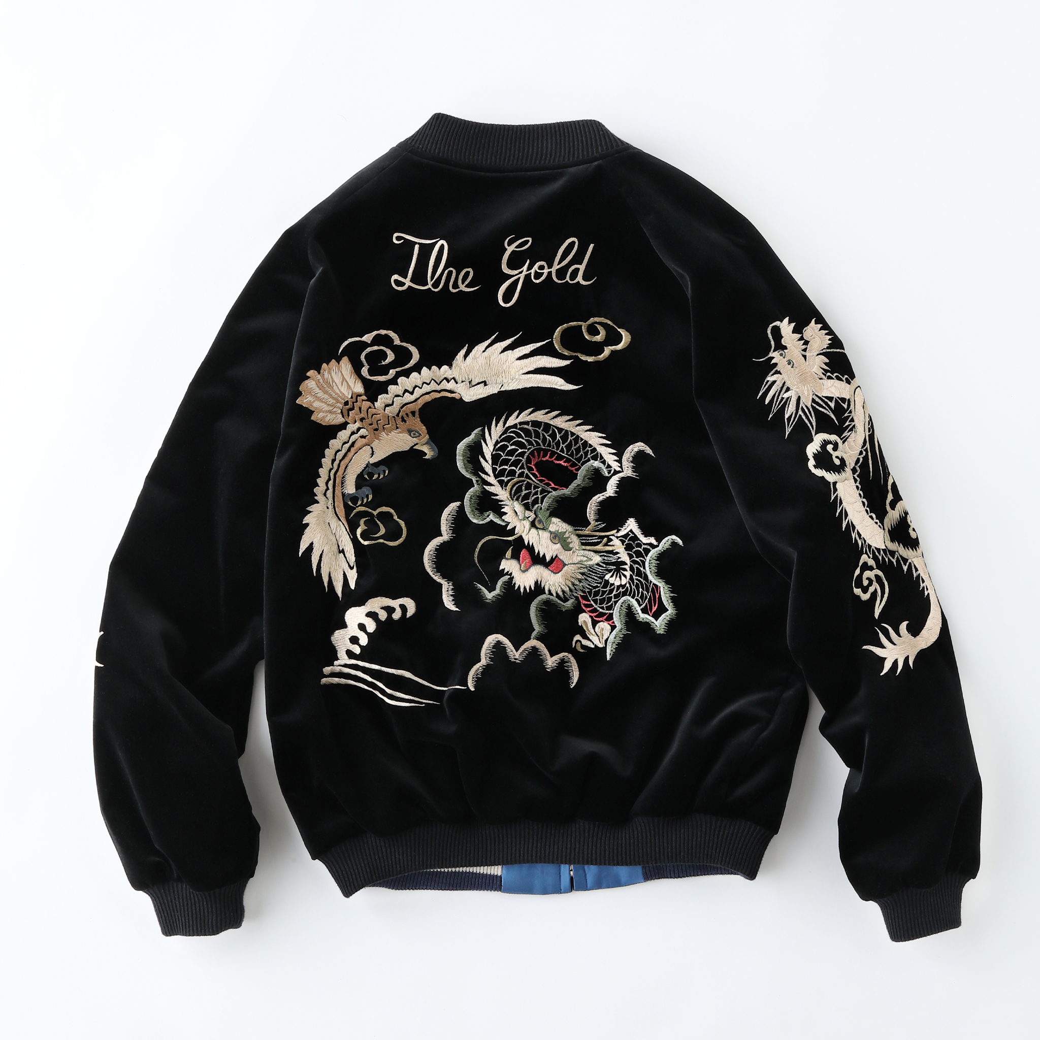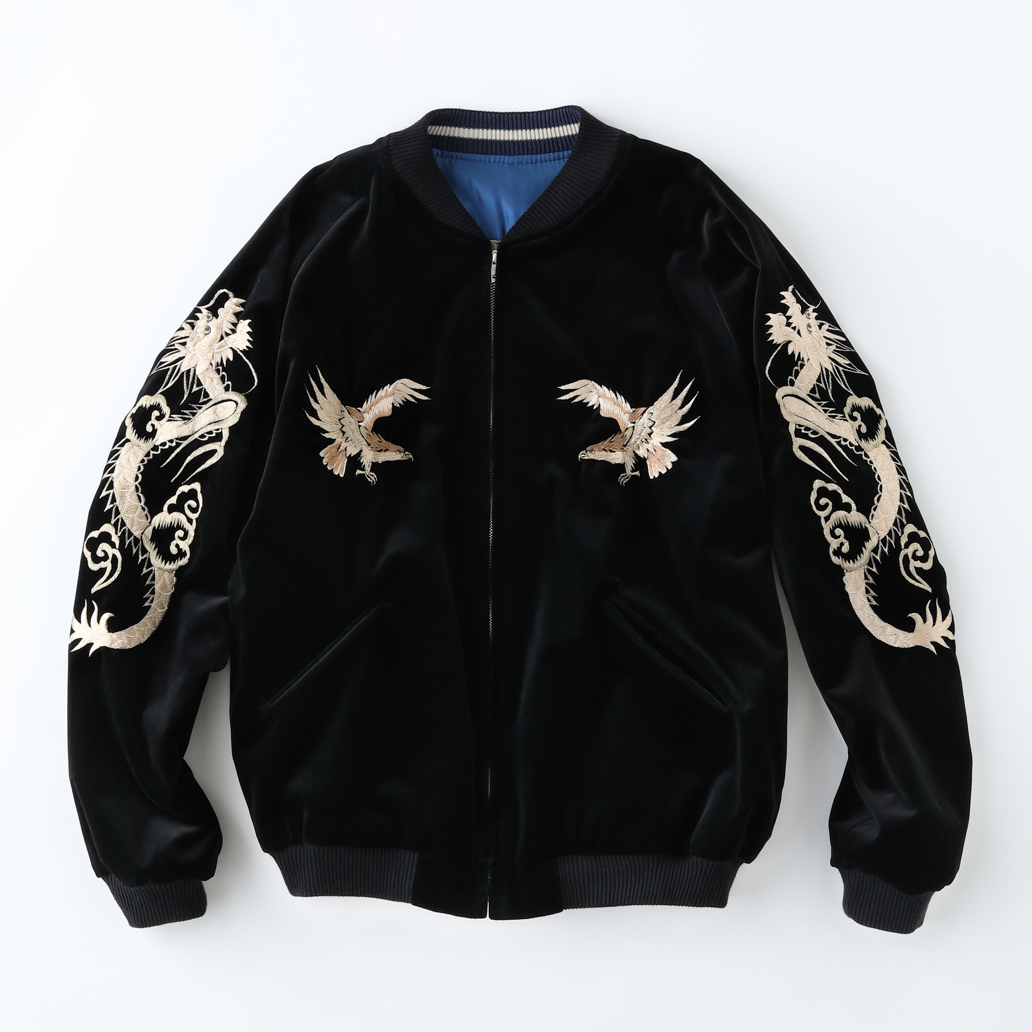 様々なヴィンテージスカジャンの中から刺繍、裁縫、部材などのディテールを倣い、生地の配色や柄を厳選した一着。別珍生地のヴィンテージスカジャンは、中綿やキルティングがされたものが多くみられるが、本作では中綿が入っていない非常に珍しいモデルがベースとなっている。通常、国名や地域名が入る背面の刺繍部分にはブランドロゴが配される。