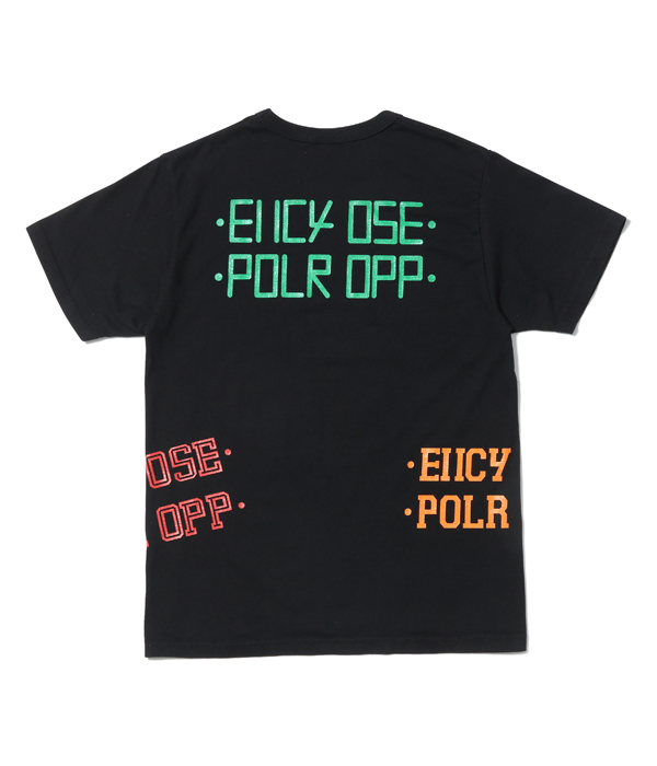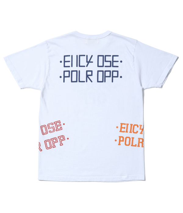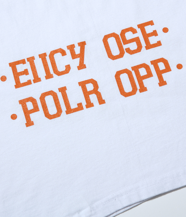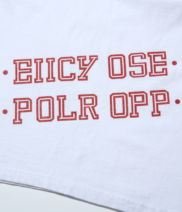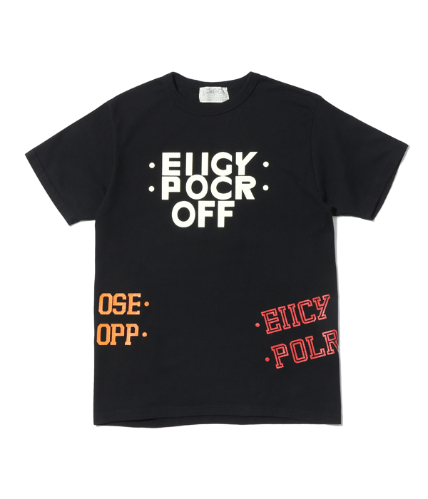通称「ギミックTシャツ」と呼ばれる古着のTシャツがベース。流行の始まりは不明だが、1970〜80年代に多くのメーカーが異なる書体、配色でプリントし、様々なバリエーションが作られた。デザインは一見、意味のない文字らしきものの羅列に見えるが、プリントの両端にある上下のドット同士を合わせると文字になる、という実にアメリカらしいギミックが仕込まれている。