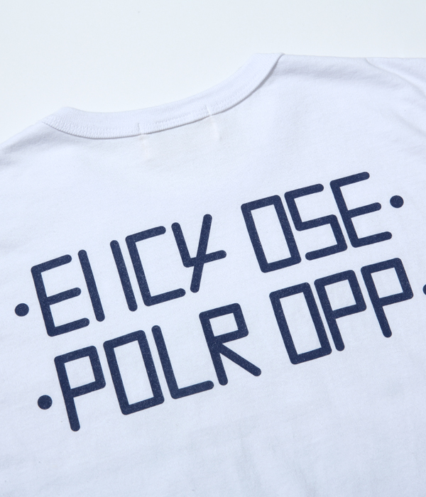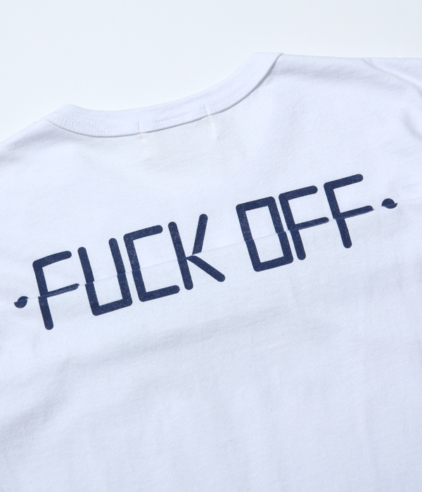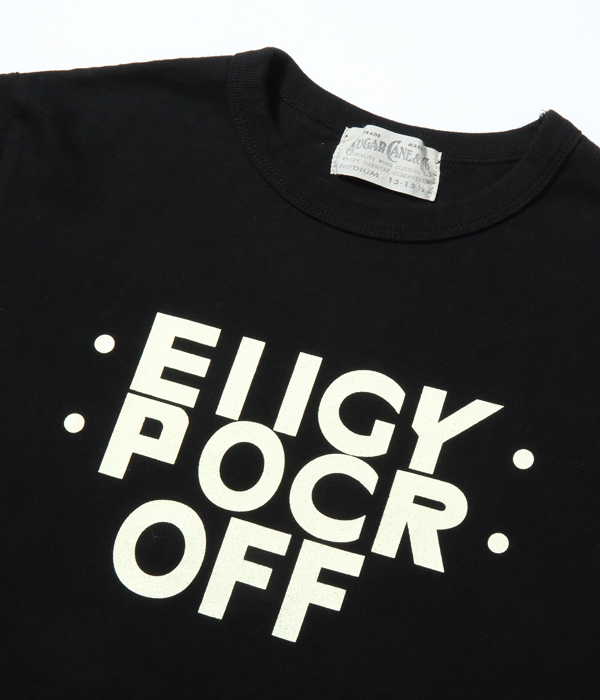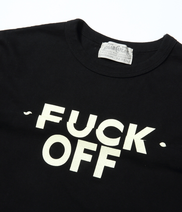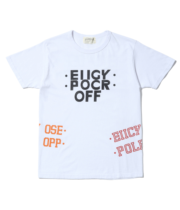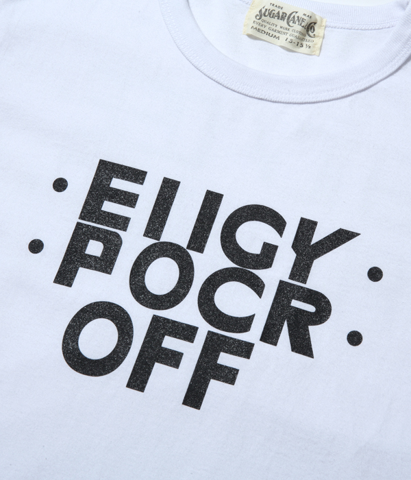 古着のギミックTシャツを集めてみると、書体や配色は異なれどプリントはフロント一箇所のみ。そのまま復刻するのは少々物足りないので、シュガーケーンではヴィンテージのテストプリントTシャツ(プリント工場で量産直前に色や版の最終確認用として試し刷りをしたTシャツ)を参考にして、選抜した4種類のプリントを前後と両脇に配置。1着のTシャツで4つの「ギミック」を楽しめるよう仕上げた。ボディはコットン100%の18番単糸で編み上げたチューブラ(丸胴)仕様のアメリカ製。