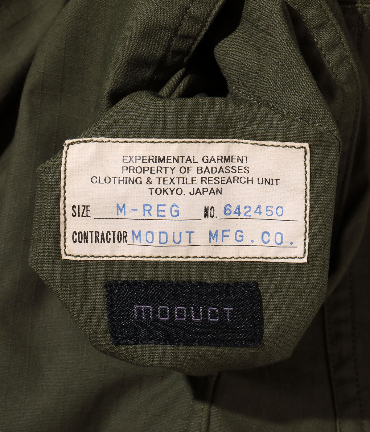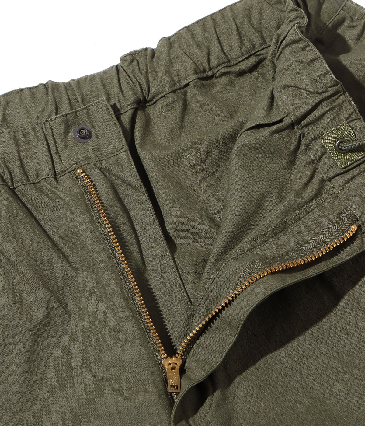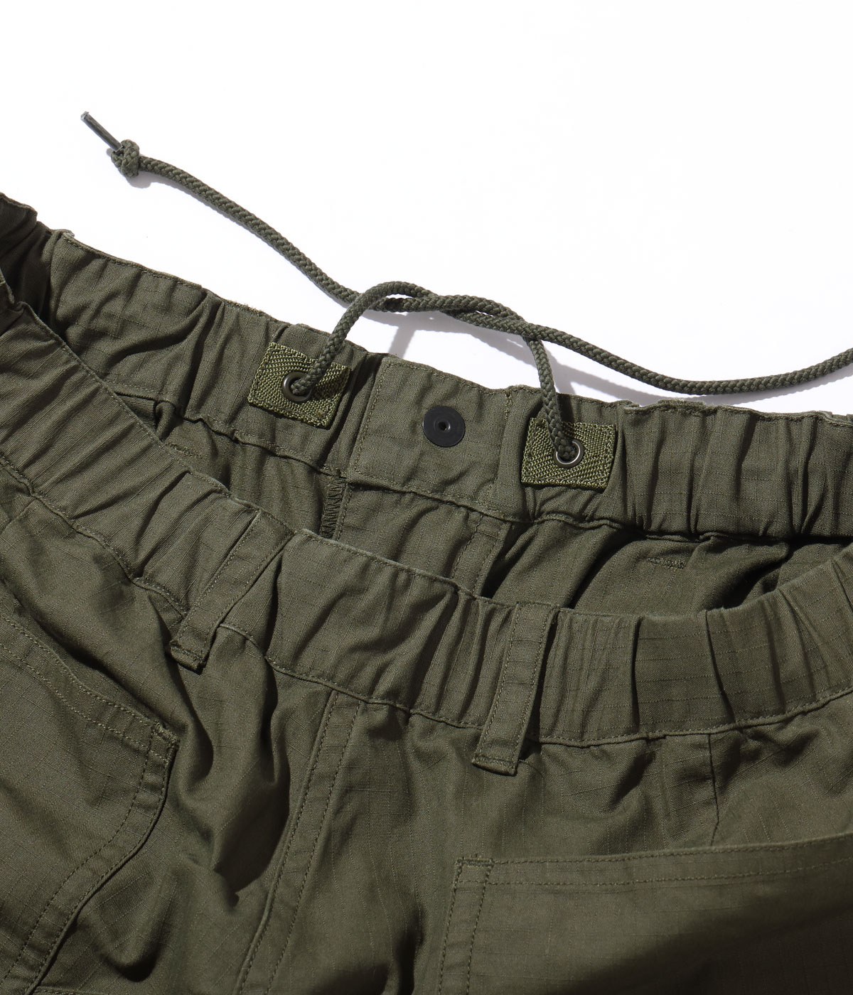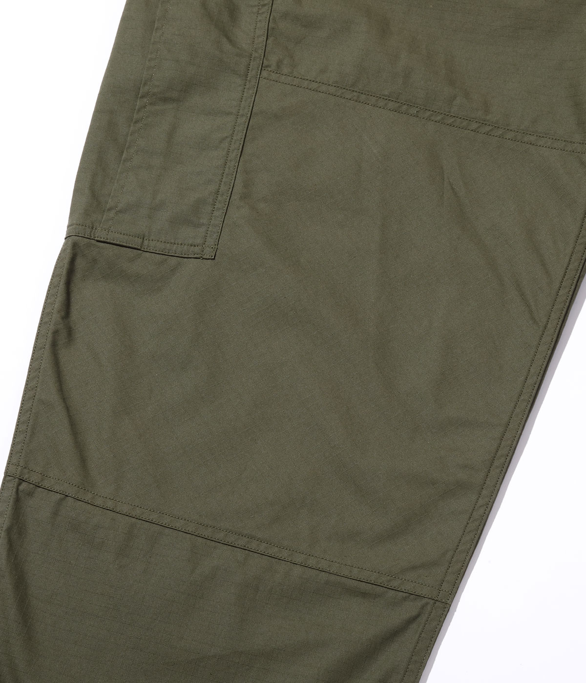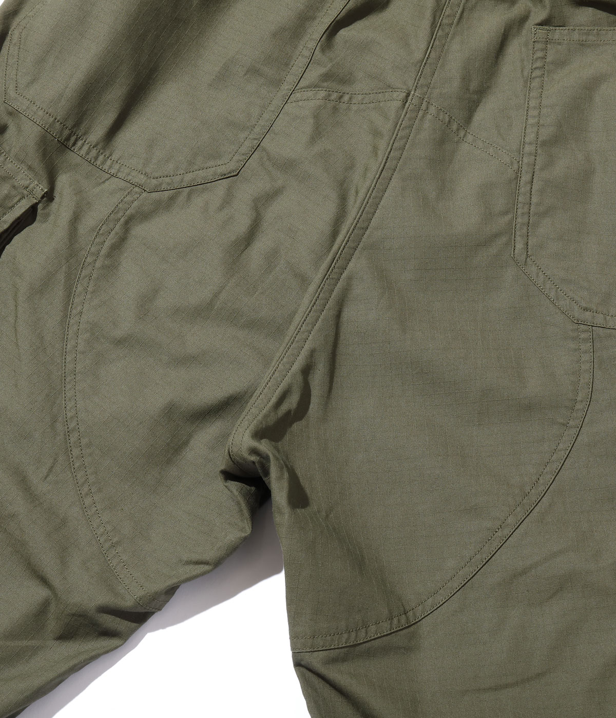 ブランドデビュー時にリリースしたMONKEY BUTT CARGO PANTSにマイナーチェンジを加えて製作。ウエストドローコードを内側へ移動し、後太腿の切り替えの排除、ベルトループの追加を行っている。尻当て布と膝当て布は二重仕立てで補強。しなやかなリップストップ生地は着用していくにつれ格子模様が浮かび上がり、硫化染めならではの経年変化が楽しめる。