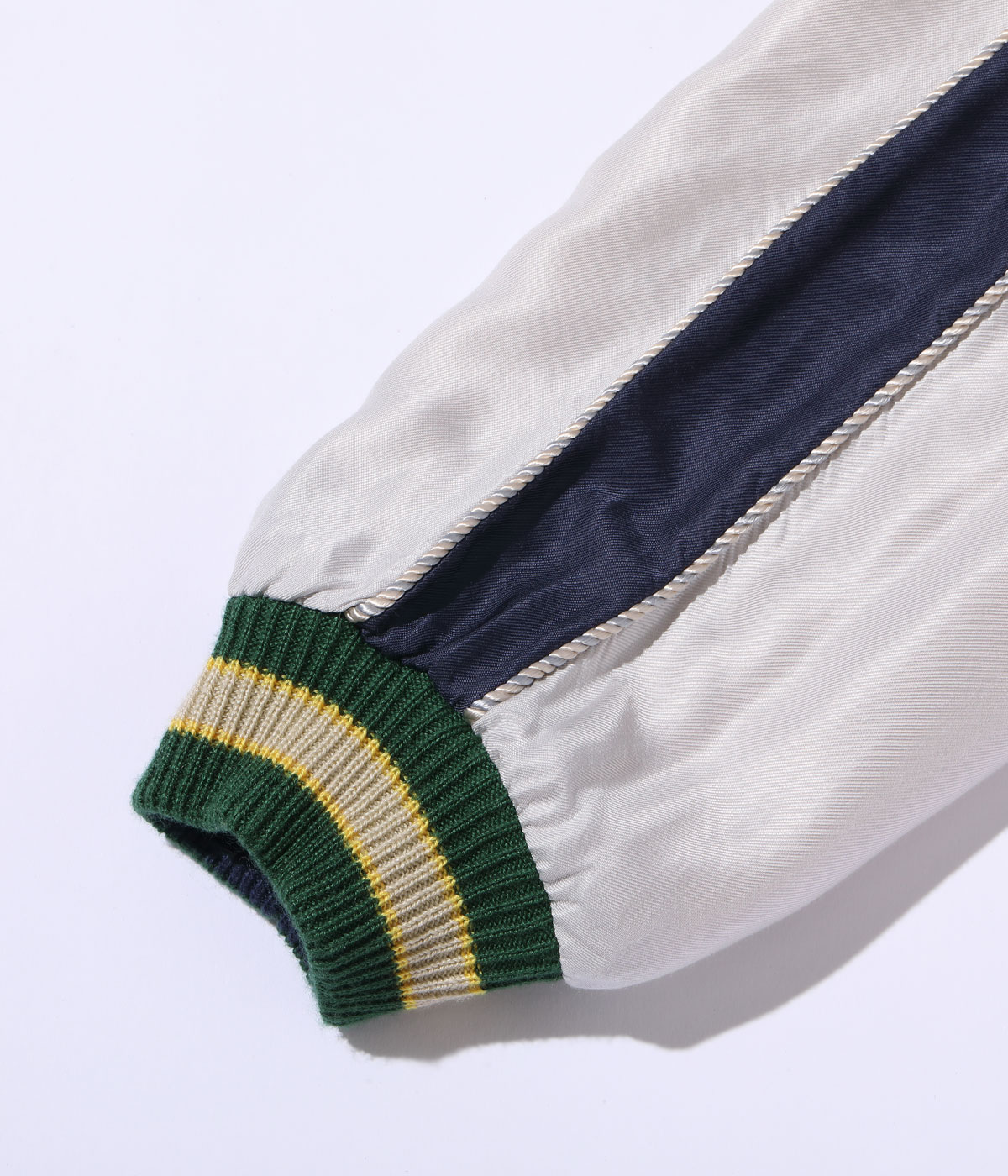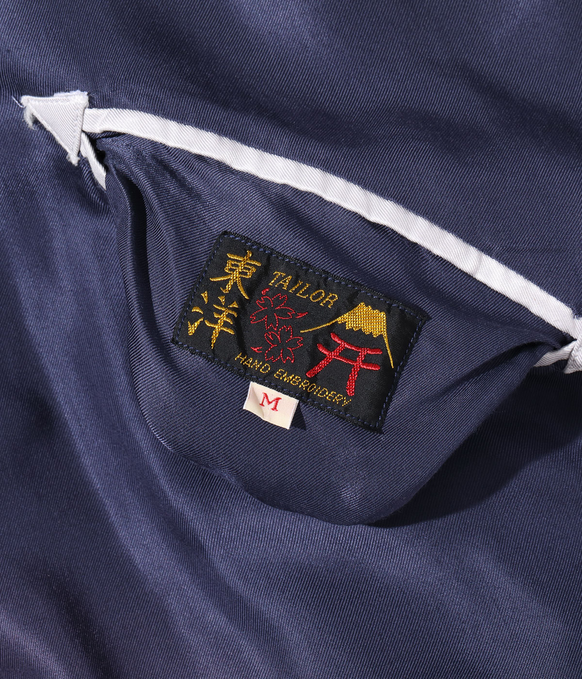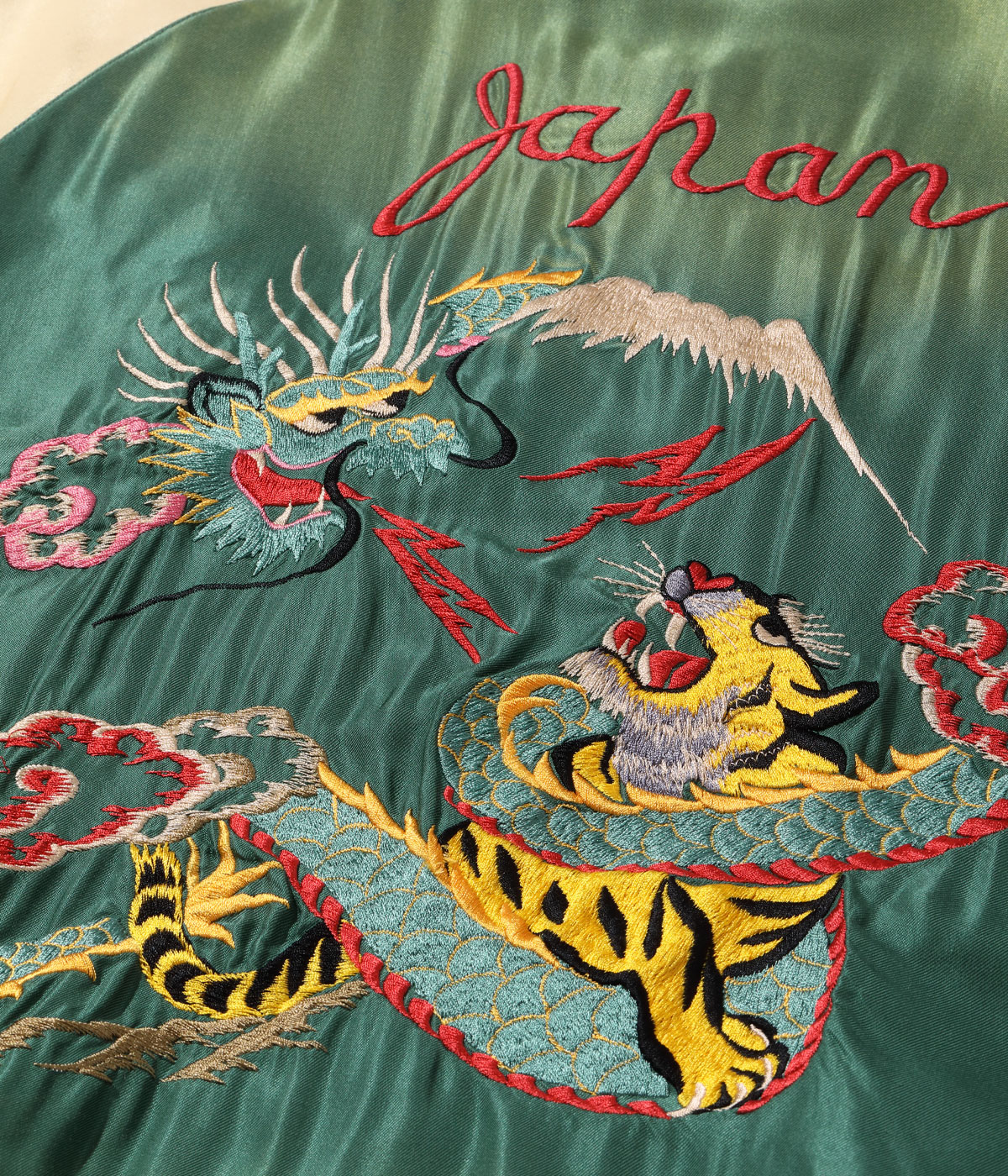 対してリバーシブル面のモチーフは龍虎対決。龍がその長い体躯で虎を締め付け、富士山の奥から顔を覗かせるという壮大なスケールの絵柄は他に類を見ない。さらに睨み合う両者の間に描かれた赤い稲妻が激戦の様相を呈している。本作では両面ともリブの配色が身頃の配色と逆に付けられているが、これはヴィンテージに見られる仕様のひとつ。リバーシブルというスカジャンならではの特徴を生かした当時の創意工夫も再現した。