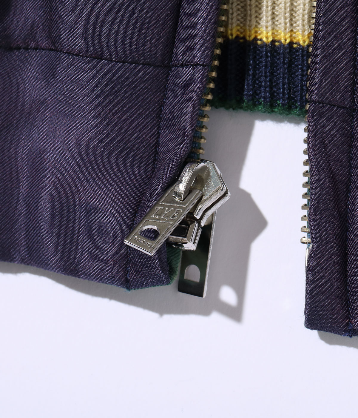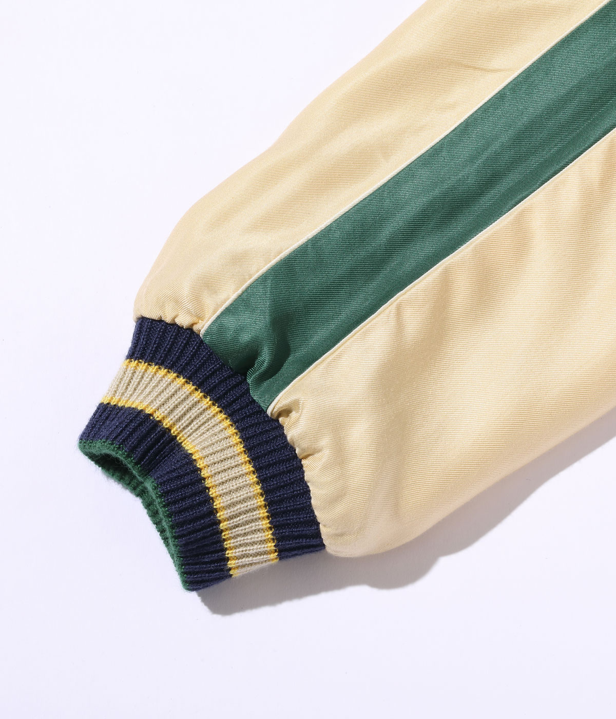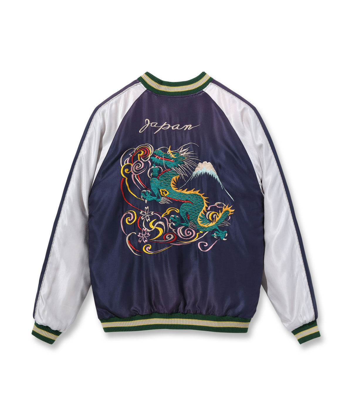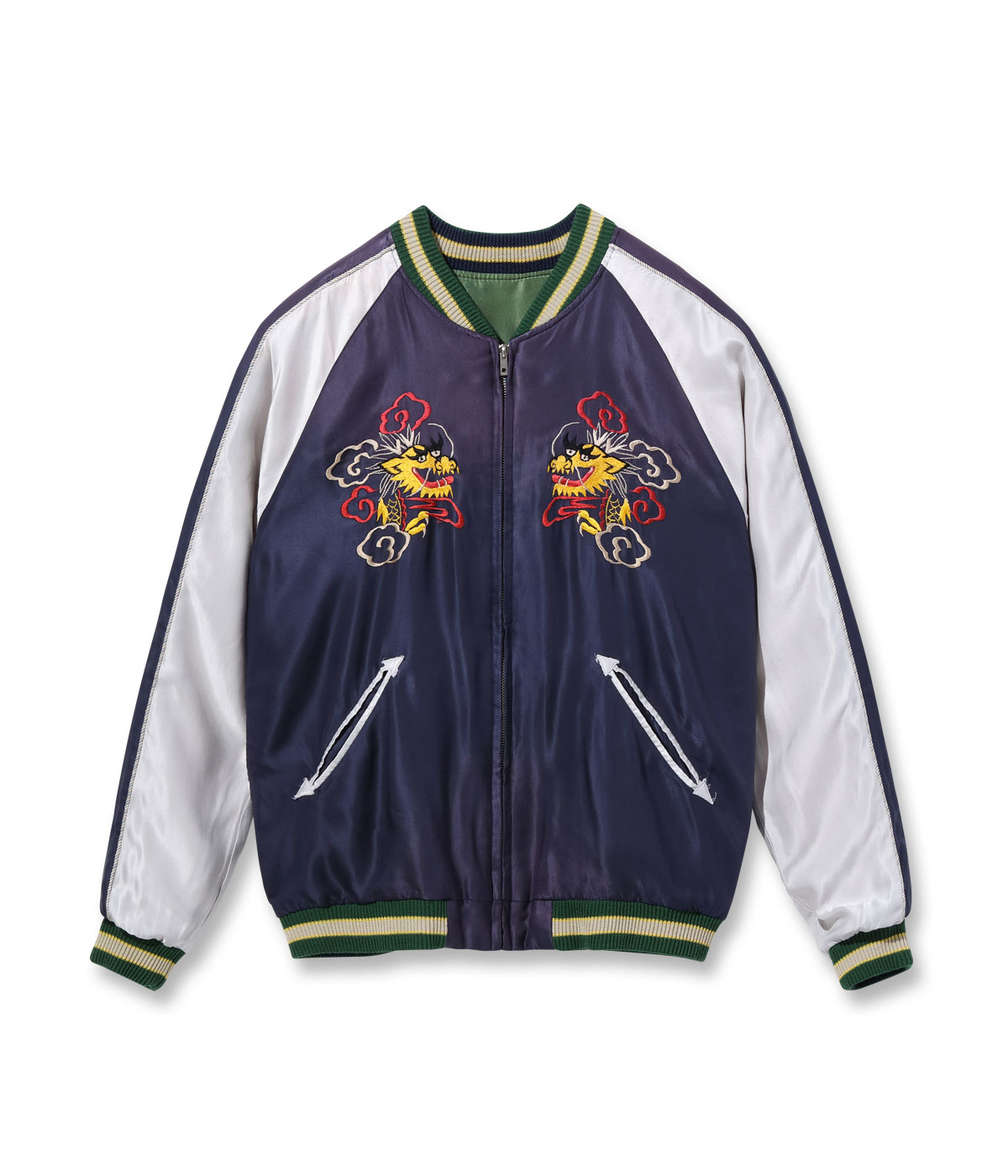対してリバーシブル面のモチーフは龍虎対決。龍がその長い体躯で虎を締め付け、富士山の奥から顔を覗かせるという壮大なスケールの絵柄は他に類を見ない。さらに睨み合う両者の間に描かれた赤い稲妻が激戦の様相を呈している。本作では両面ともリブの配色が身頃の配色と逆に付けられているが、これはヴィンテージに見られる仕様のひとつ。リバーシブルというスカジャンならではの特徴を生かした当時の創意工夫も再現した。