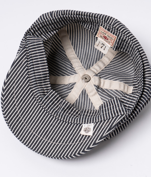 太番手の糸で織り上げたヒッコリーストライプ生地を使ったクラシカルな風合いのアップルジャックキャップは、ワークスタイルの仕上げに最適。ブリムにはソフトな芯地を使用し、6枚の生地をヘリンボーンテープで押さえた丁寧な作り。