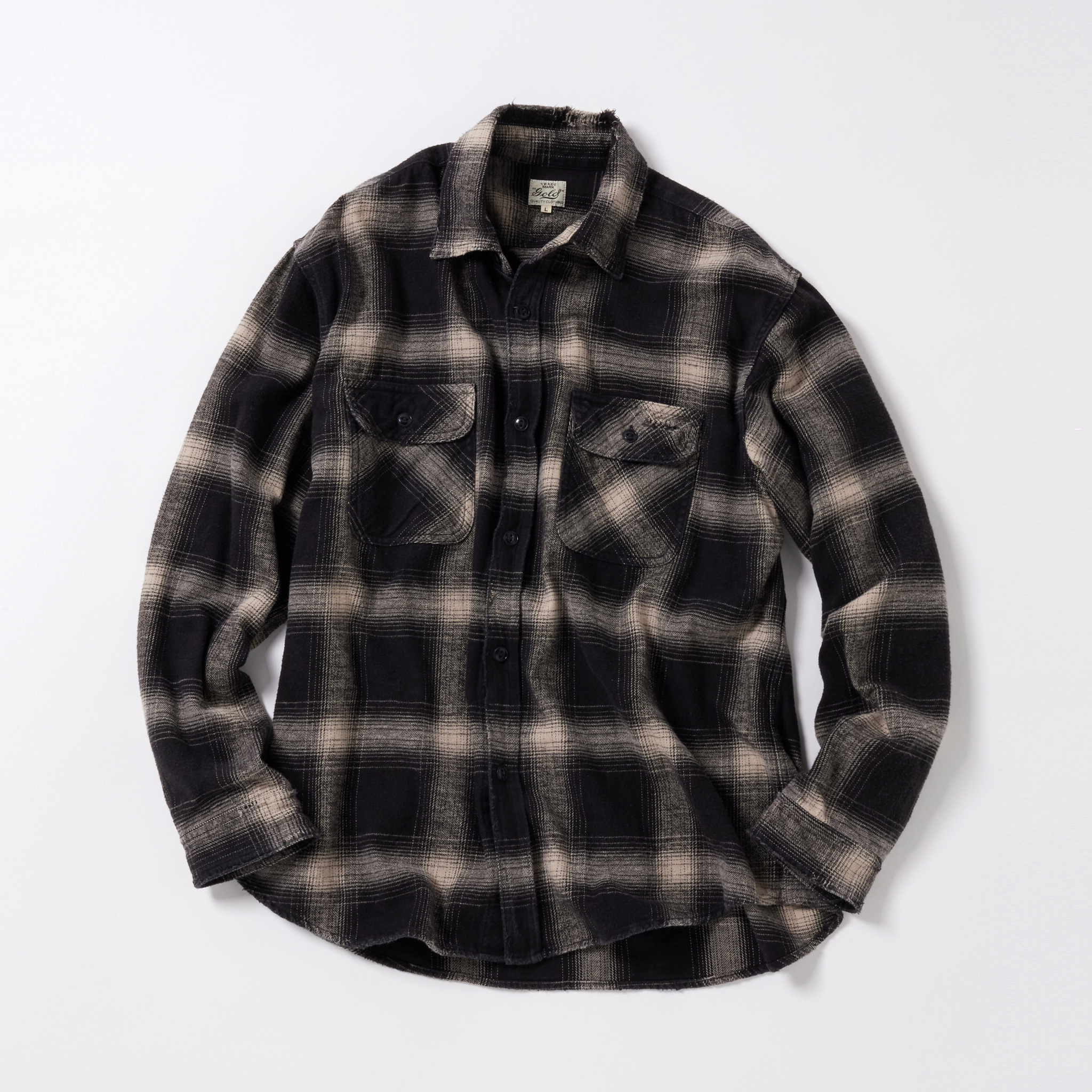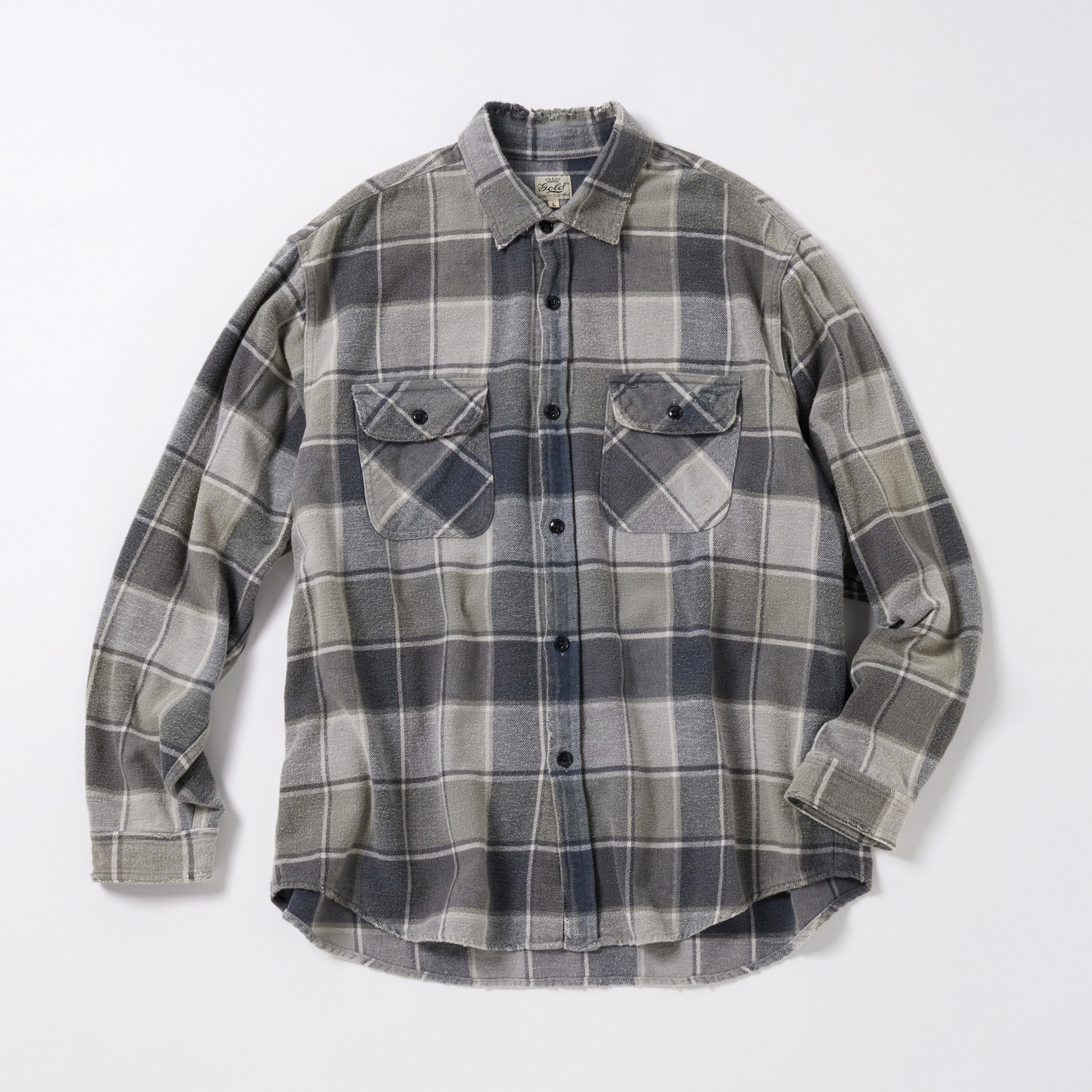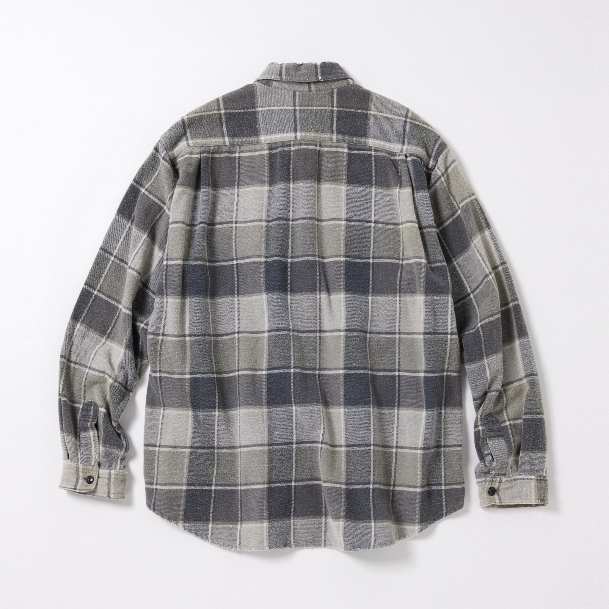 経糸20番手単糸×緯糸10番手単糸を甘く織り上げたオリジナルの先染めチェック素材を使用したワークシャツ。ブランド定番のややルーズめなシルエットになっている。全体的にフェードした色落ち加工とエッジ部分にダメージ加工を施した一着。