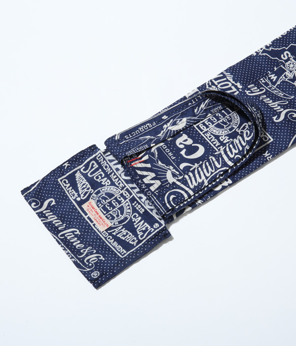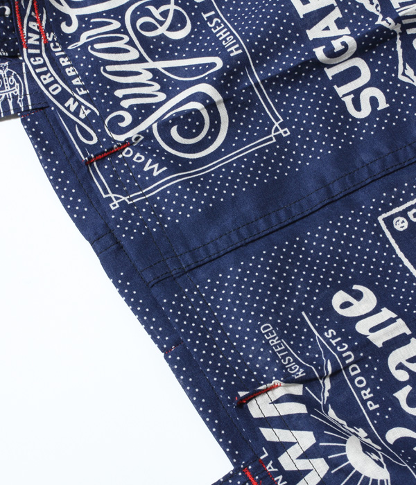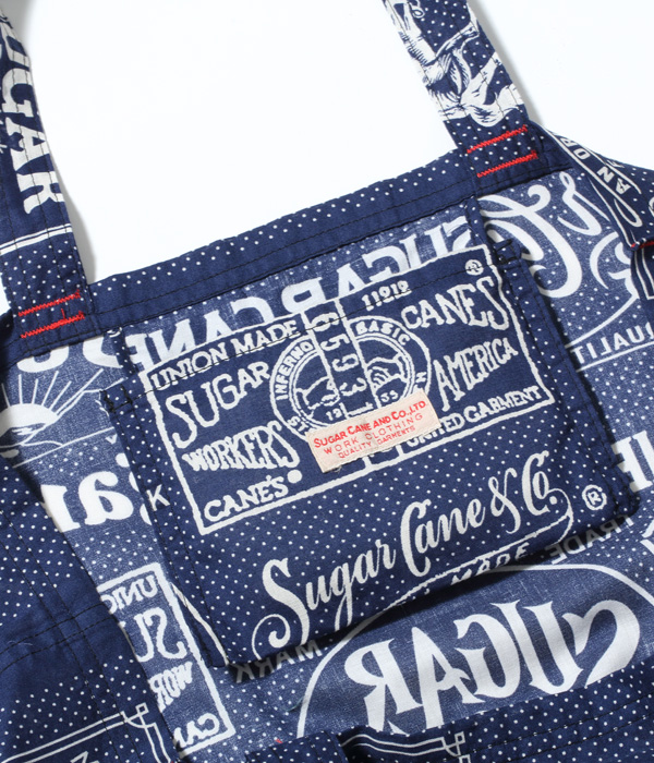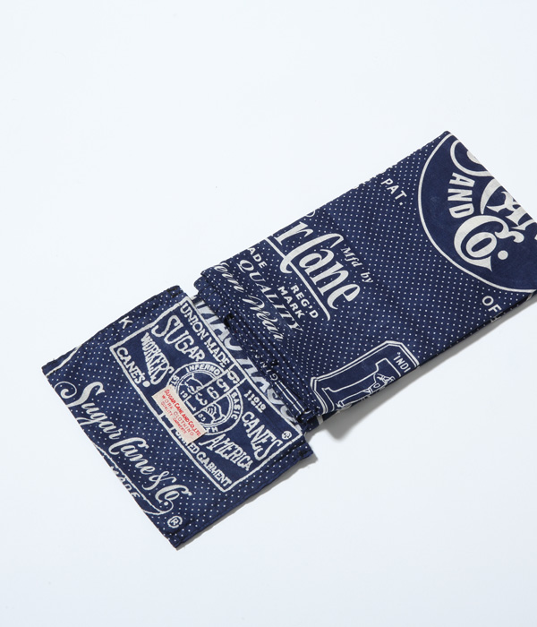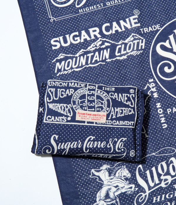 シュガーケーンのブランドロゴをコラージュしてプリントした非売品のバンダナを3枚使った贅沢な作りとなっており、内ポケットを利用してコンパクトにたたむことでジーンズのポケットに入れて持ち運びできる仕様とした。またバンダナ生地を使用しているので約60gと軽量なうえ、汚れても水洗いすればすぐに乾き、使い勝手が良い。