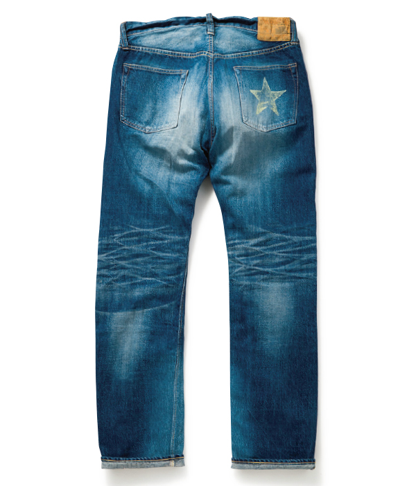 1950年代のヴィンテージのディテールを踏襲し、シルエットに改良を加えたロンスター(エイジング加工デニムシリーズ)のスリムフィット。 この「10 YEAR AGED」は長年の着用によるダメージを想定し、腿から膝にかけ裏当てを使って広範囲のリペアを施している。