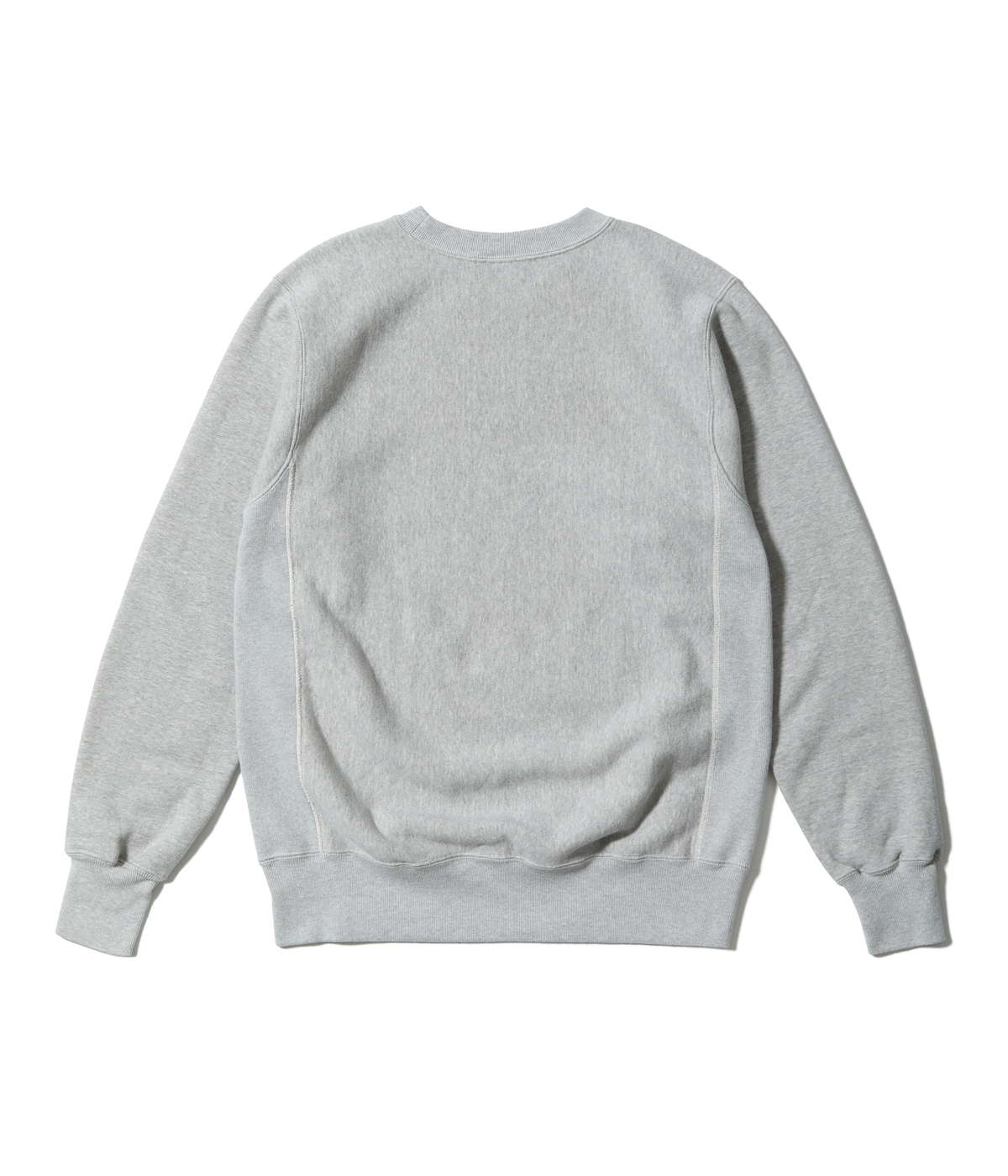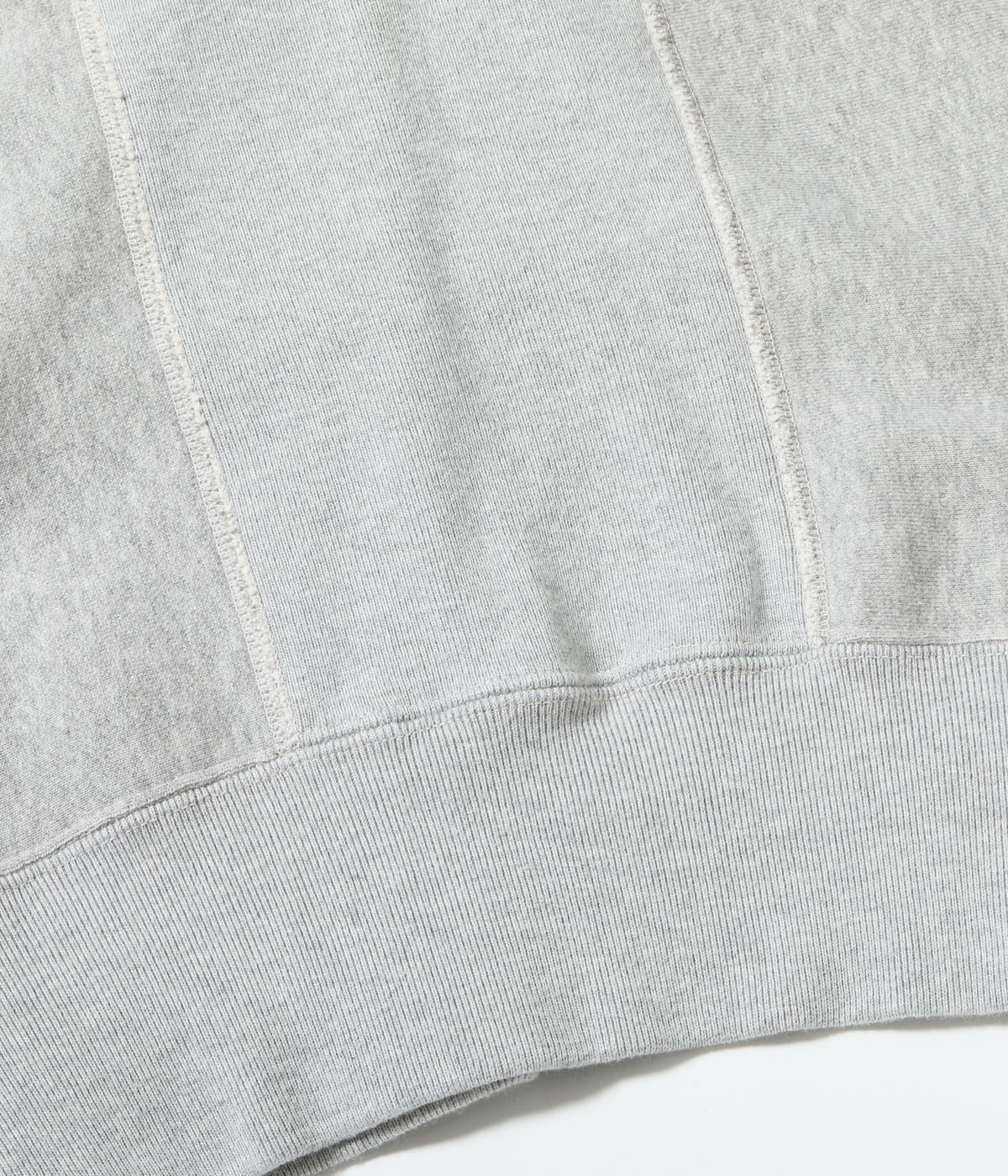 陸軍竸技協会とプリントされたスウェットシャツ。こちらは身頃の生地を横使いし、サイドにリブ素材と切り替えたホリゾンタル・ニッティングで、ホリゾンタルとは「横方向」という意味を持つ。丈の縮みを防止すると共に、脇に縦方向のパネルを使い、縦横の伸縮性を意識した仕様。継ぎ目がない肩は着用している時にストレスが掛かることなくスムースな着心地を誇るが、裁断時において広い作業スペースが必要で、ネック部分をくり抜くなど大掛かりな作業となる。